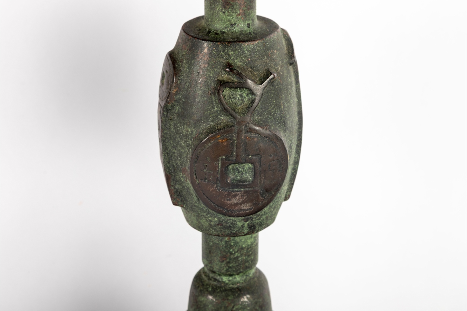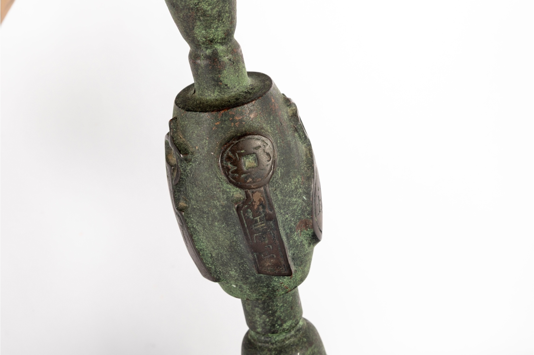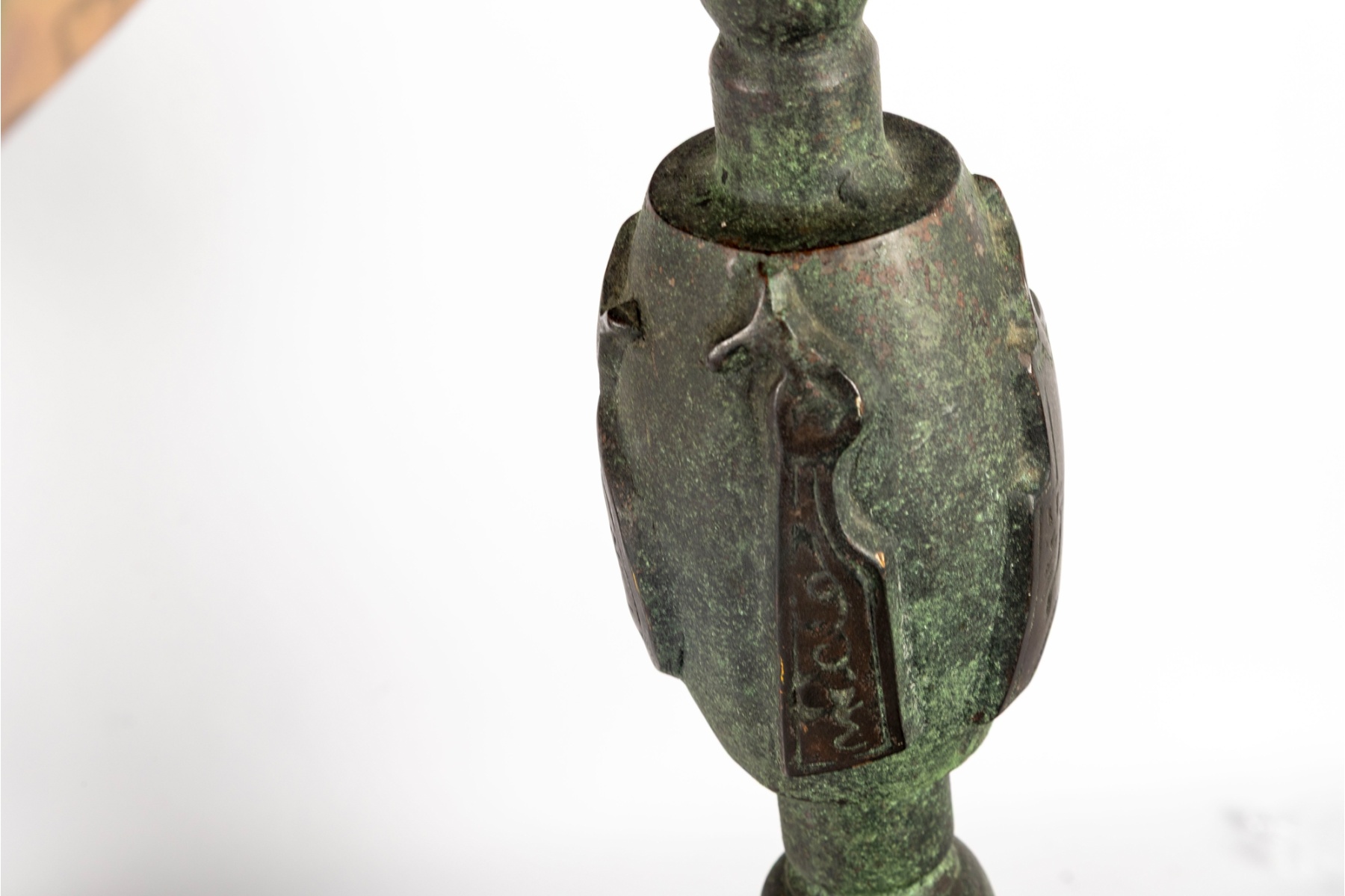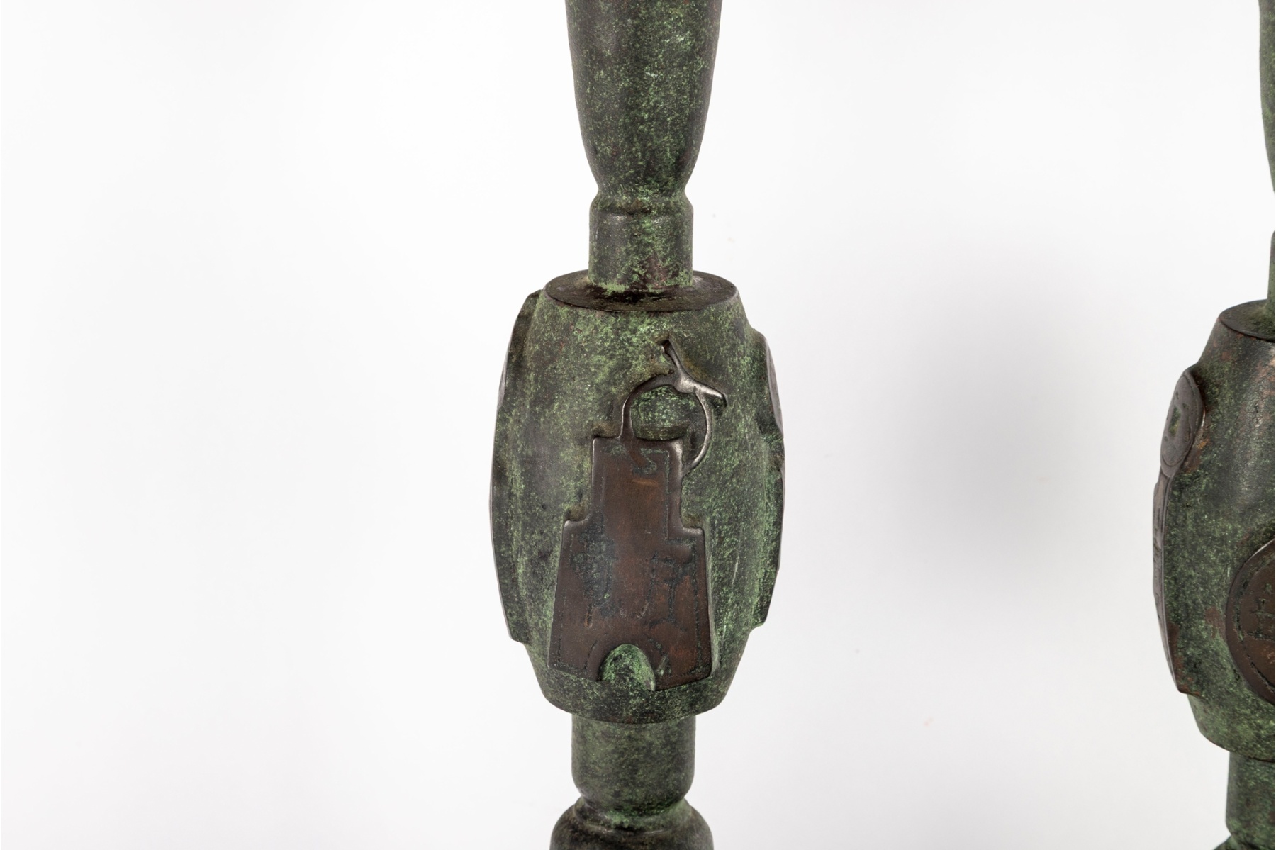 Pair of heavy metal table lamps in an aged verdigris finish, each featuring cast relief designs inspired by ancient Chinese motifs, including stylized coin and key patterns. The bodies are mounted on circular wooden bases with brass harp fittings and finials.