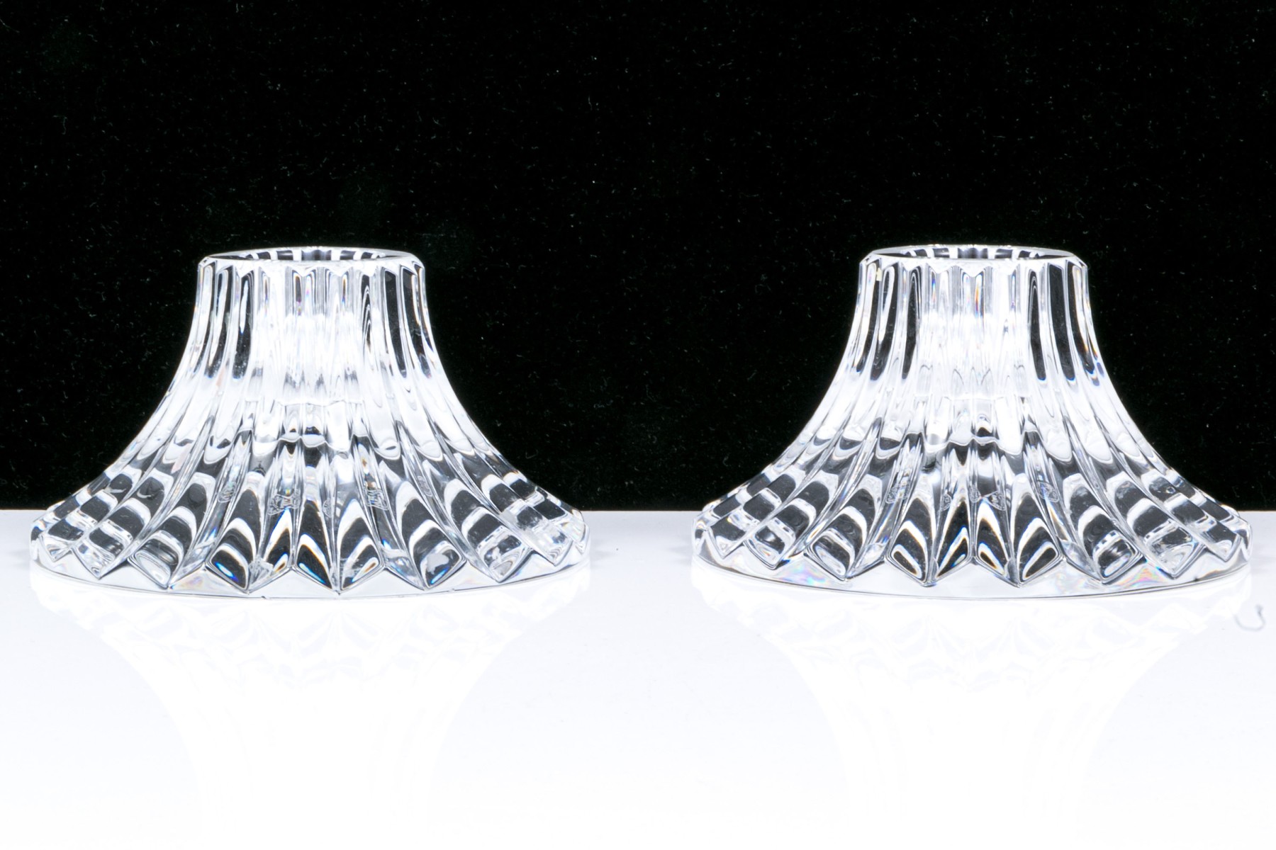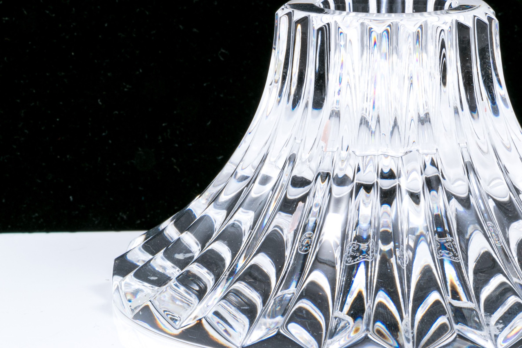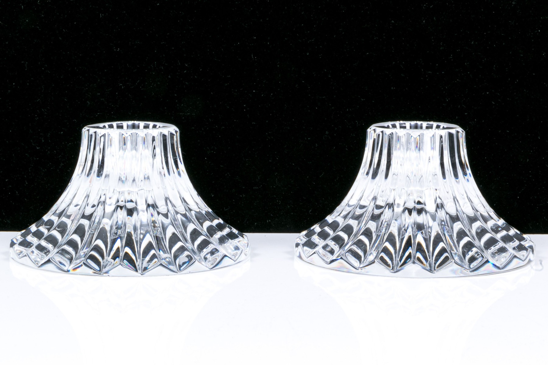 A pair of Baccarat crystal glass candle sticks with a tapered and ridged design.