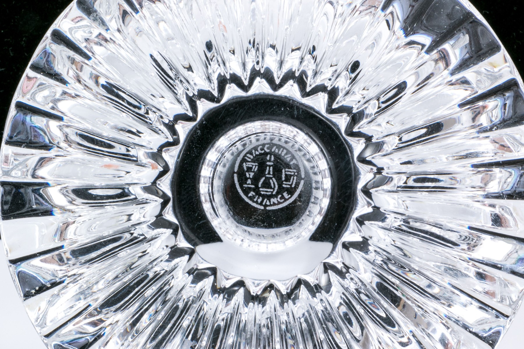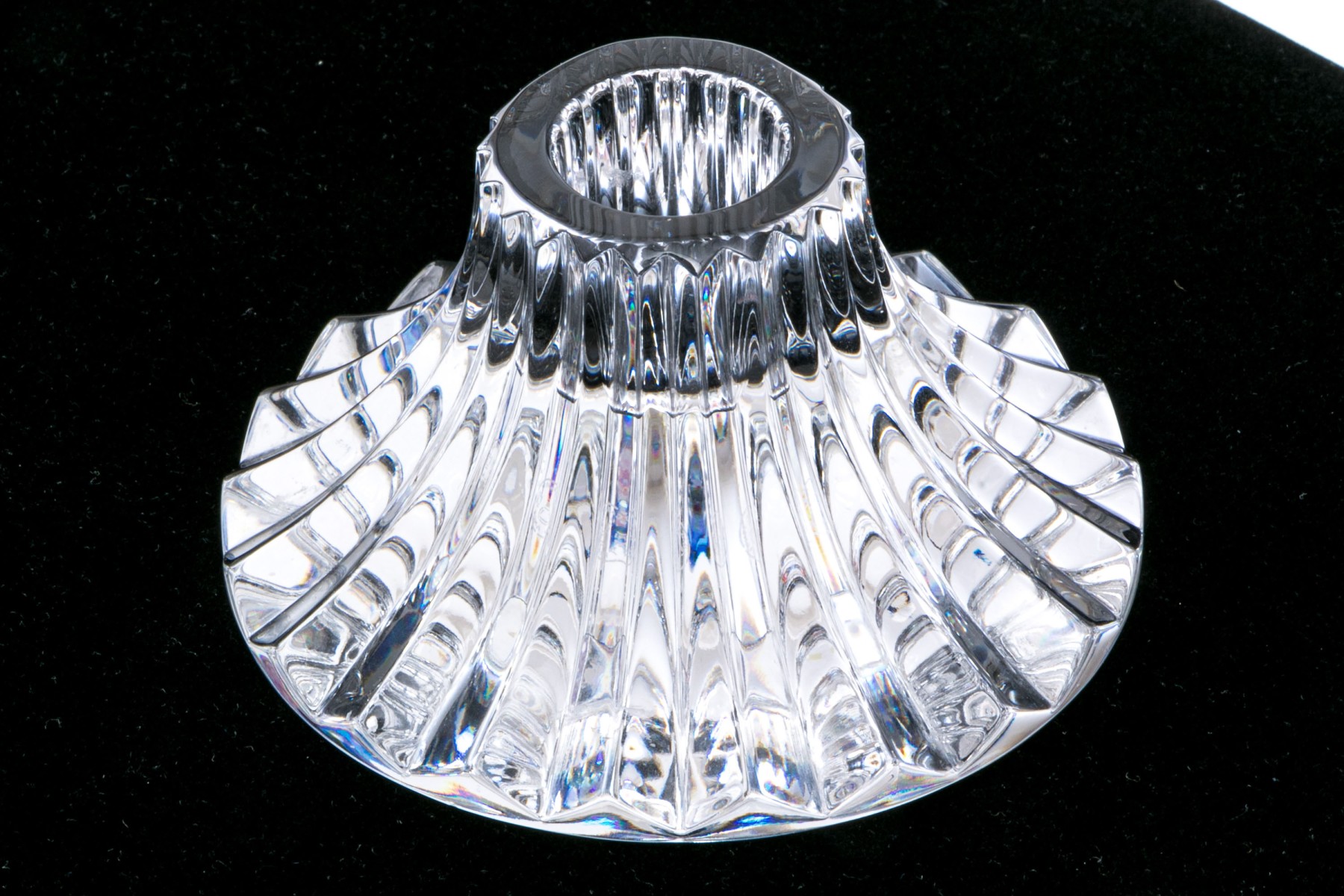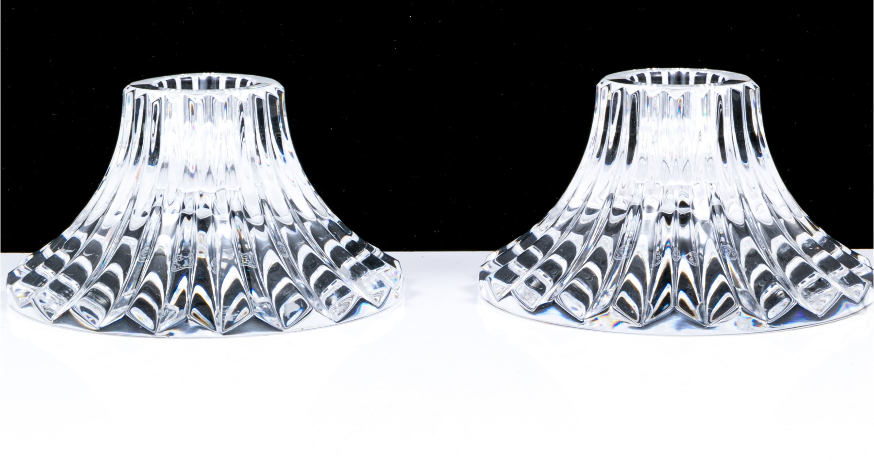 A pair of Baccarat crystal glass candle sticks with a tapered and ridged design.