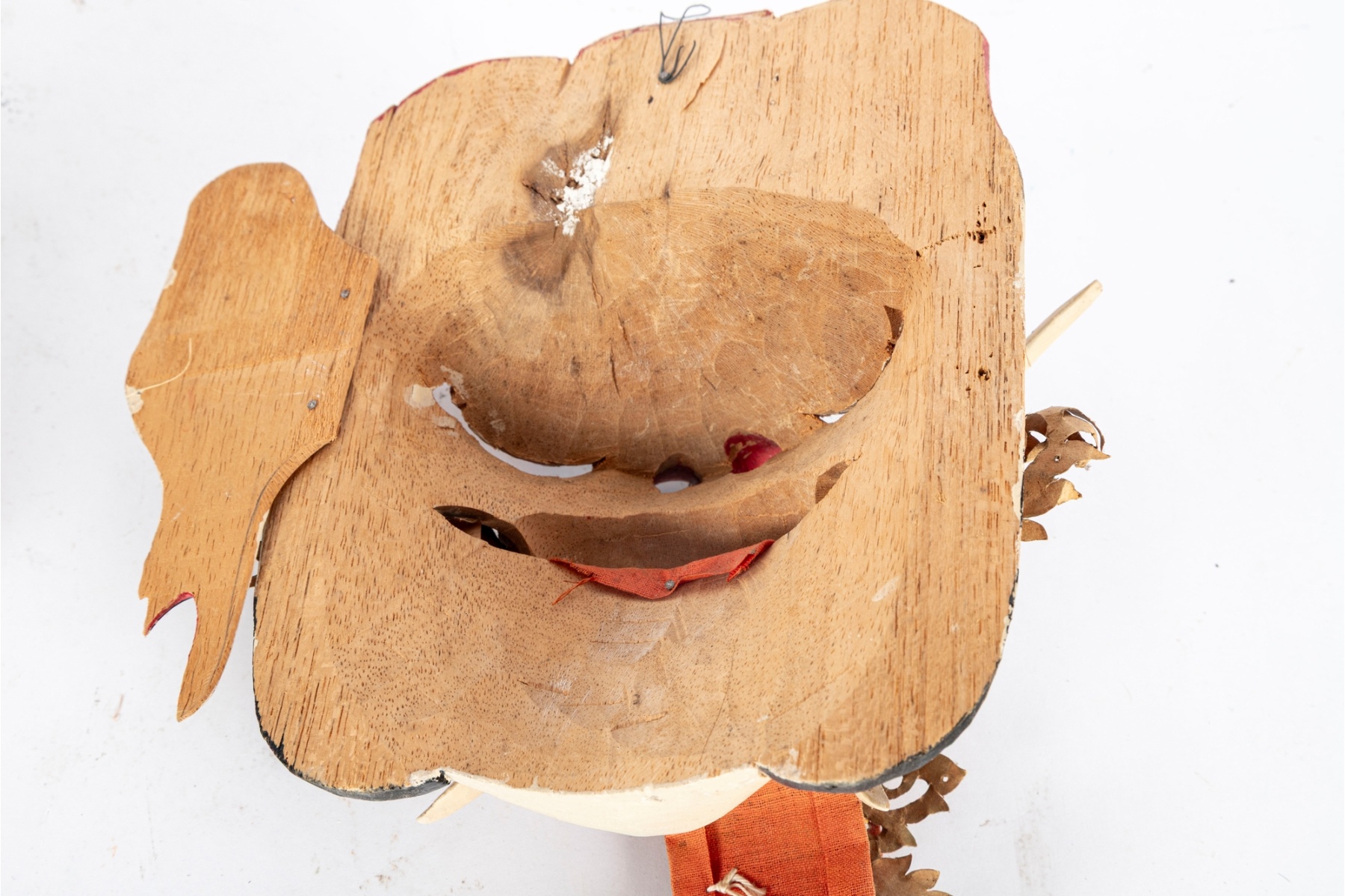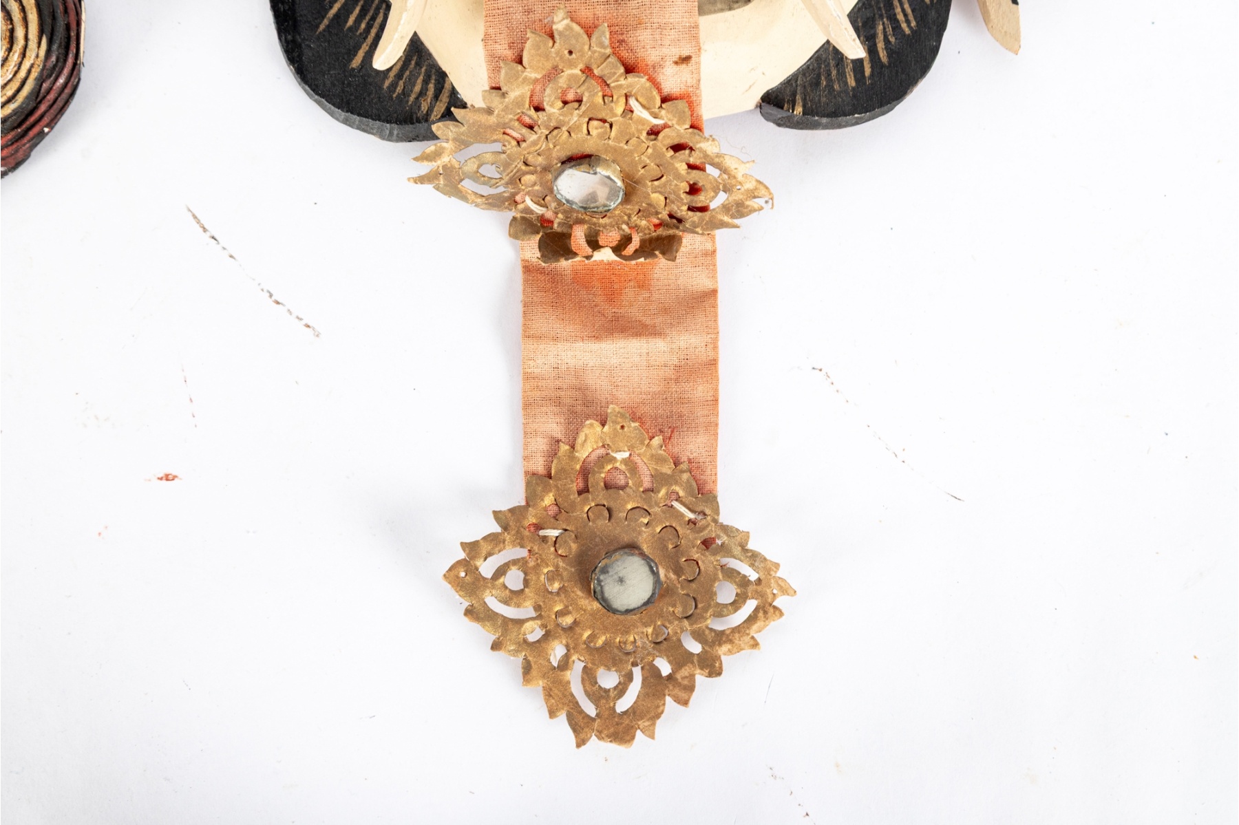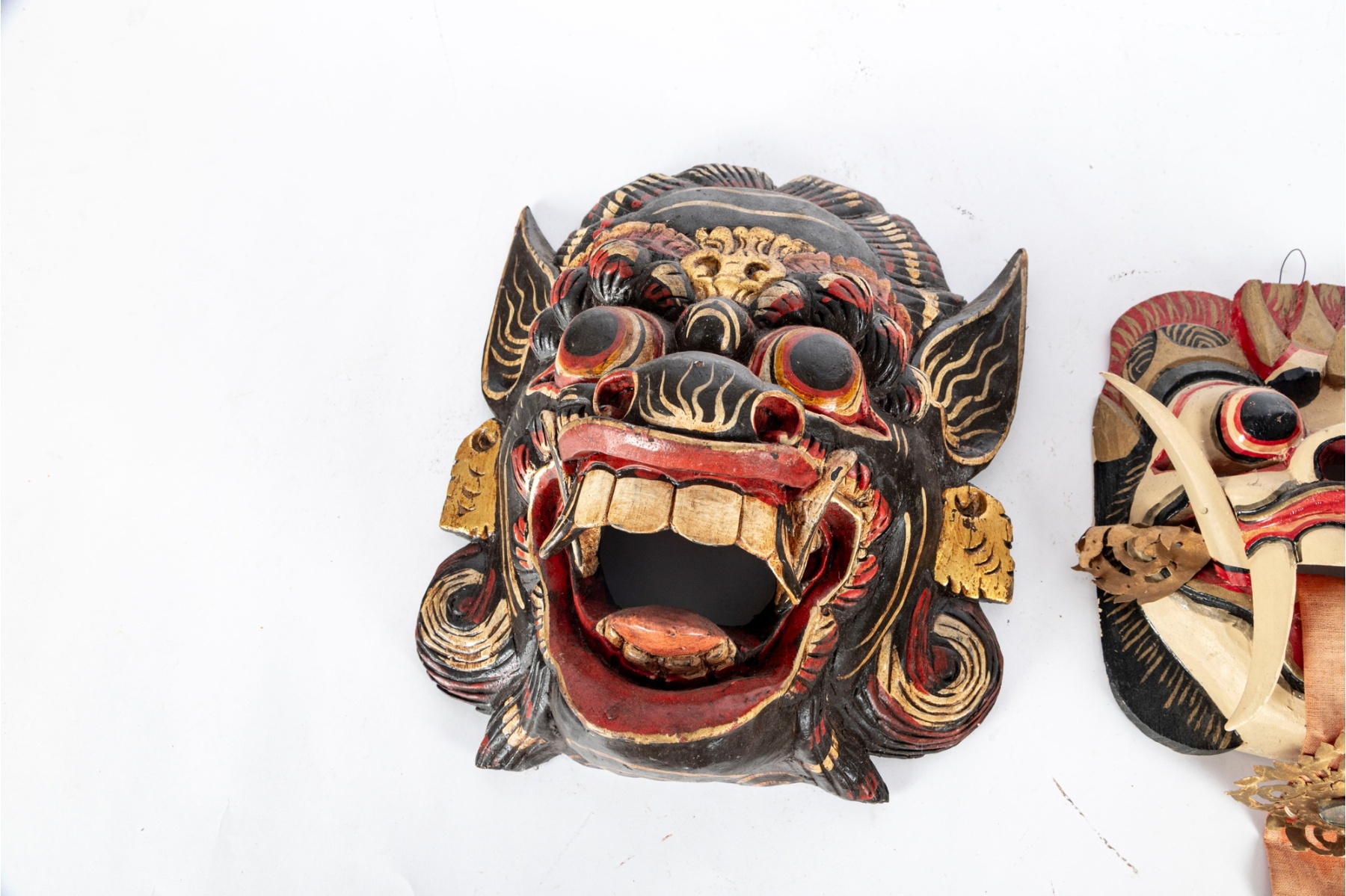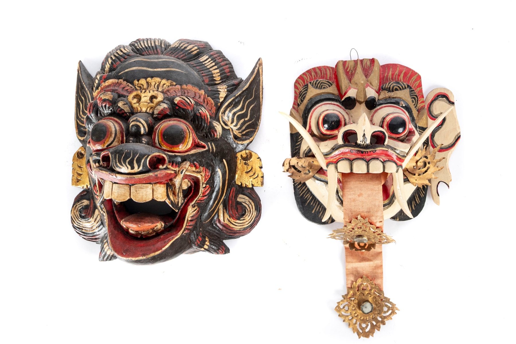 Two Balinese carved and painted wood masks depicting Barong, the lion-like guardian spirit of Balinese mythology. Each features bold polychrome decoration, protruding tusks, and expressive detailing. Traditionally used in ceremonial dance and theater.