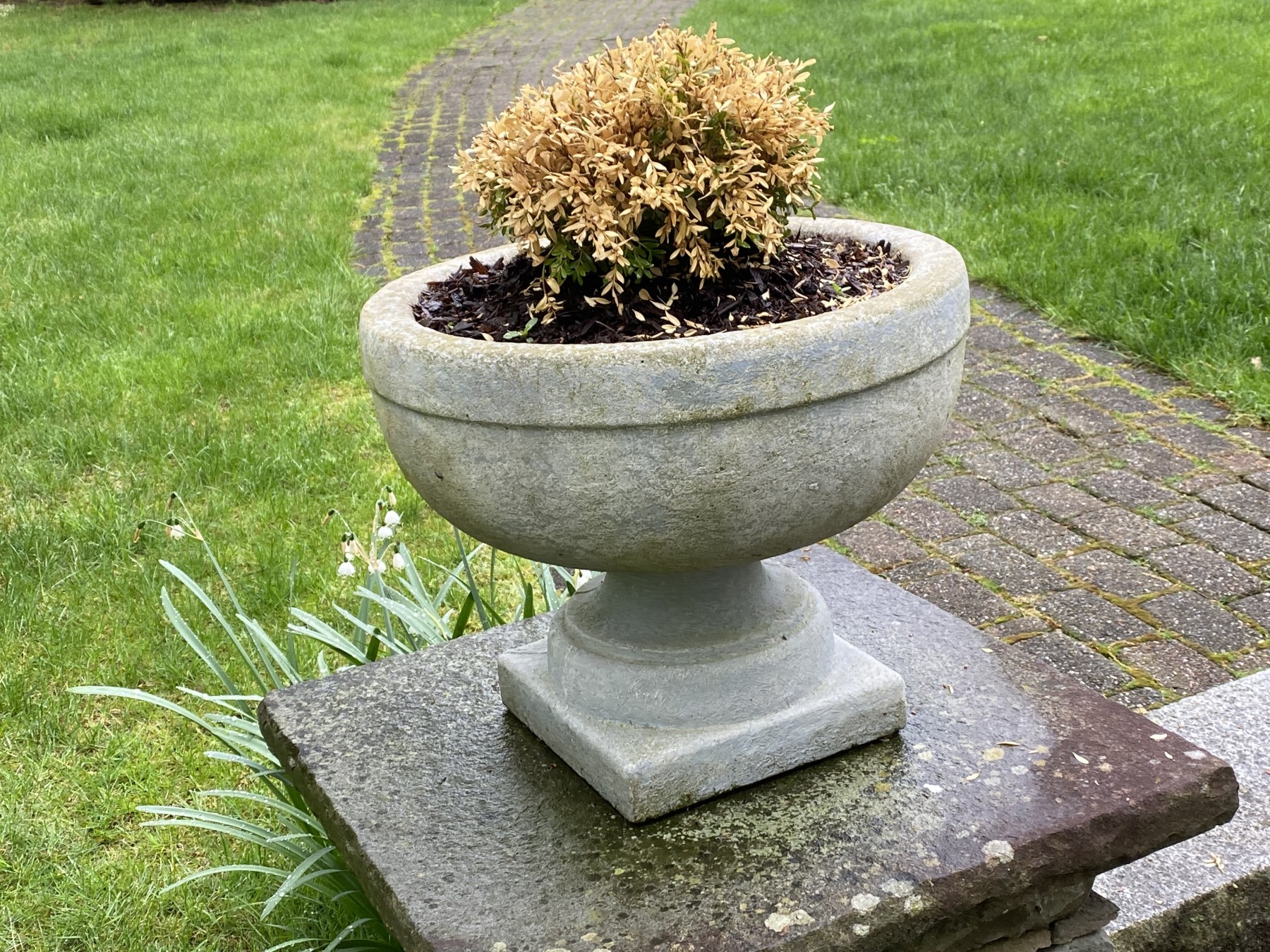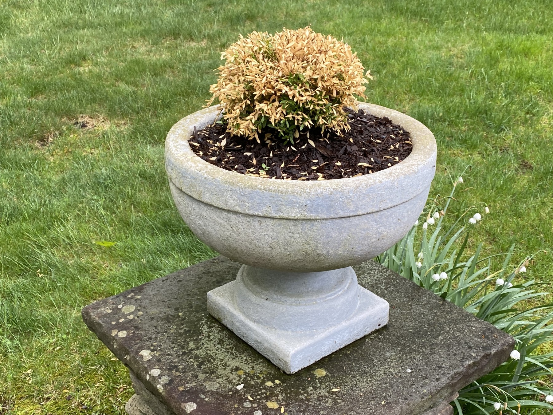 A beautiful pair of garden planters showcasing wide bowls over pedestal bases on square feet.