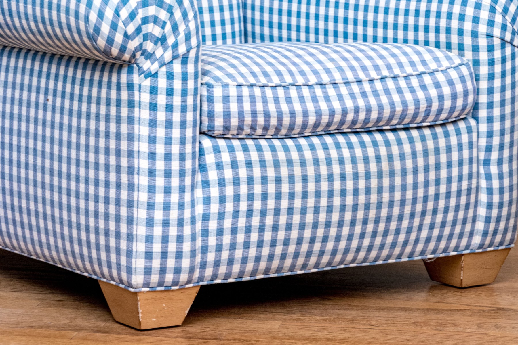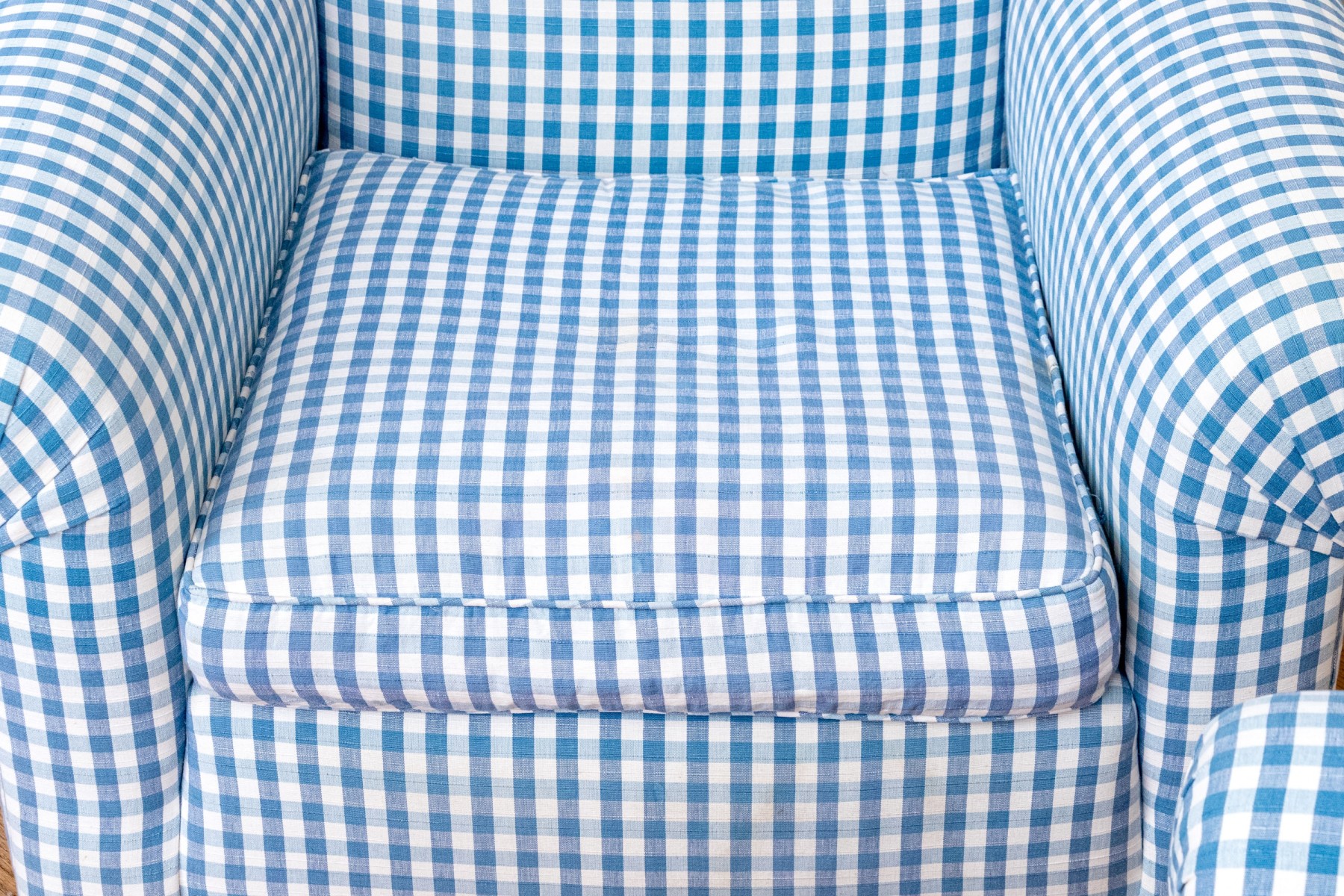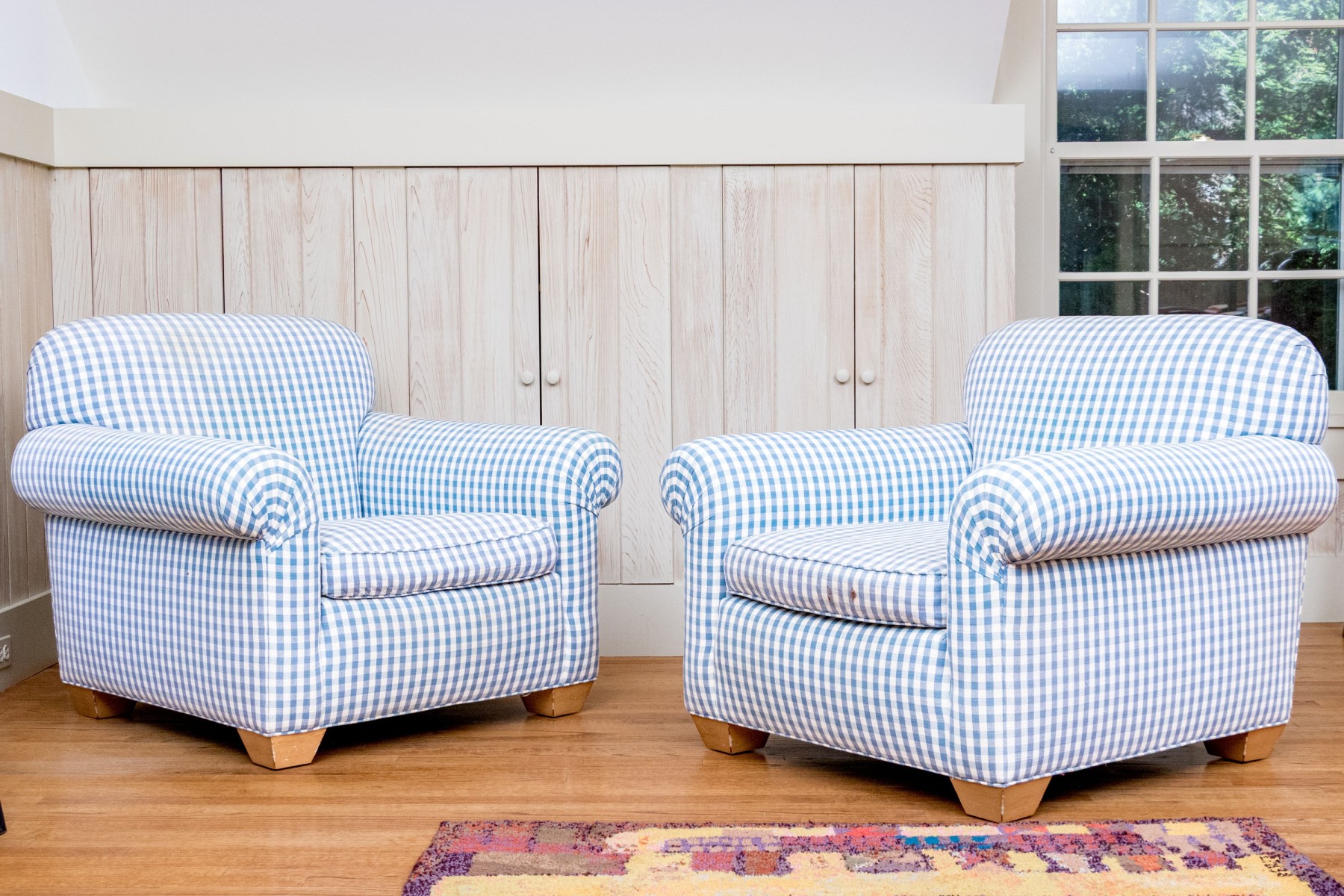 A cottage chic pair of Beverly club chairs with classic designs showcasing gently rounded backs, rolled arm, and deep-set seats with loose cushions over tall aprons. Upholstered in wonderful blue and white gingham and raised over honeyed brown tapered square feet.