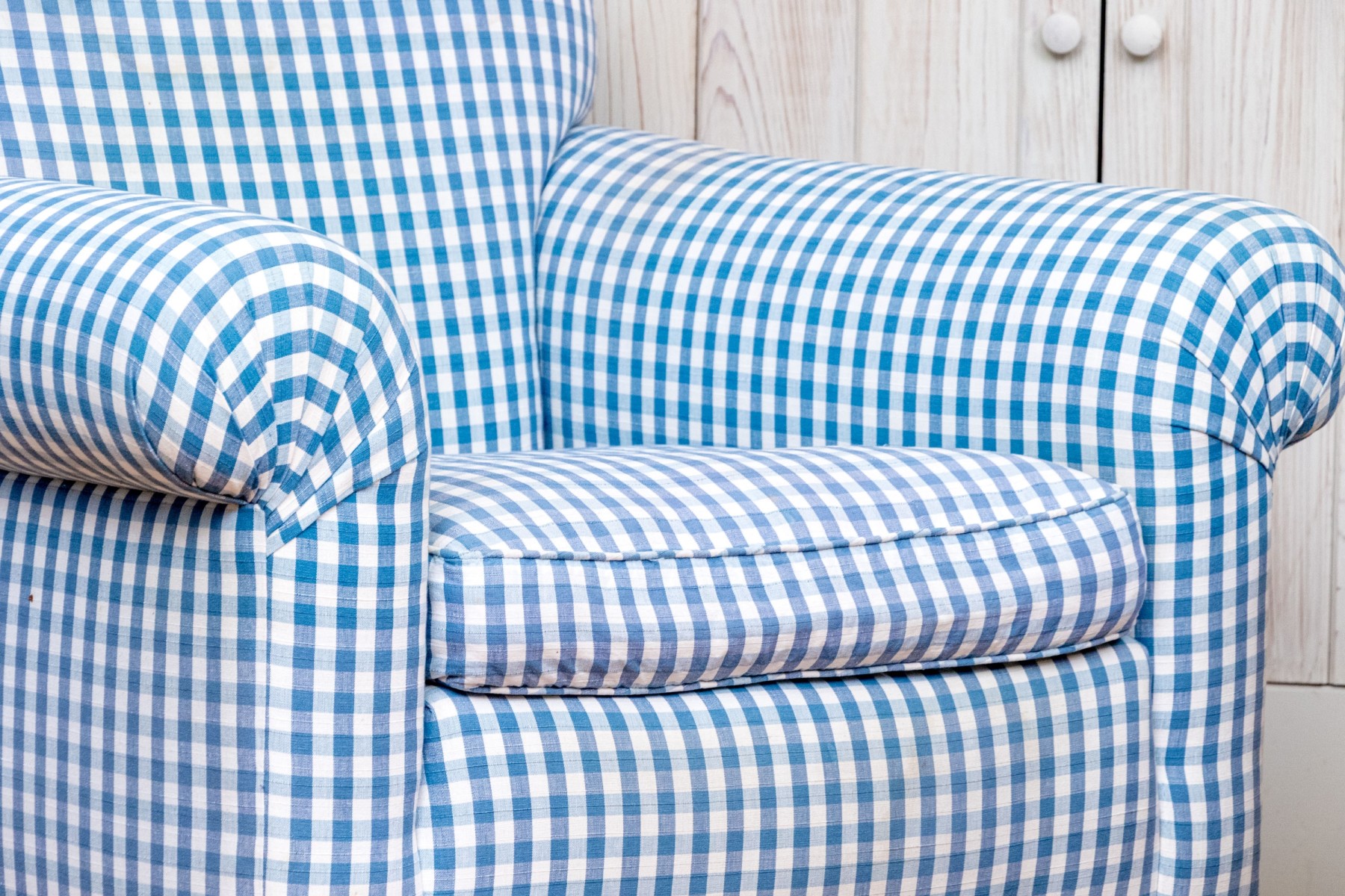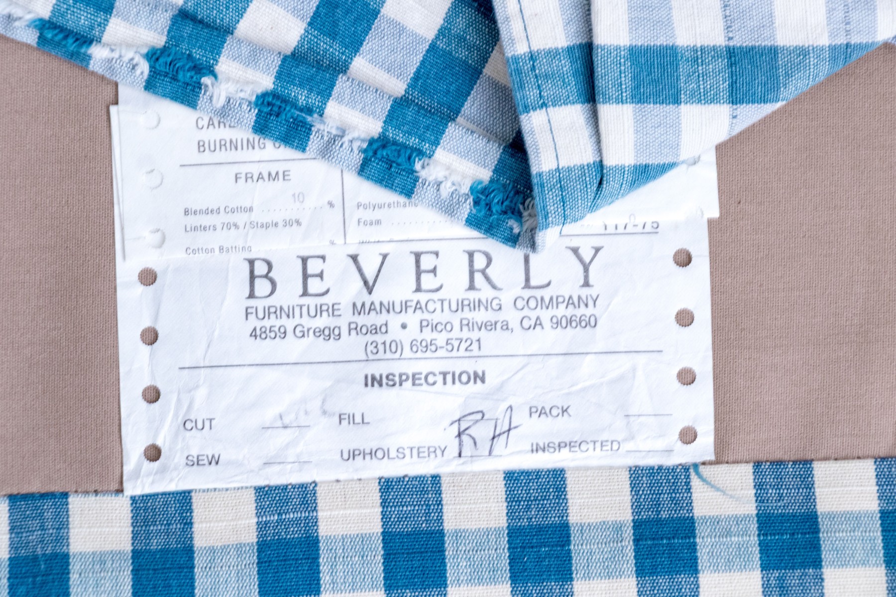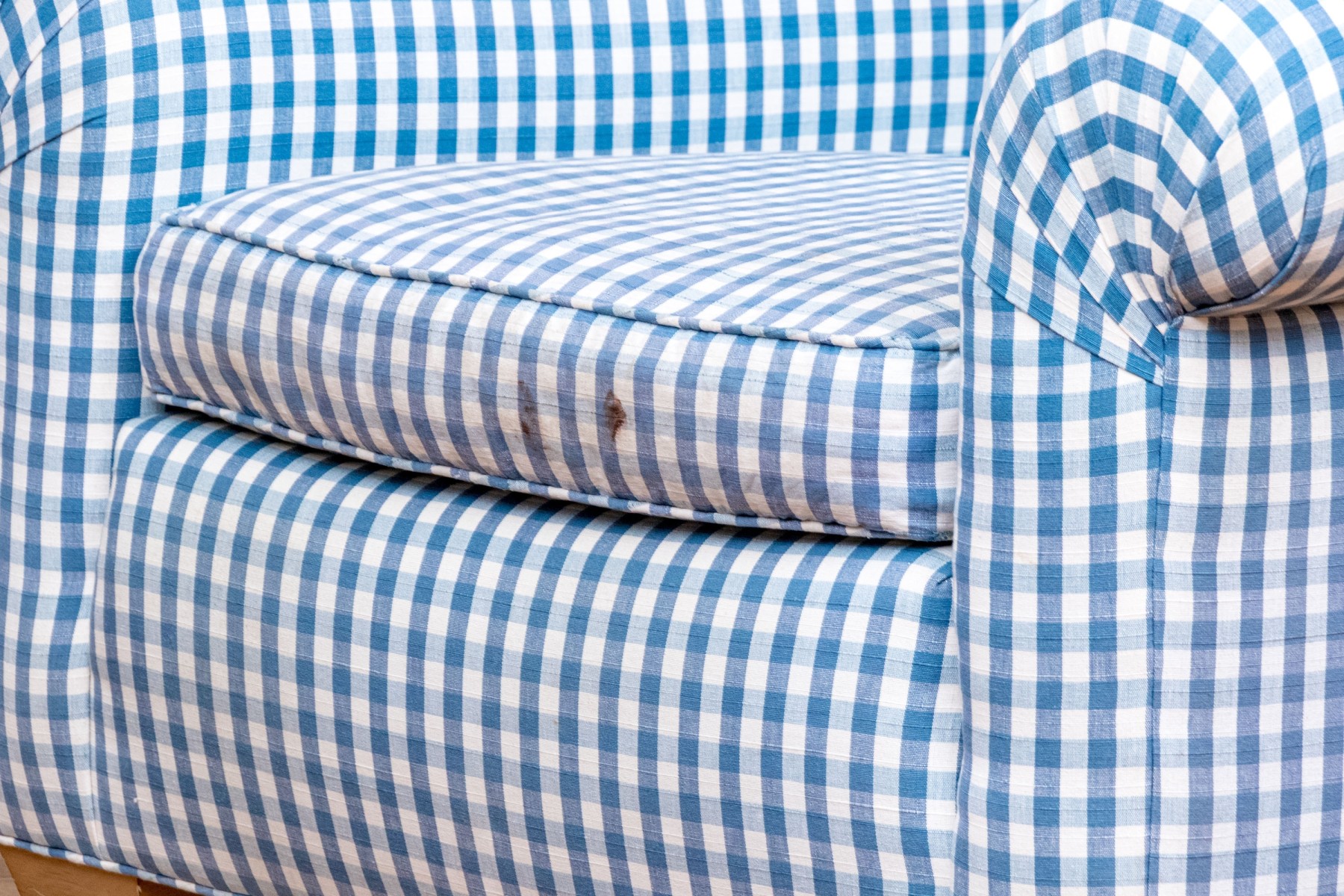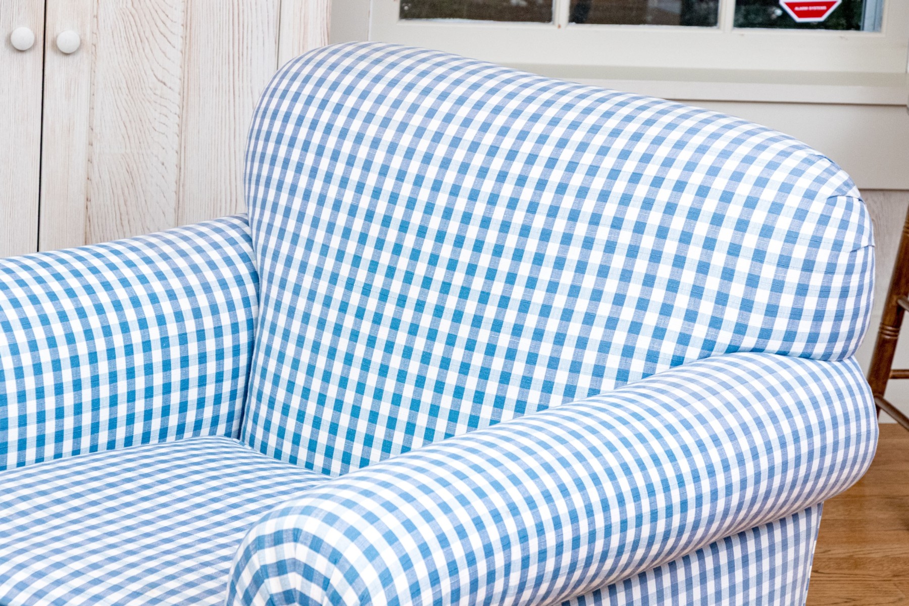 A cottage chic pair of Beverly club chairs with classic designs showcasing gently rounded backs, rolled arm, and deep-set seats with loose cushions over tall aprons. Upholstered in wonderful blue and white gingham and raised over honeyed brown tapered square feet.