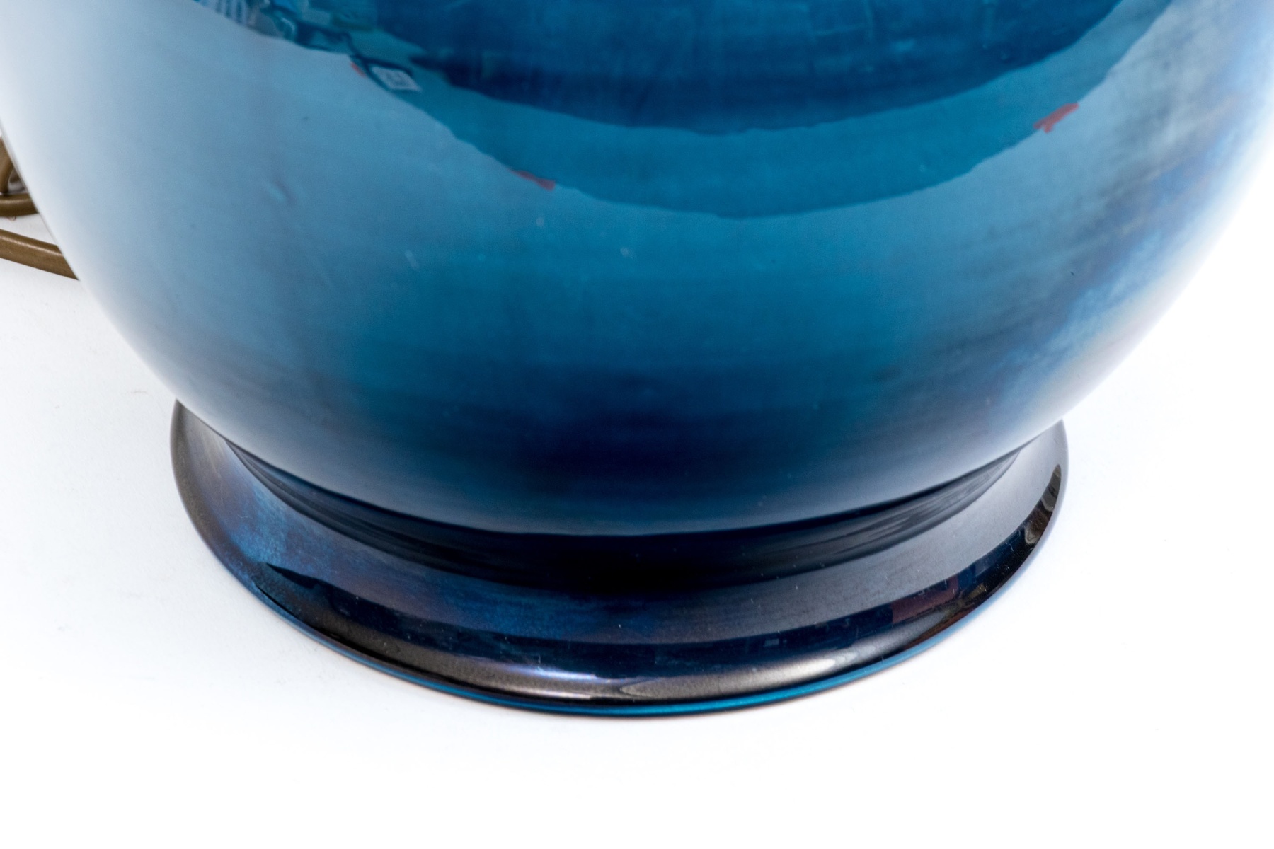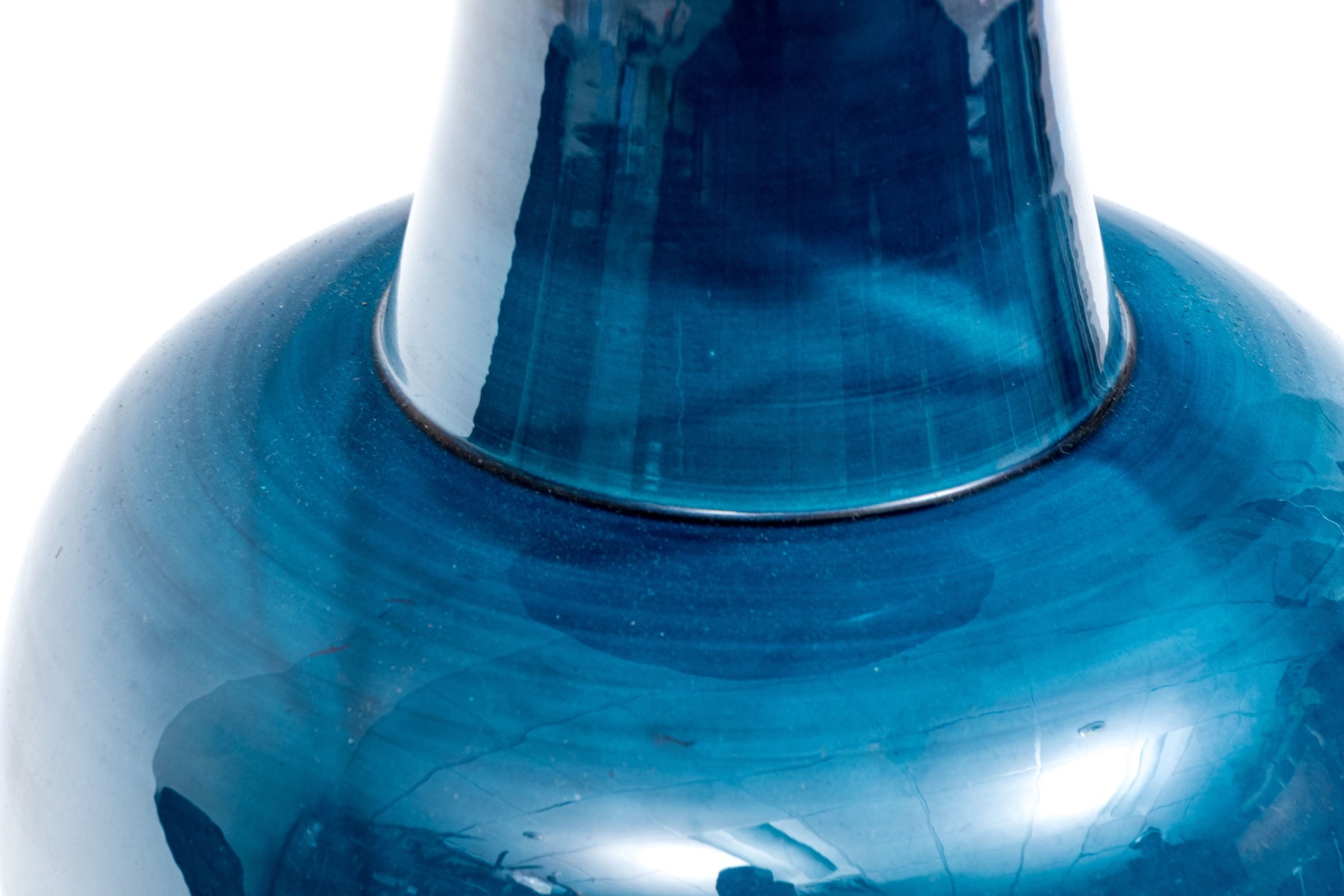 A stylish pair of blue glazed vase form table lamps. Each hollow without bases and with pierced holes through the foot for the wire. Each in bottle form with shades.