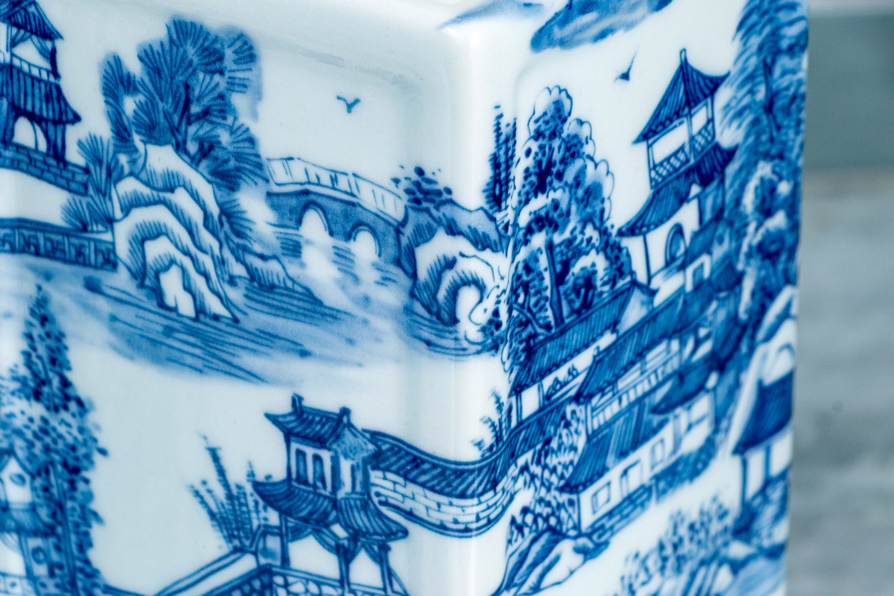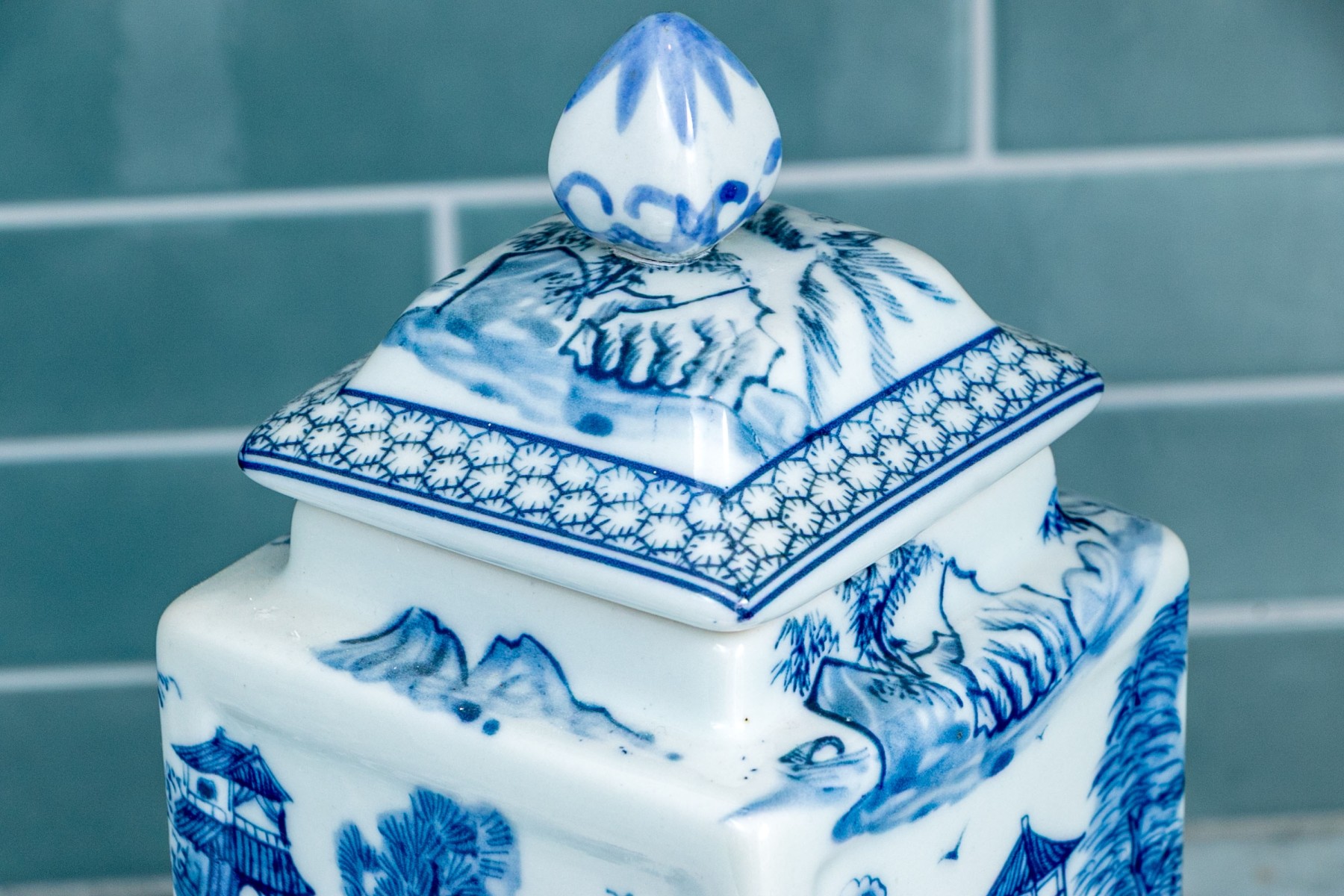 A gorgeous pair of porcelain ginger jars in square form, beautifully designed with pointed finials on domed square lids. The bodies are decorated with classic blue and white scenes of Asian architecture within natural landscapes detailed with bridges over calm water and lush trees around rockery.