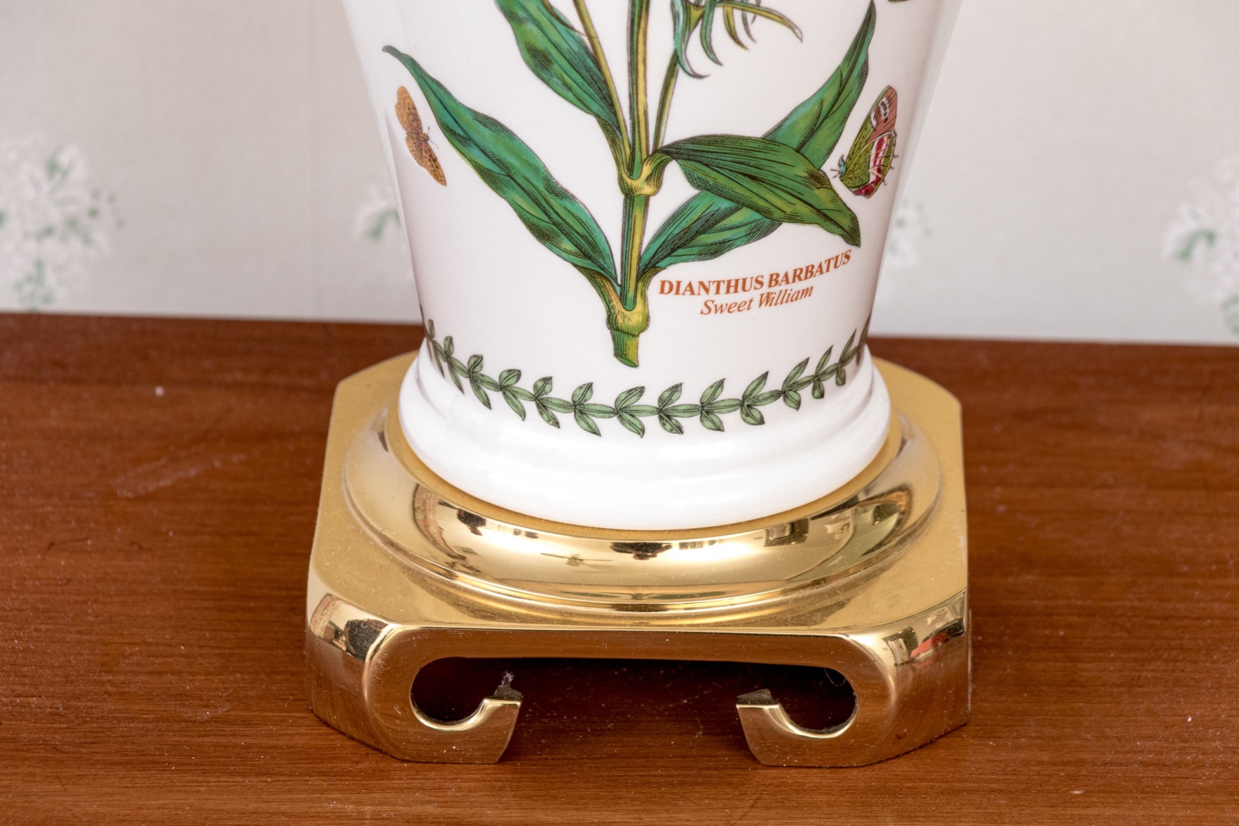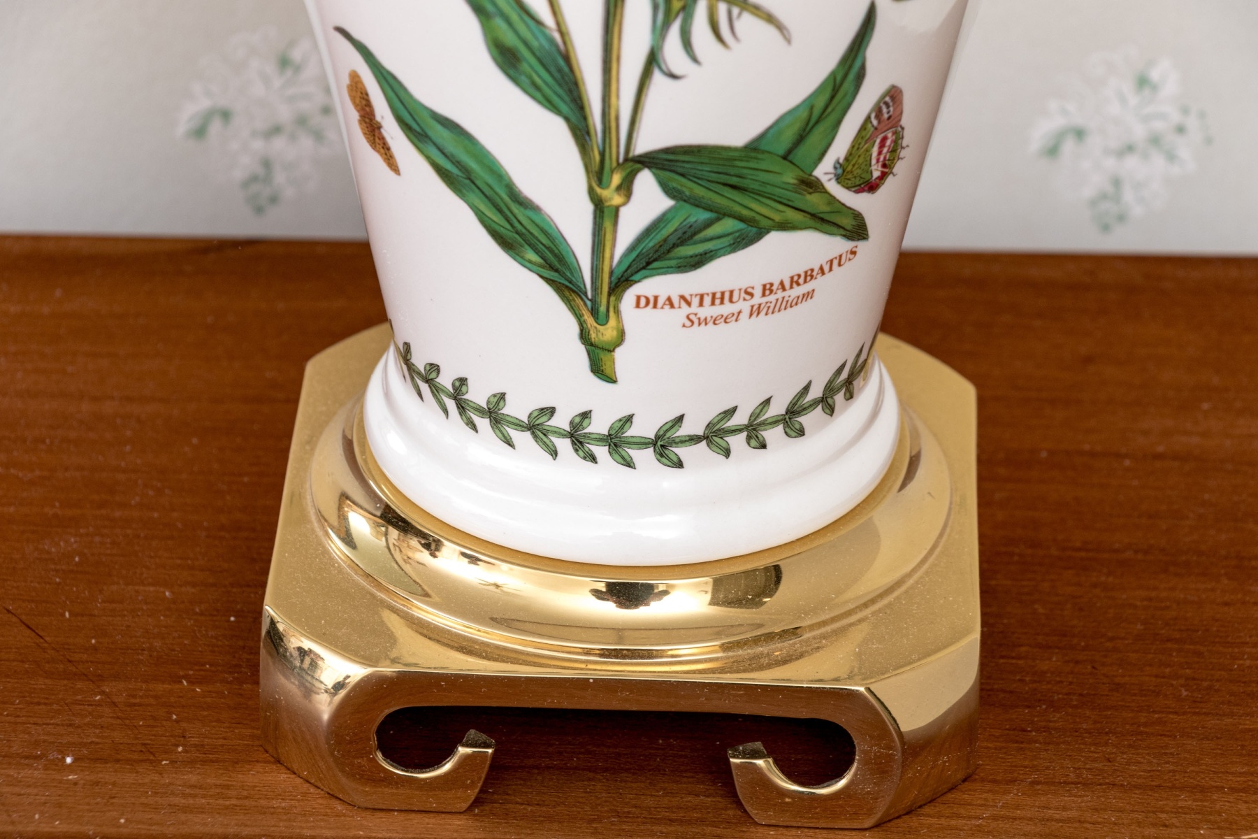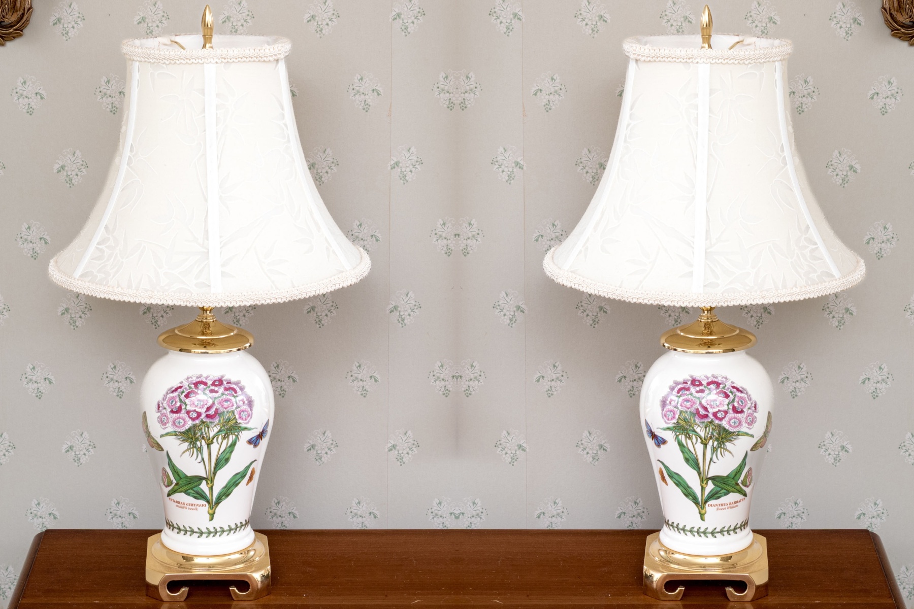 Each lamp mounted on decorative brass footed stands. The porcelain vaseform bodies decorated with floral motifs in polychrome colors. Both lamps come with shade with brass spade form finials.