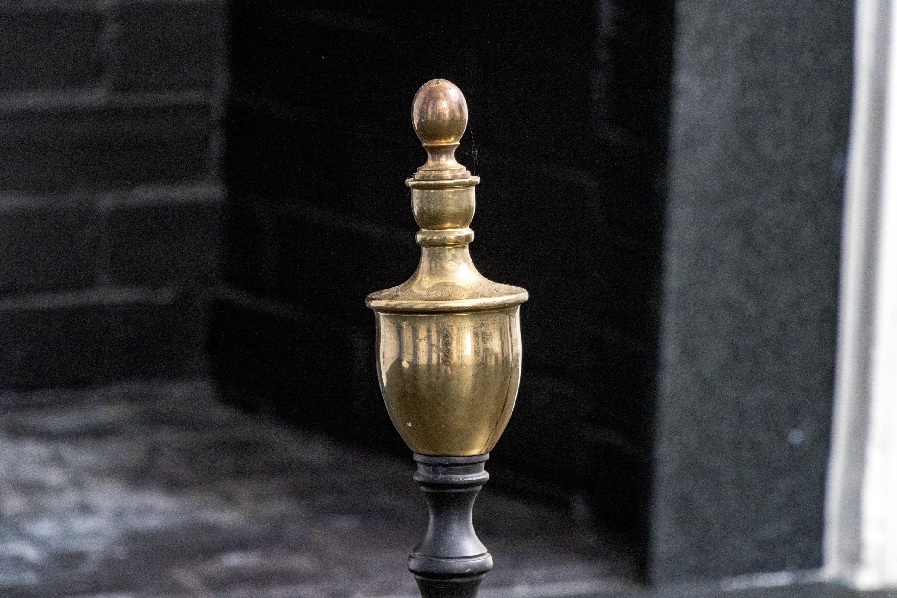 Both on two cabriole legs with baluster form pedestals with brass lidded urn form finials with ball form finals to the lids.