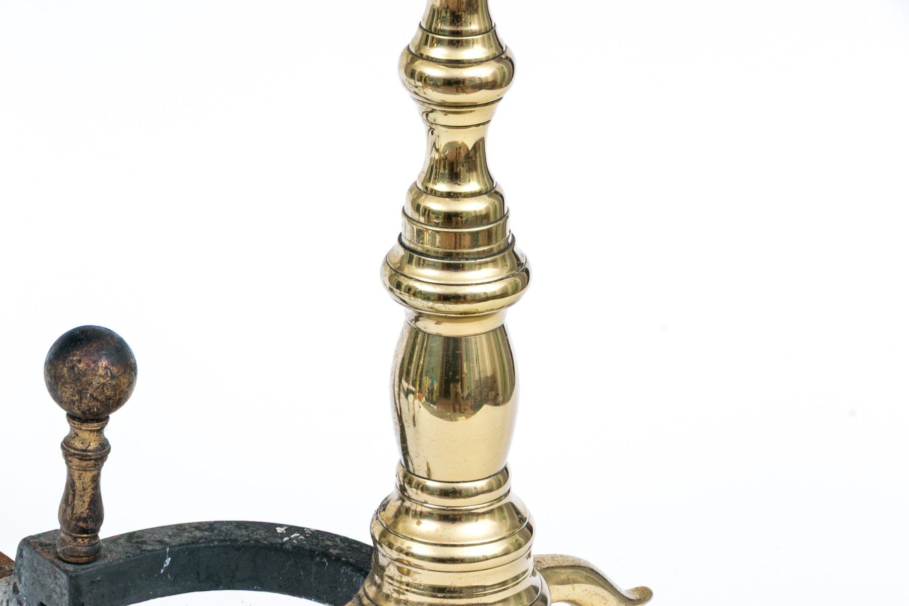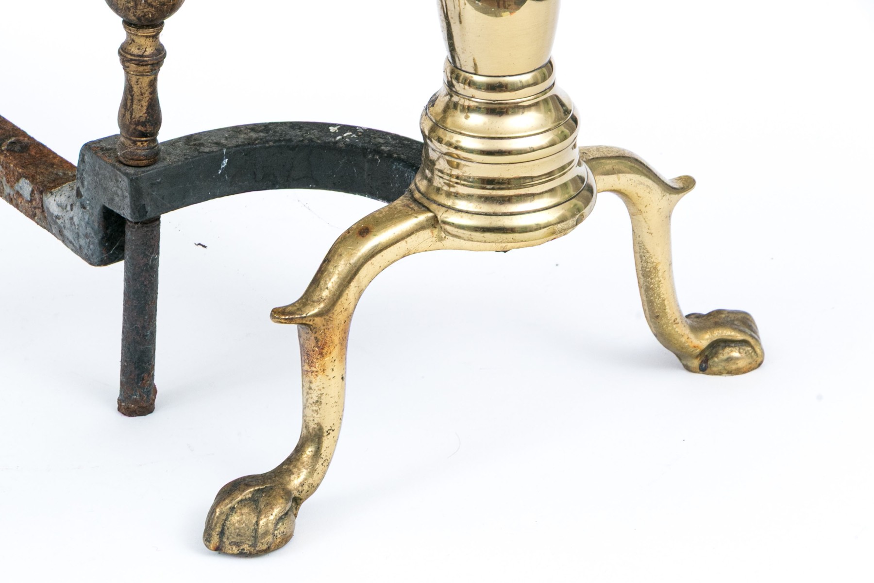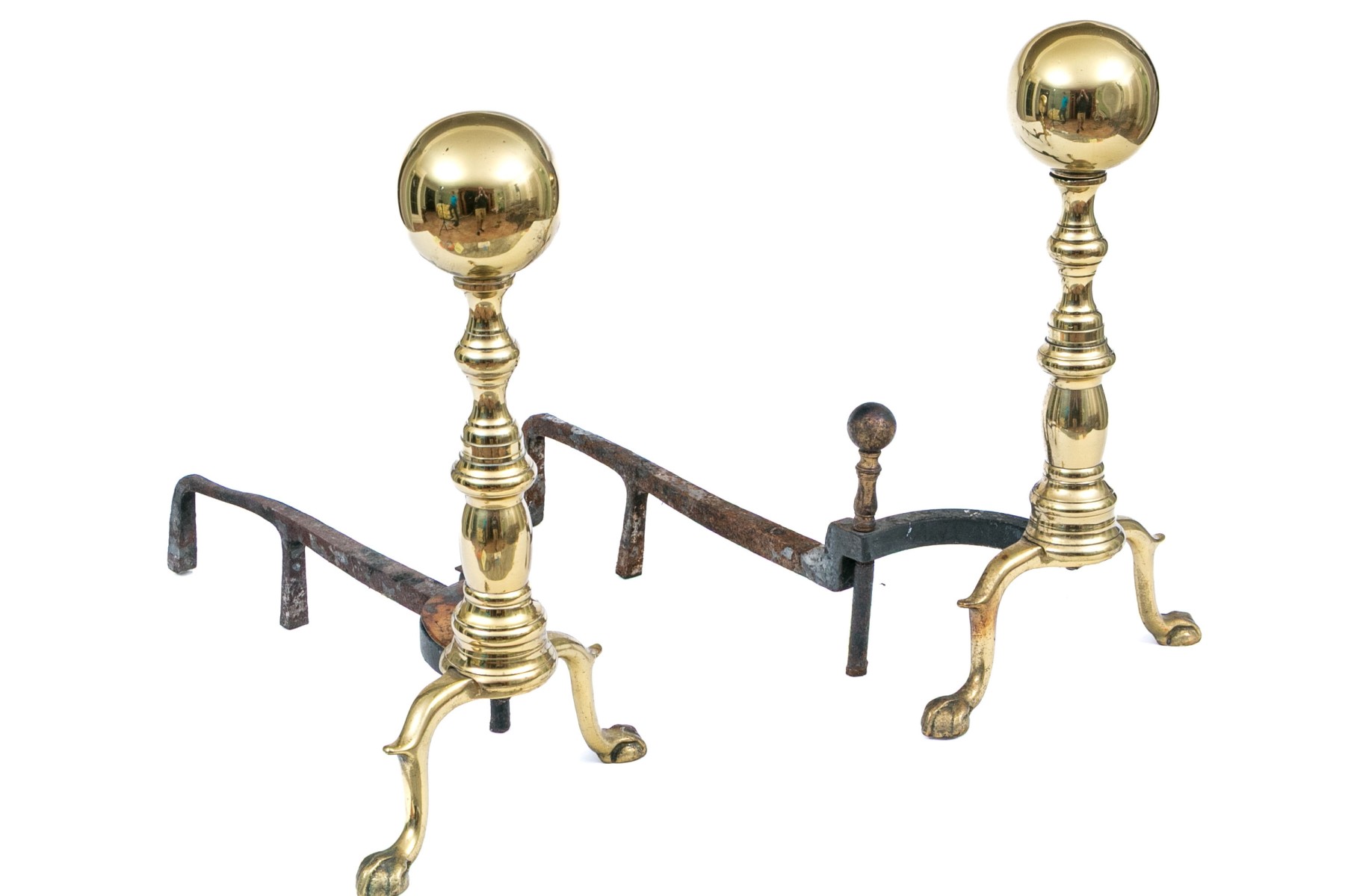 A classic pair of brass andirons with cannonball finials on nicely turned columns leading down to cabriole legs on ball and claw feet. With iron billet bars.