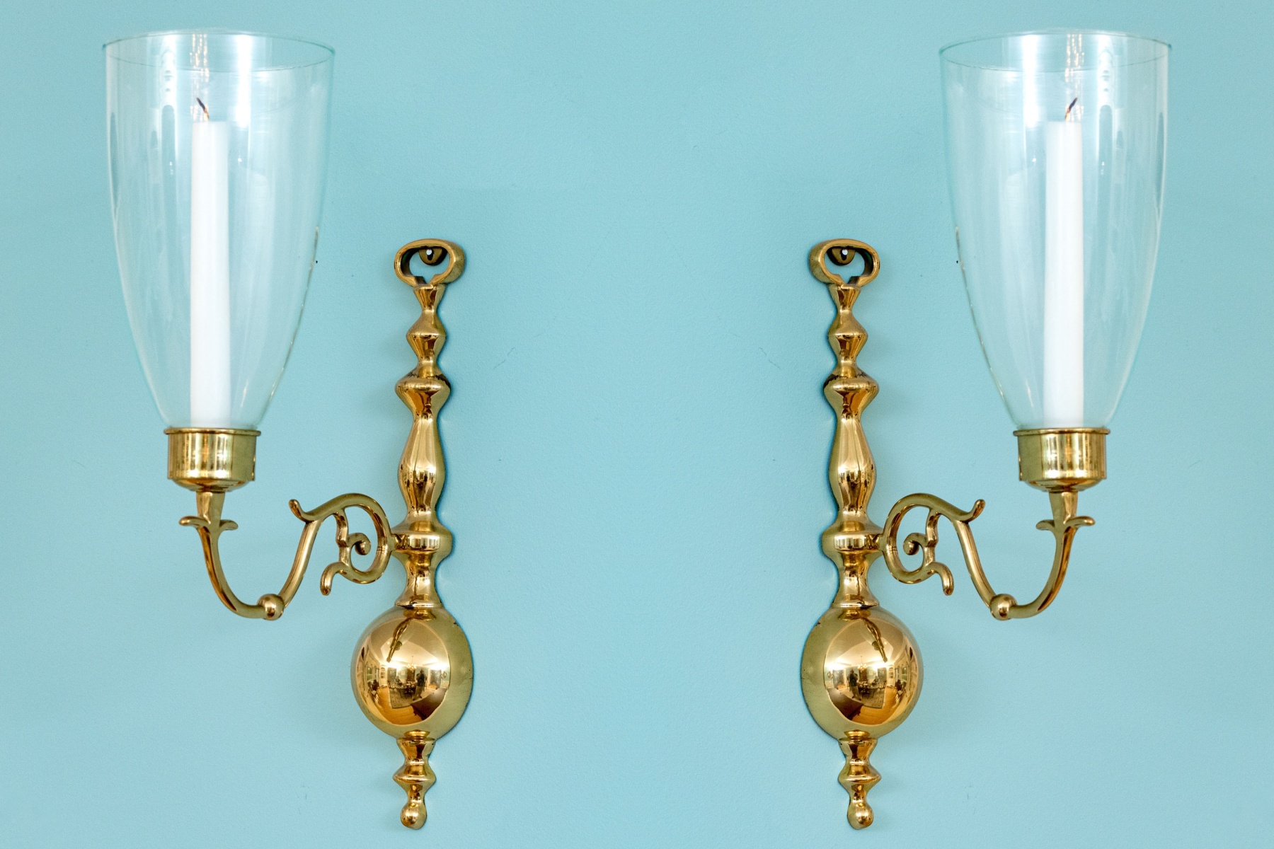 An elegant pair of candle sconces with cannonball bases and brass shafts supporting single scrolled arms with nozzles for candles, finished with glass fitted shades.