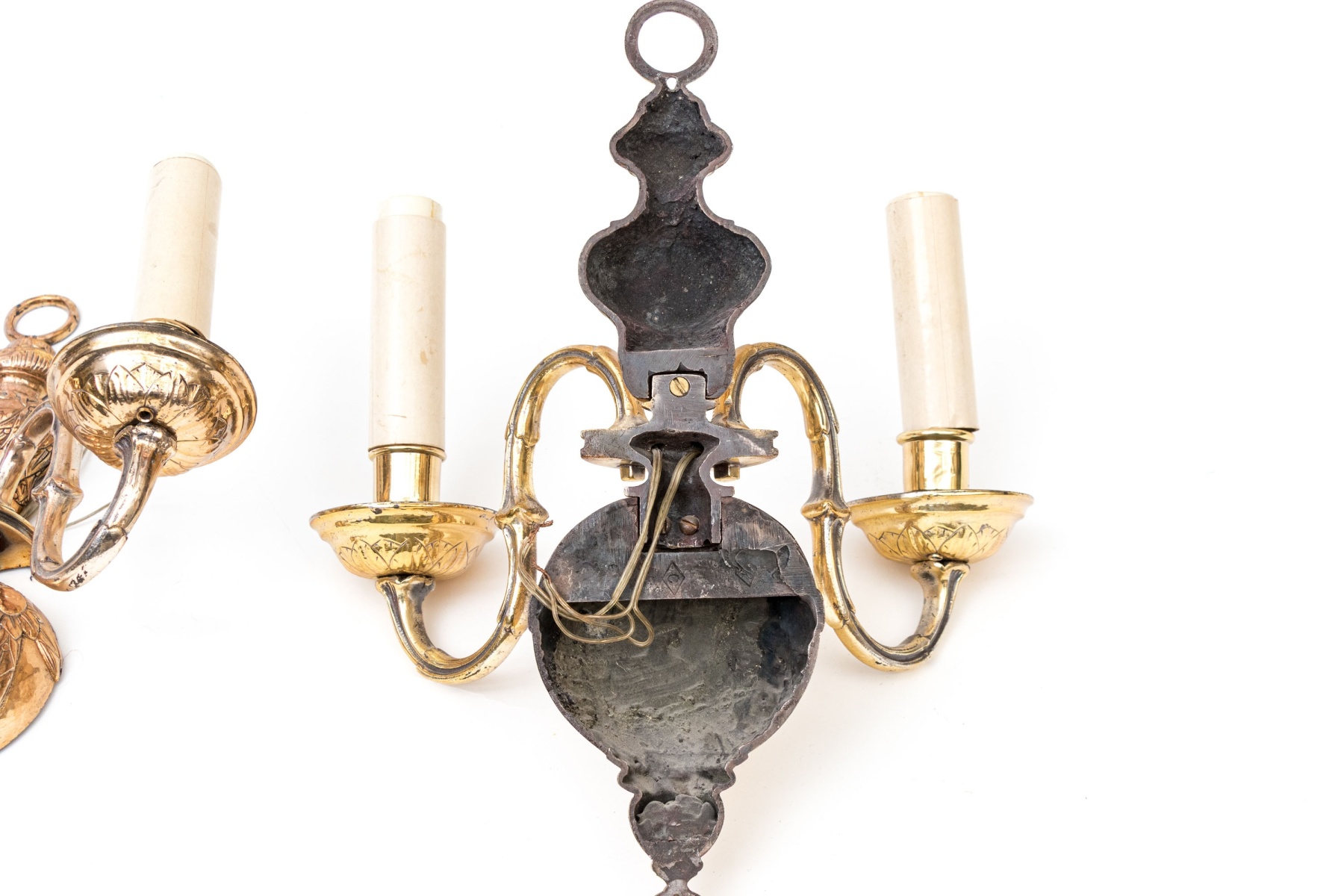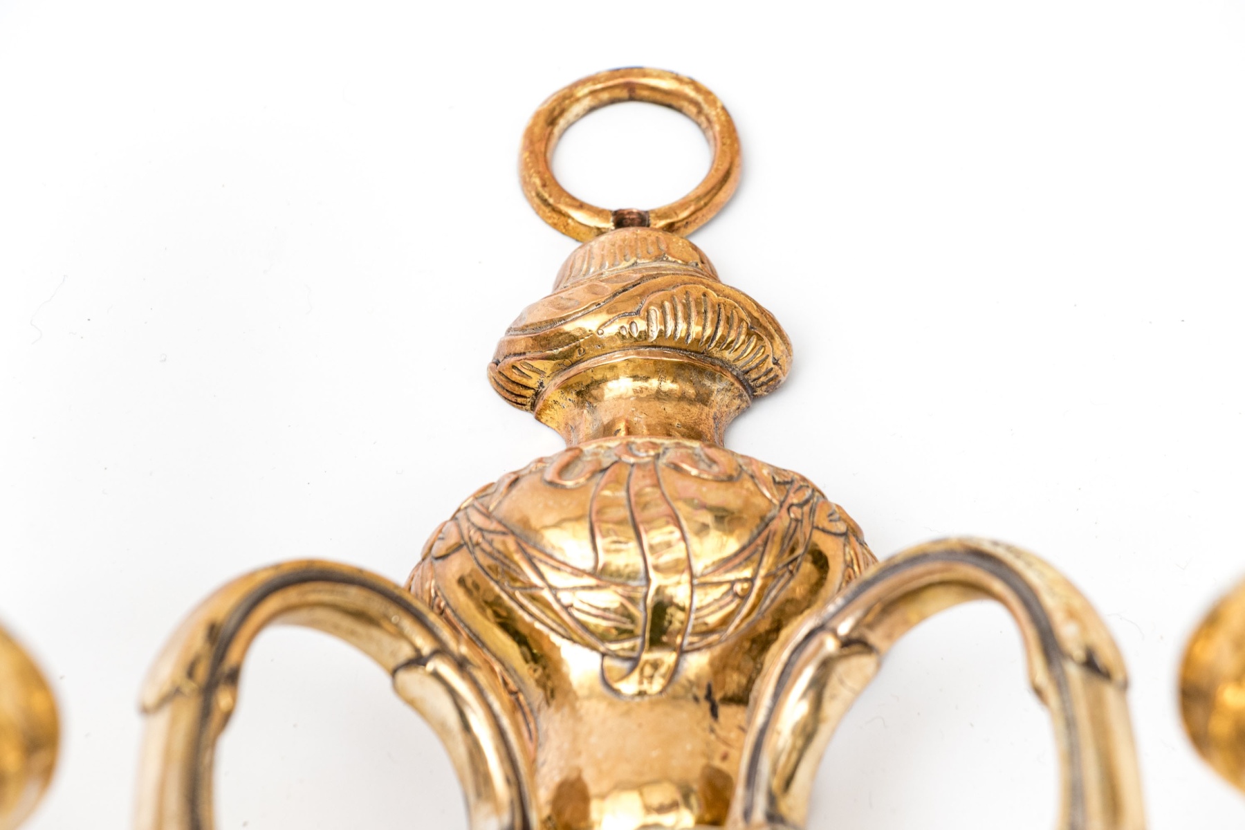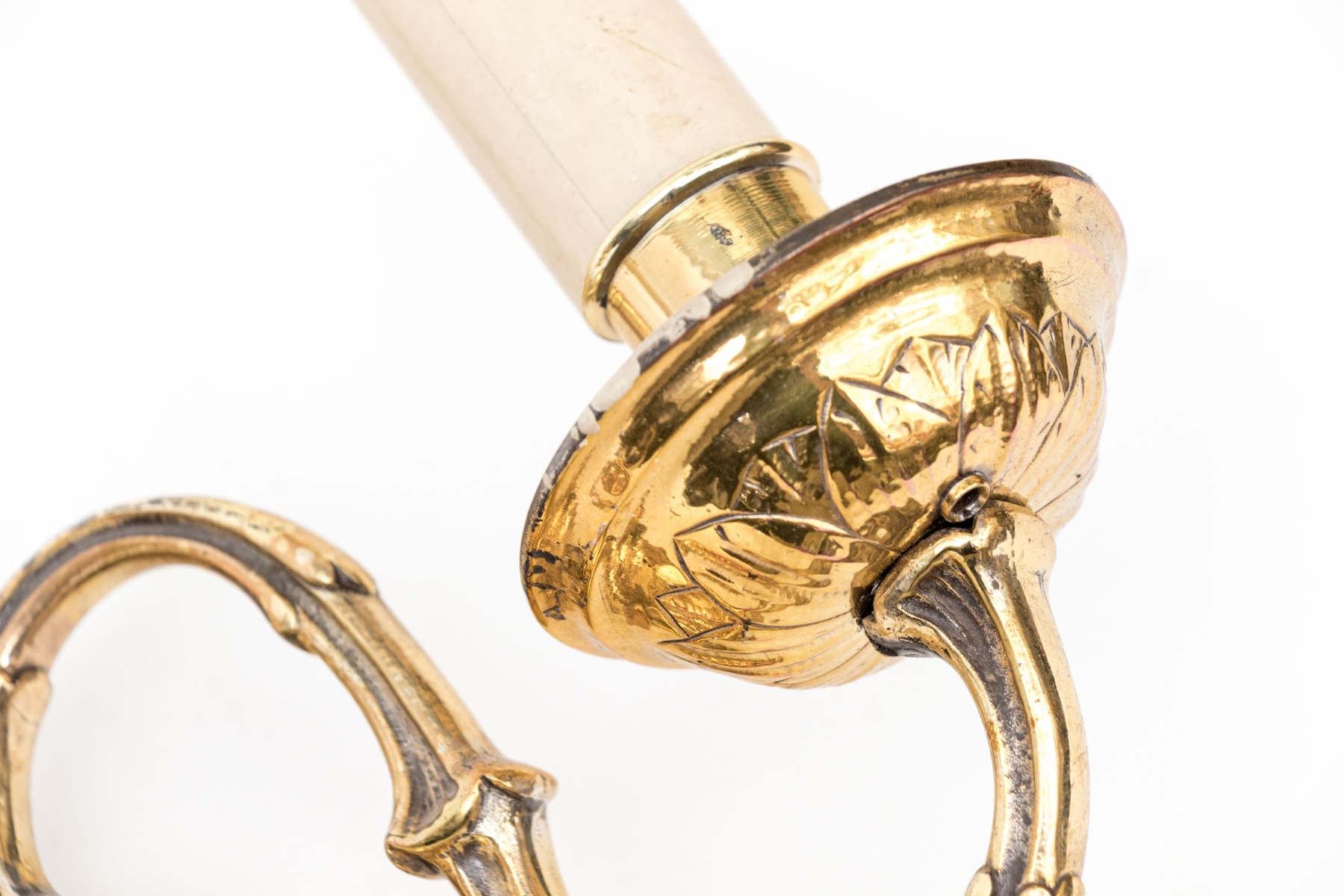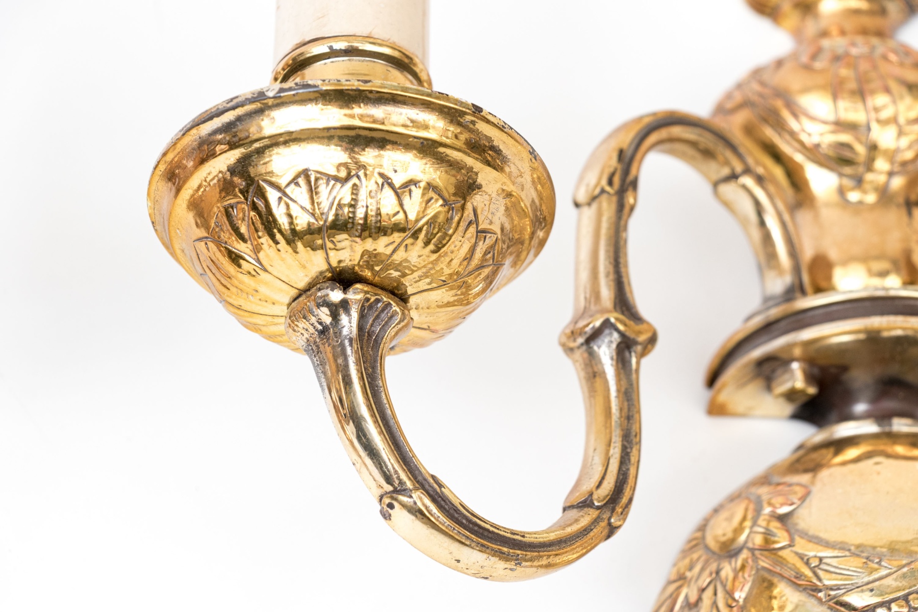 Each of ornate form with two scrolled arms and wax drip cups. Circular loop t finial and terminal.