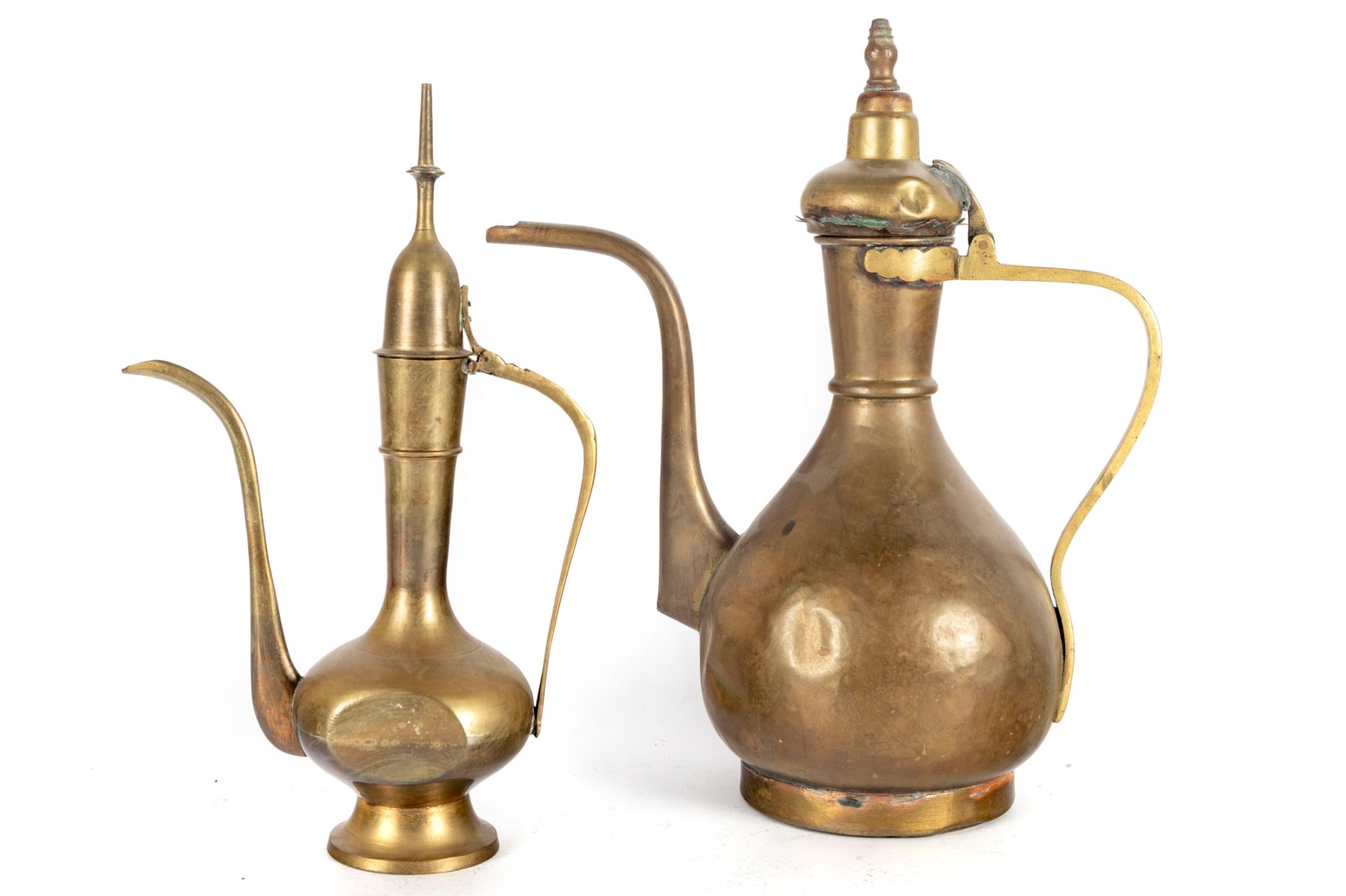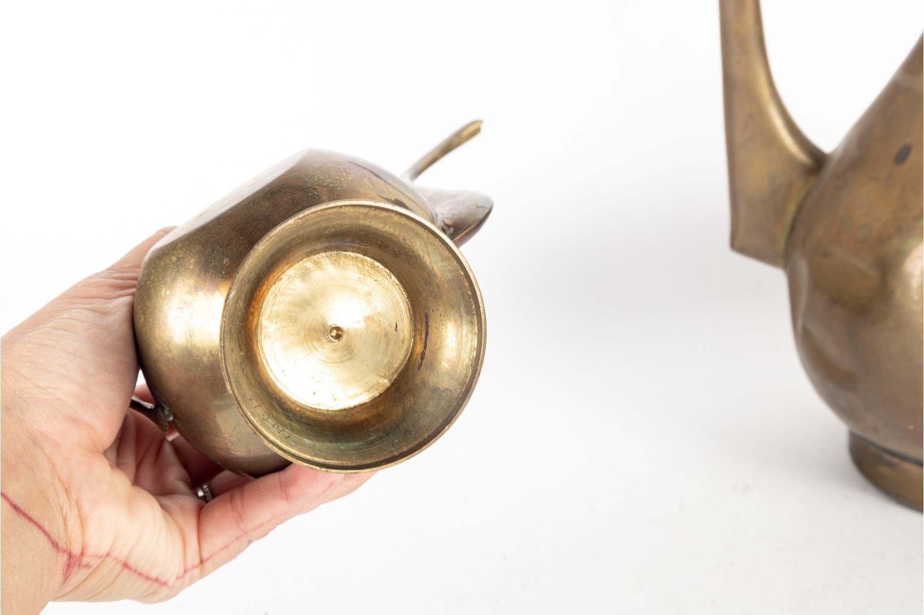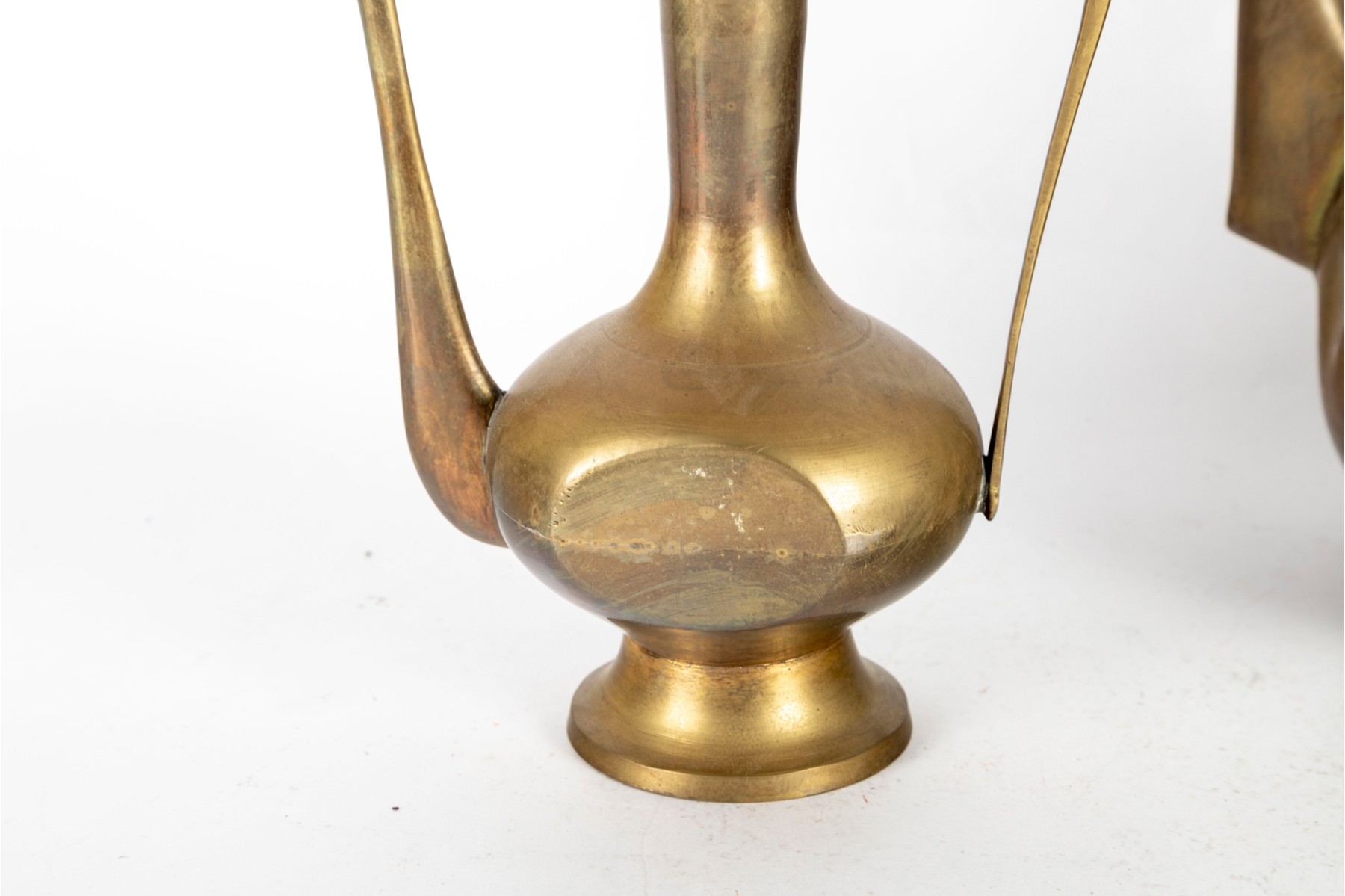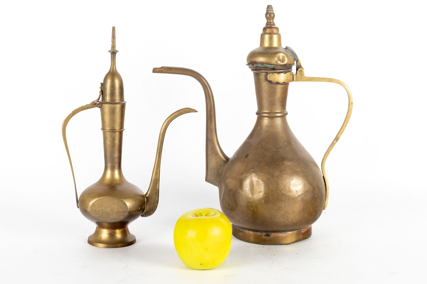 Pair of vintage brass ewers with elongated spouts and curved handles. Each piece features a traditional Middle Eastern design with a bulbous body and tall, tapered neck. One ewer includes a hinged lid with a finial top.