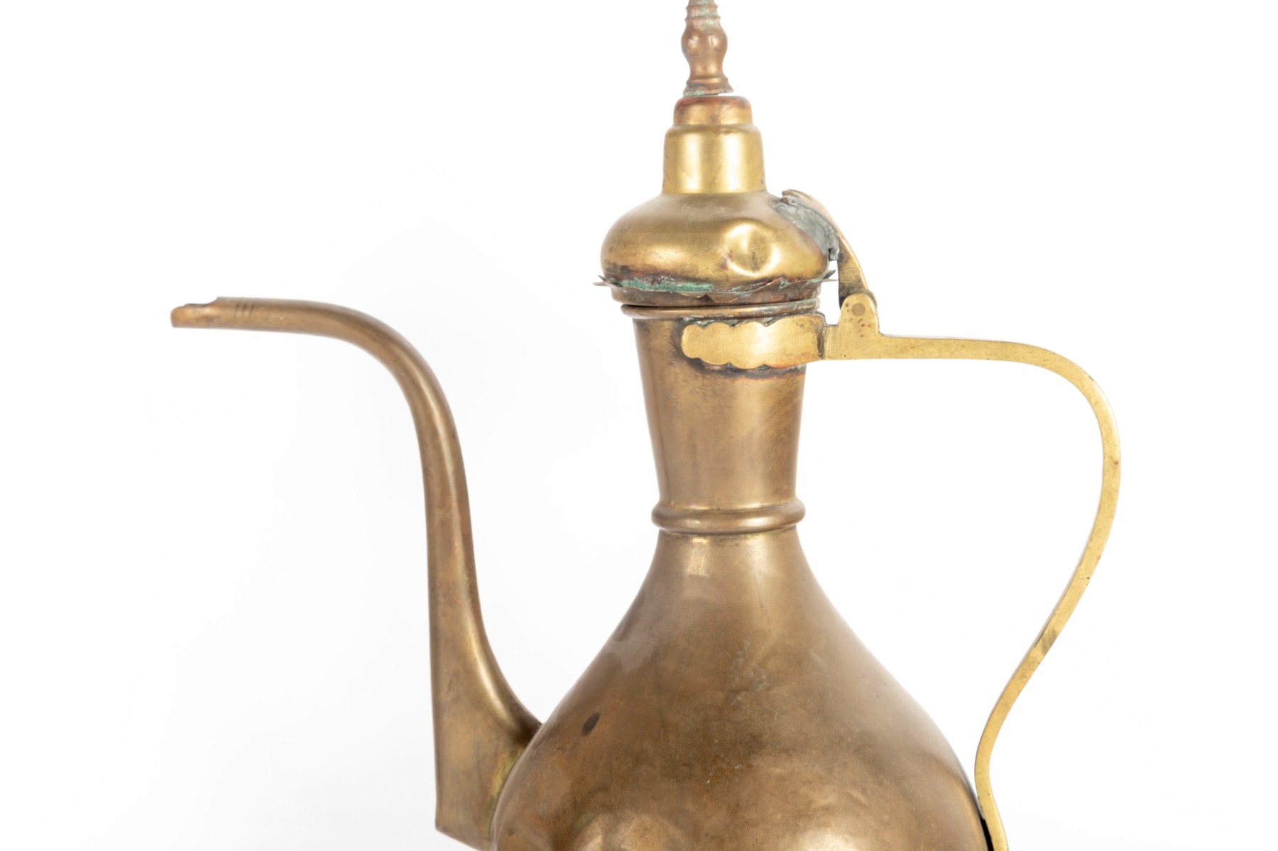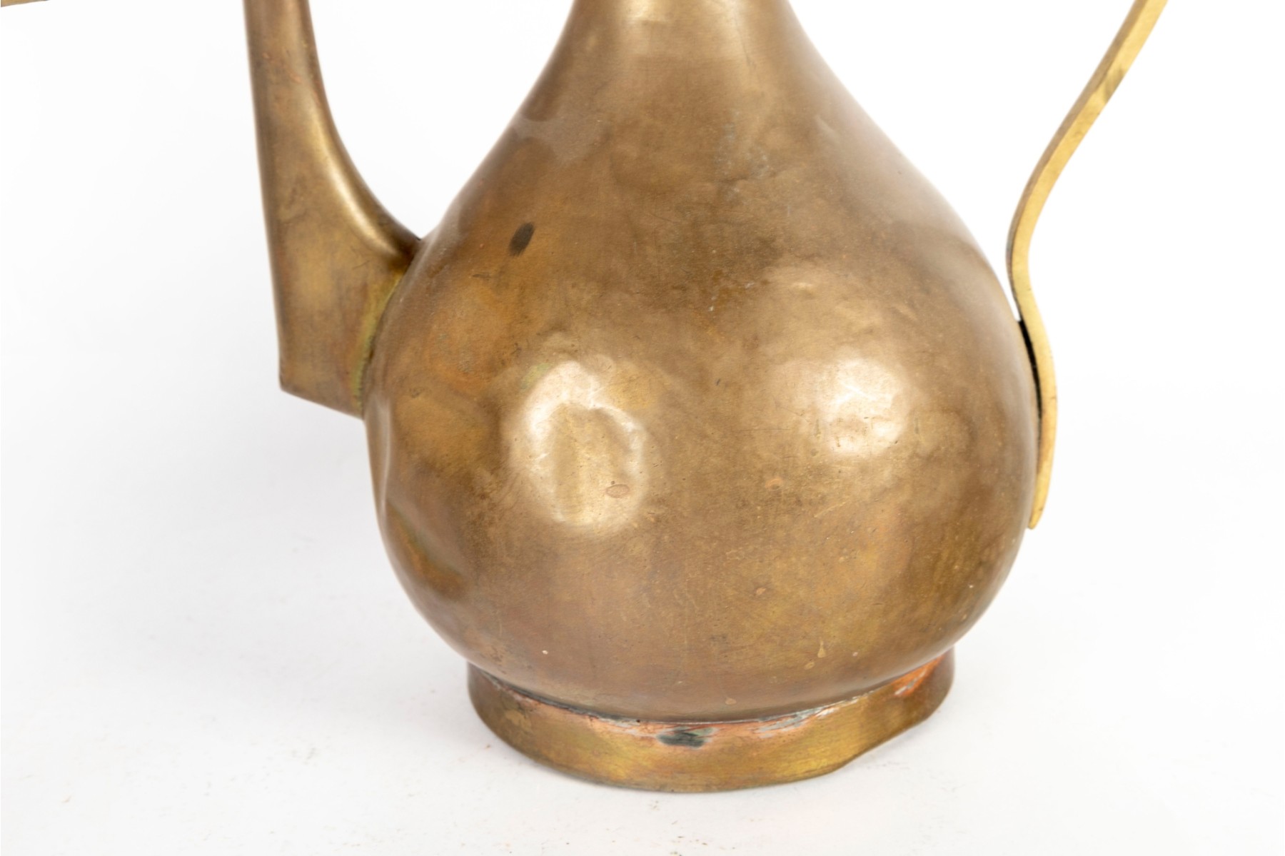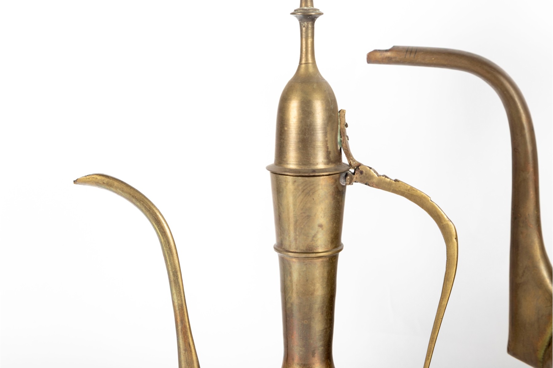 Pair of vintage brass ewers with elongated spouts and curved handles. Each piece features a traditional Middle Eastern design with a bulbous body and tall, tapered neck. One ewer includes a hinged lid with a finial top.