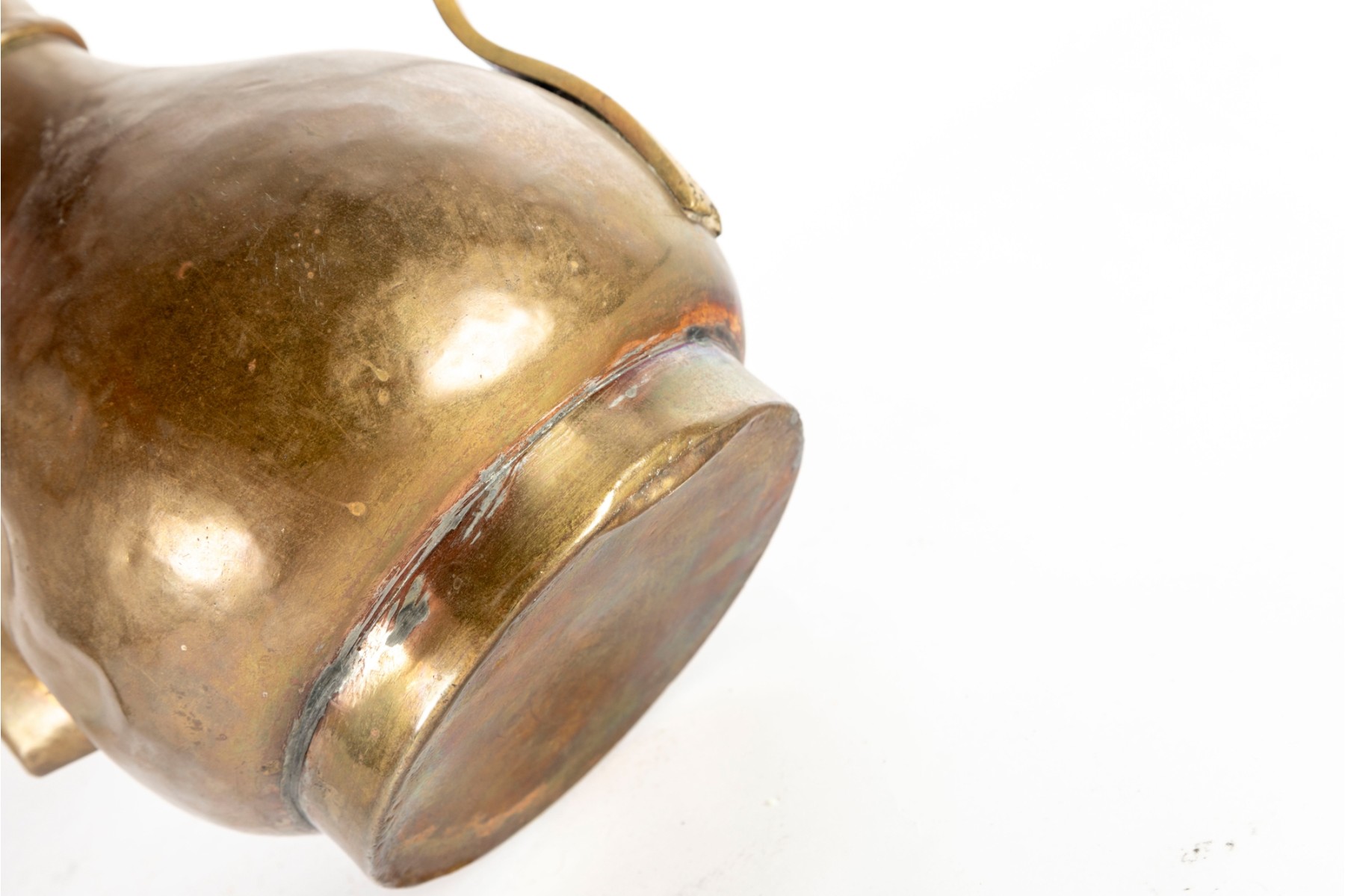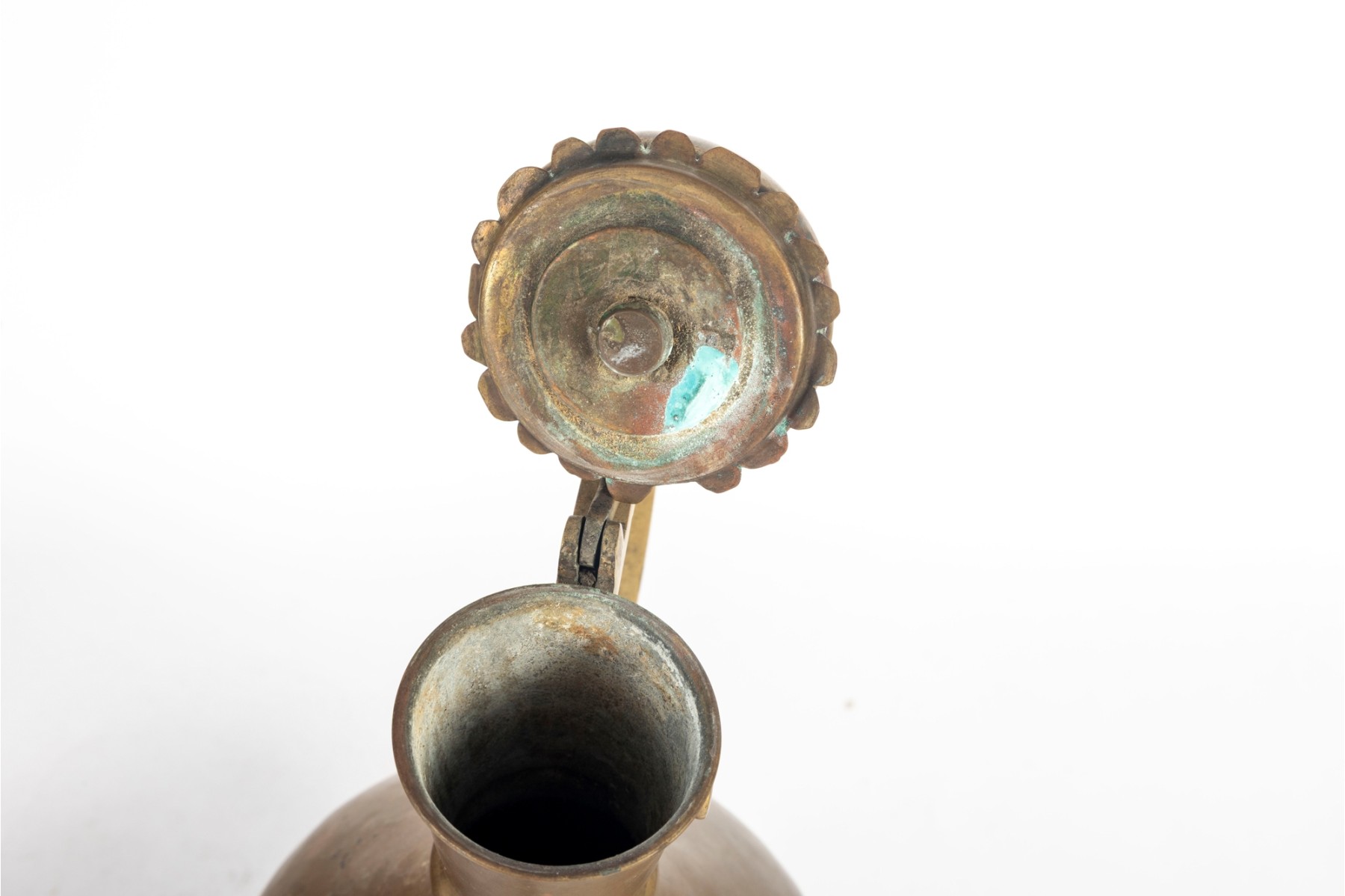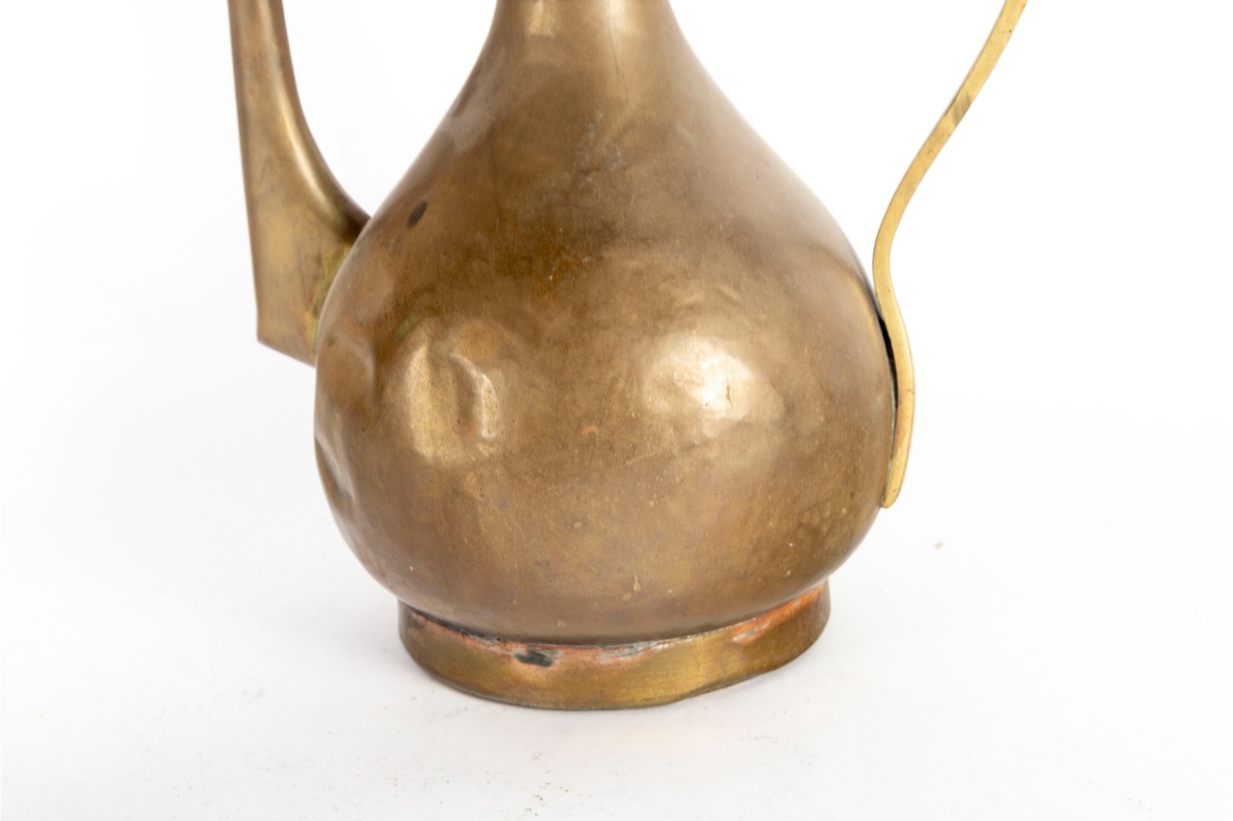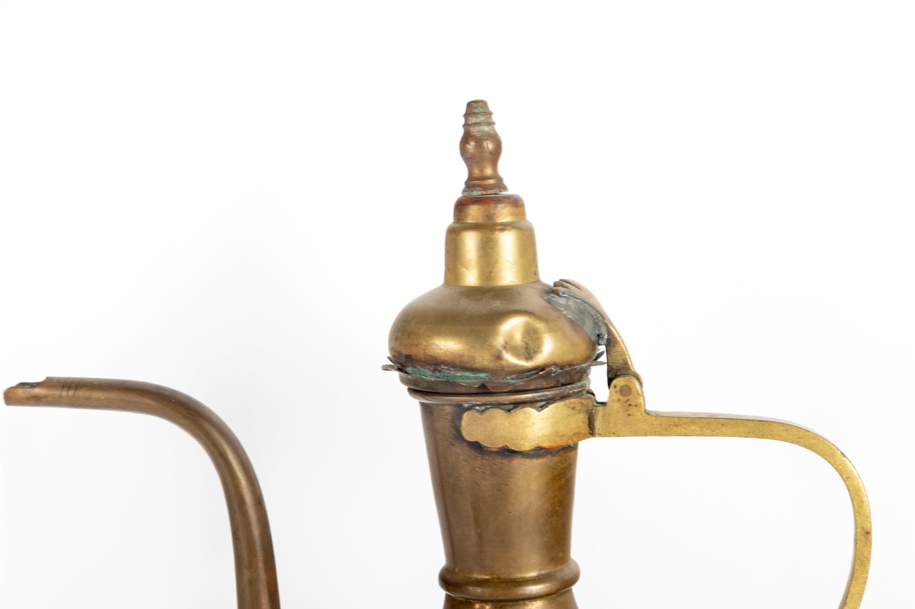 Pair of vintage brass ewers with elongated spouts and curved handles. Each piece features a traditional Middle Eastern design with a bulbous body and tall, tapered neck. One ewer includes a hinged lid with a finial top.