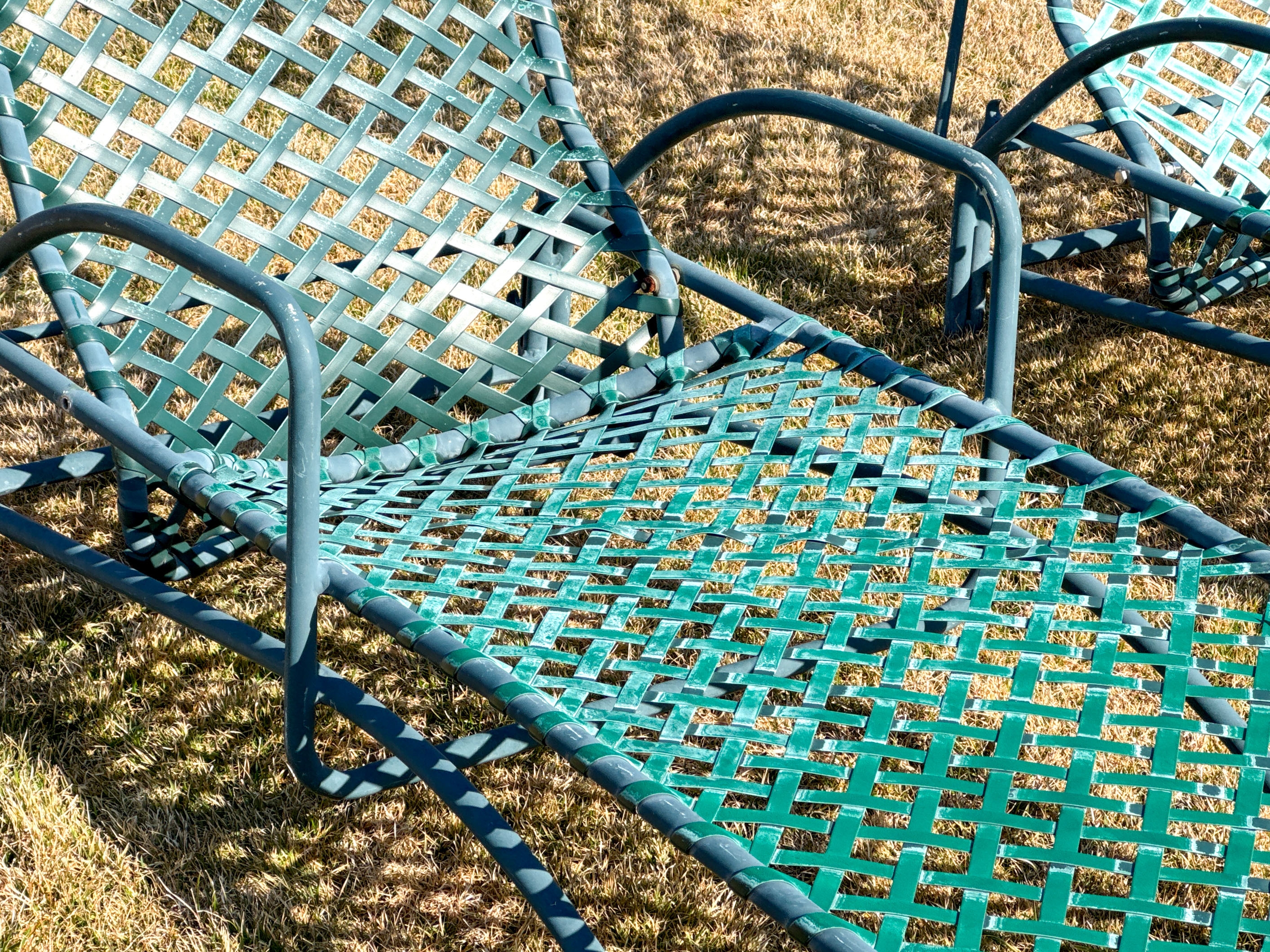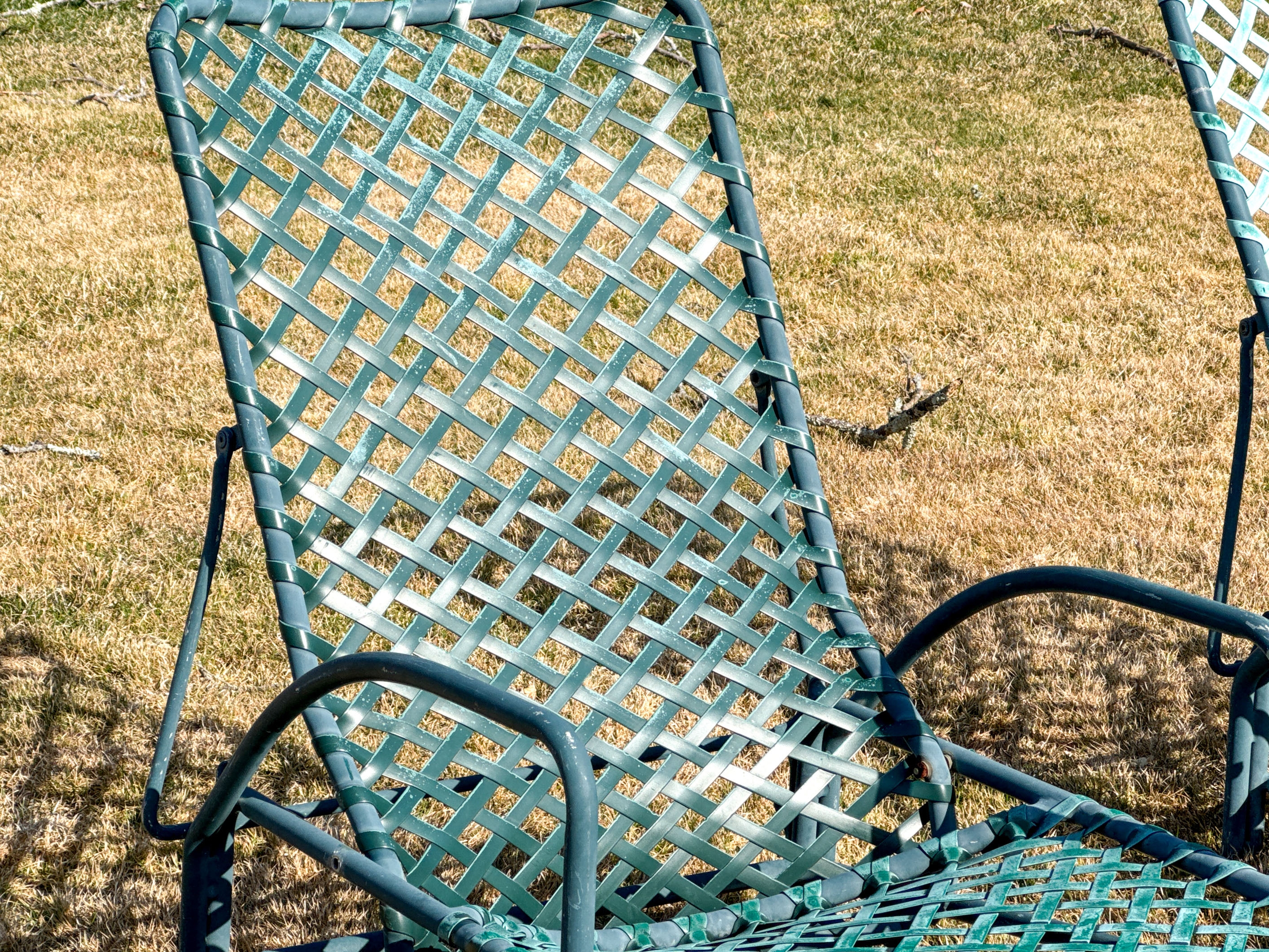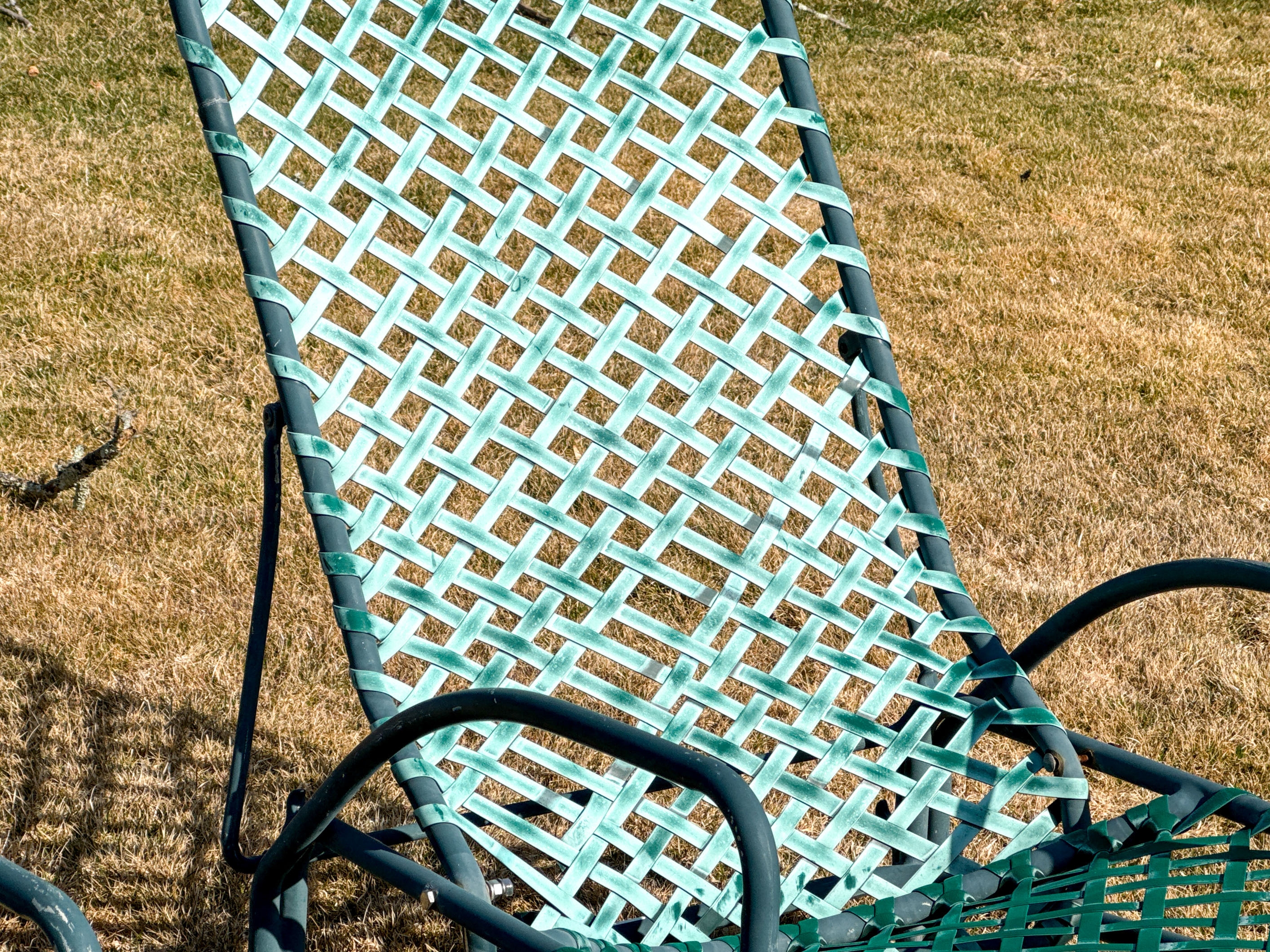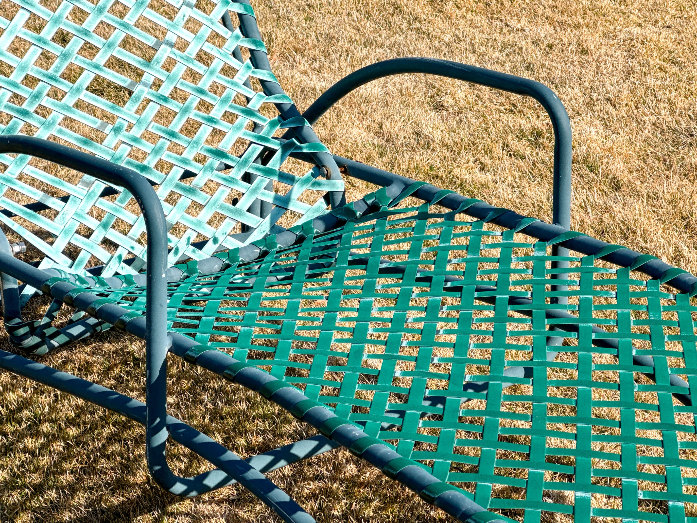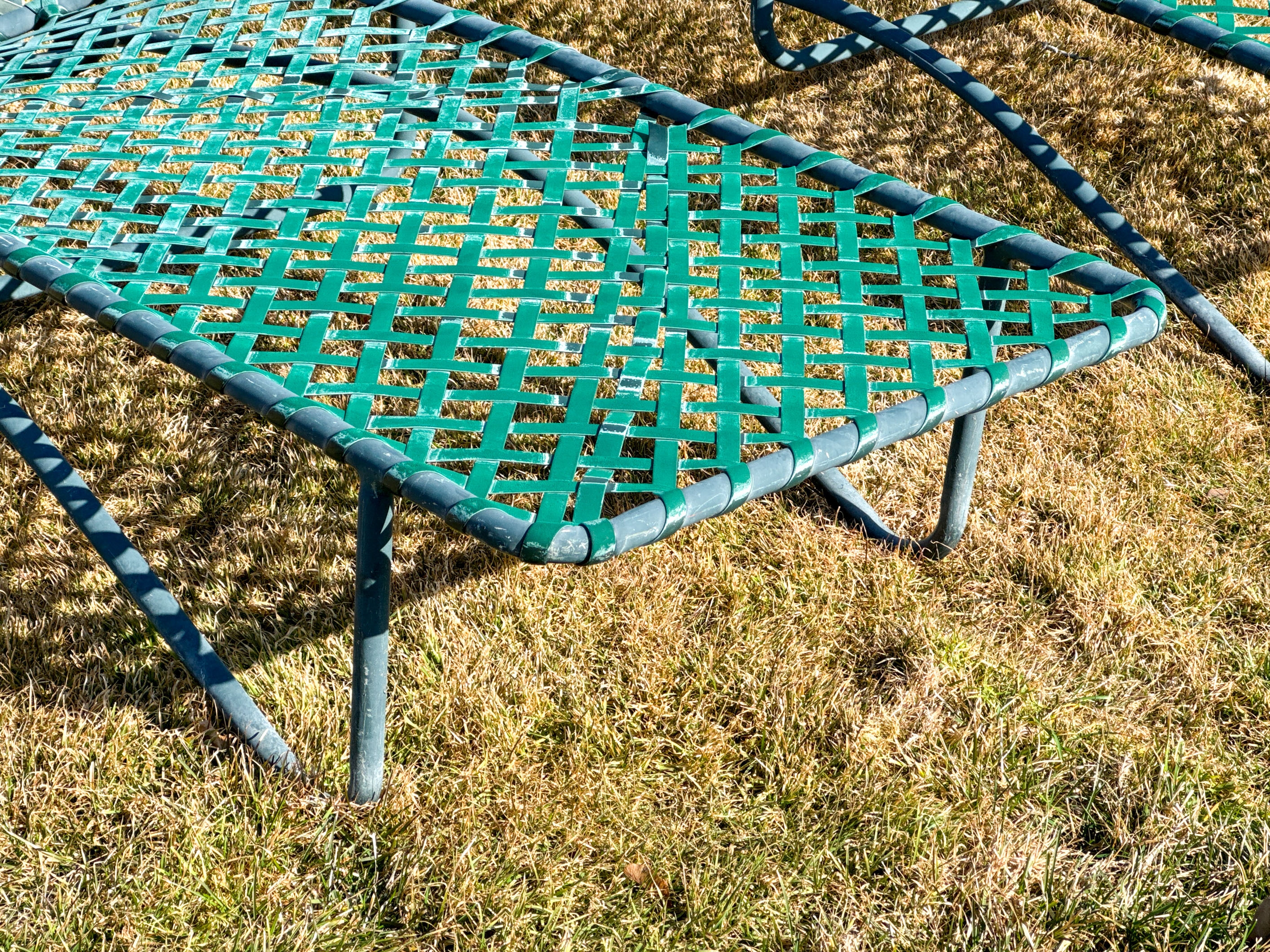 A handsome pair of Brown Jordan "Tamiami" outdoor chaise lounges showcasing steely blue metal frames with gently concave curved top rails, angular curved arms, and bracket front feet. The back and seat feature striking green woven strapping.