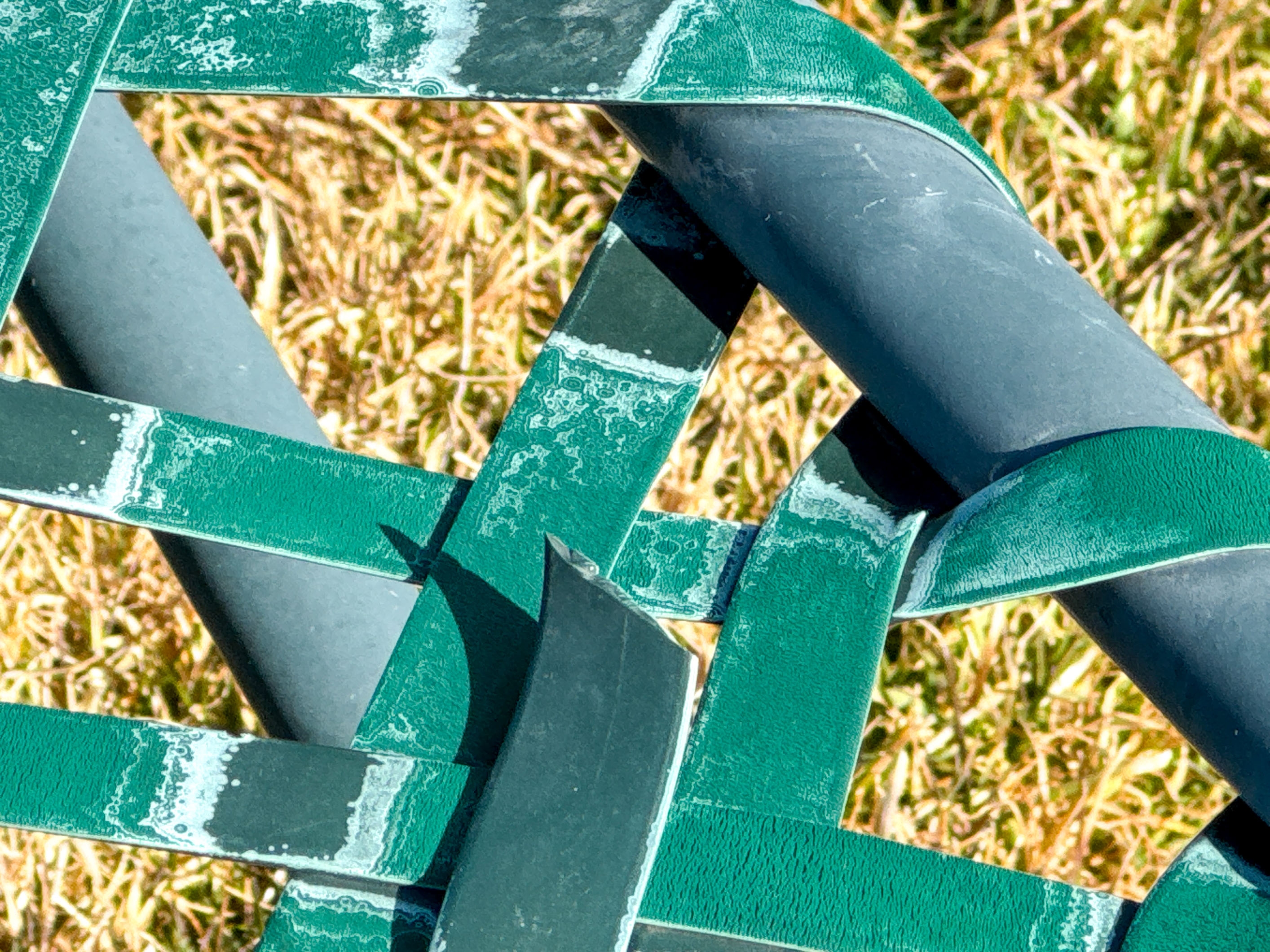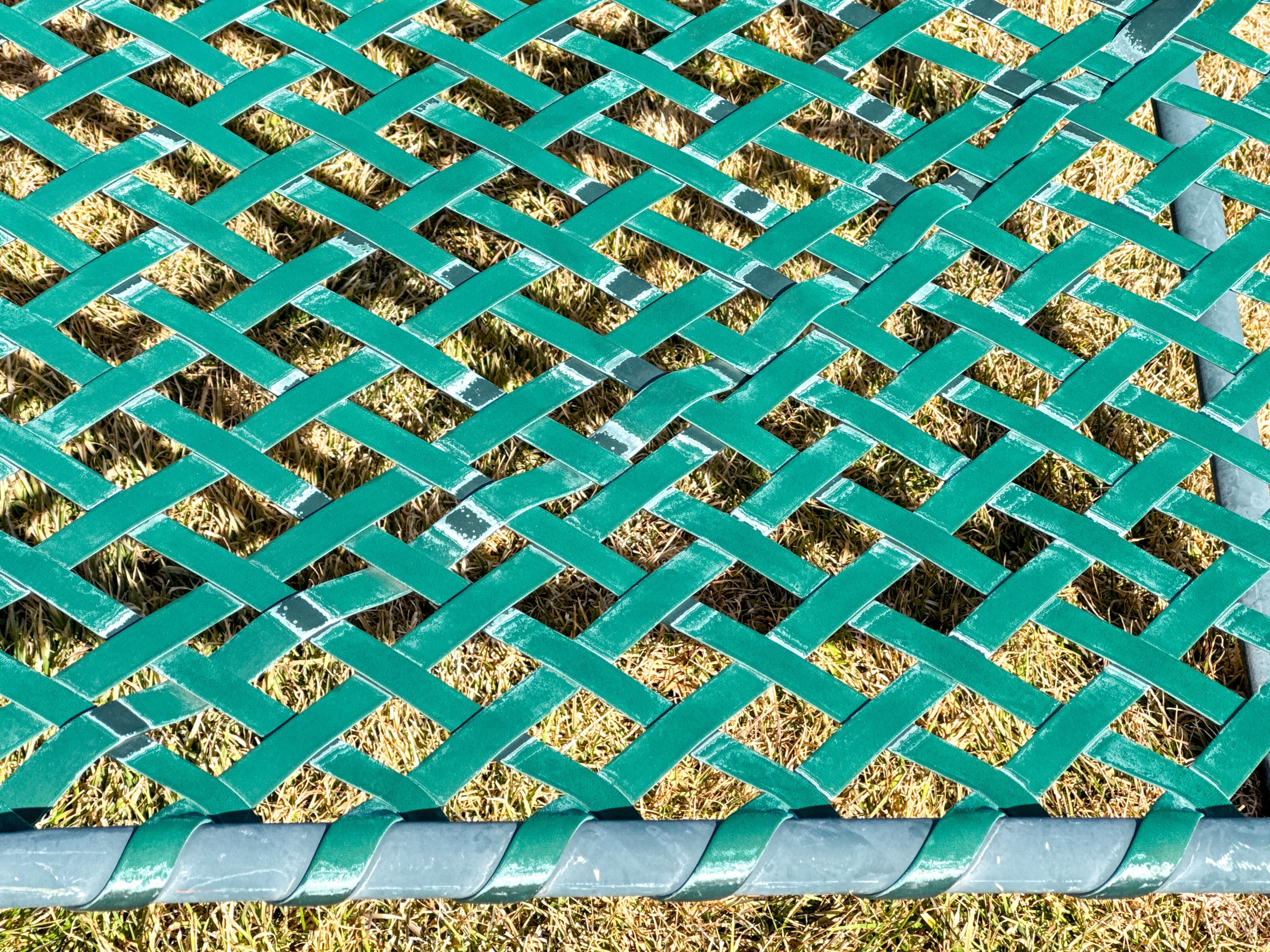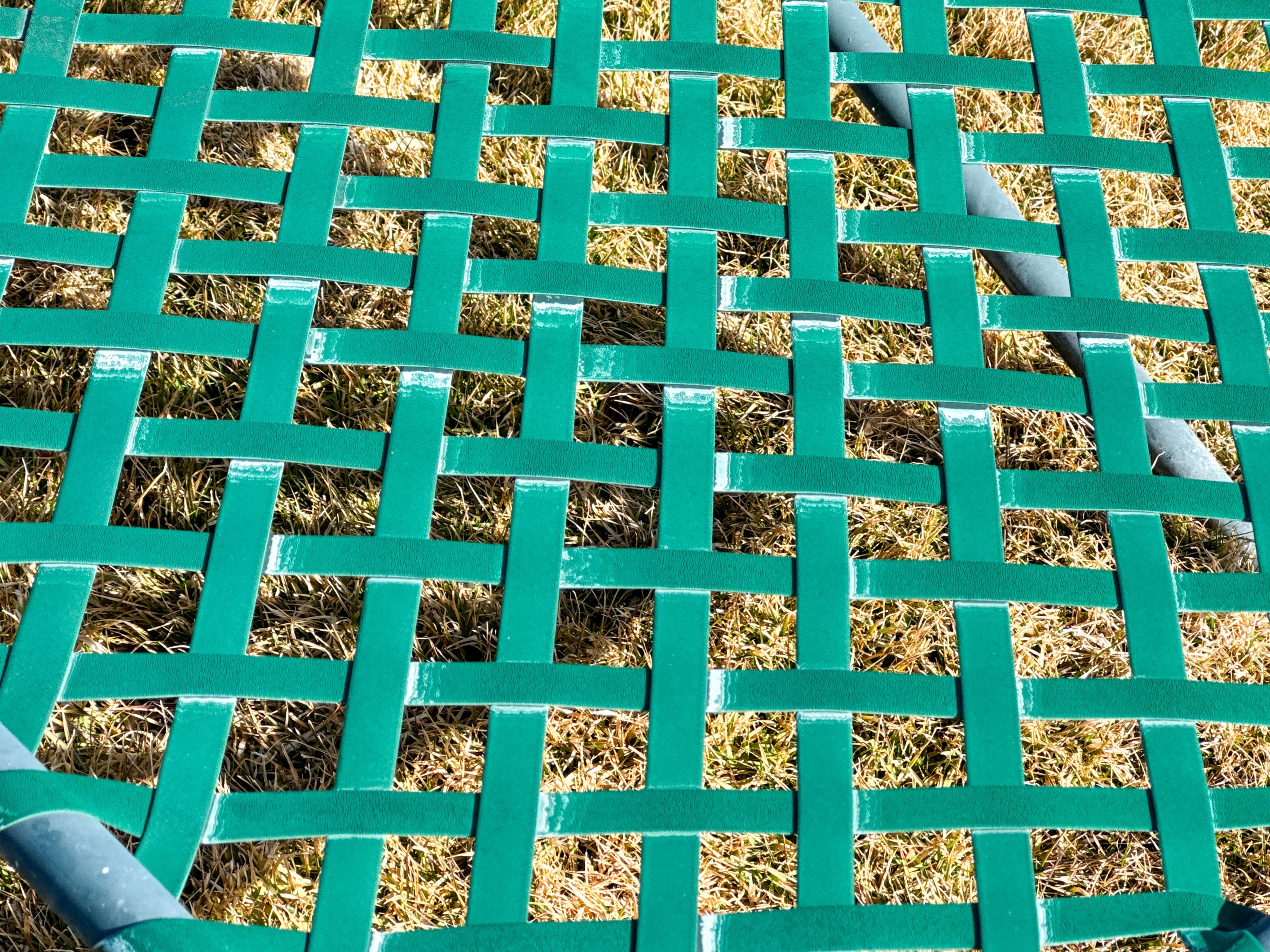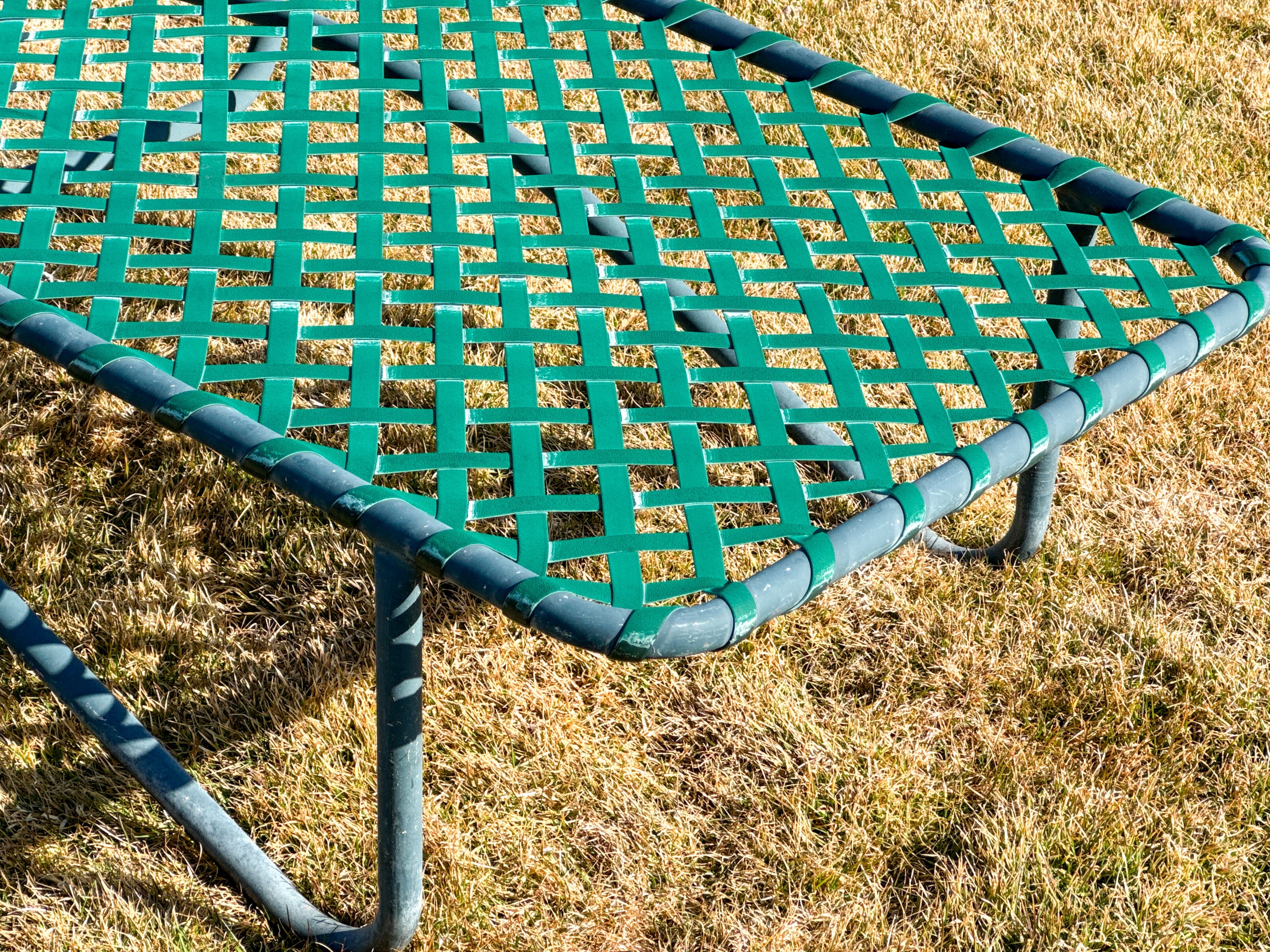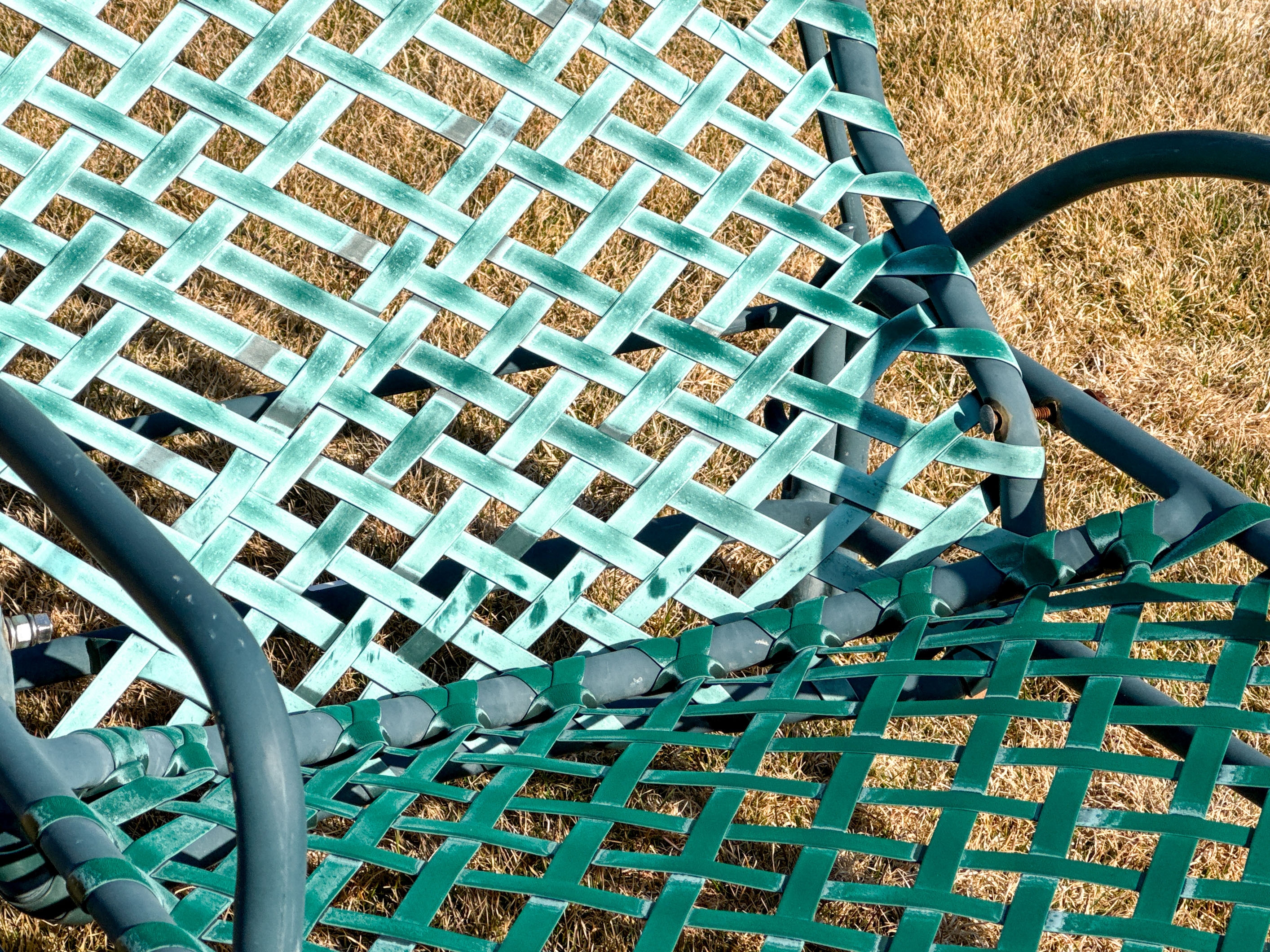 A handsome pair of Brown Jordan "Tamiami" outdoor chaise lounges showcasing steely blue metal frames with gently concave curved top rails, angular curved arms, and bracket front feet. The back and seat feature striking green woven strapping.