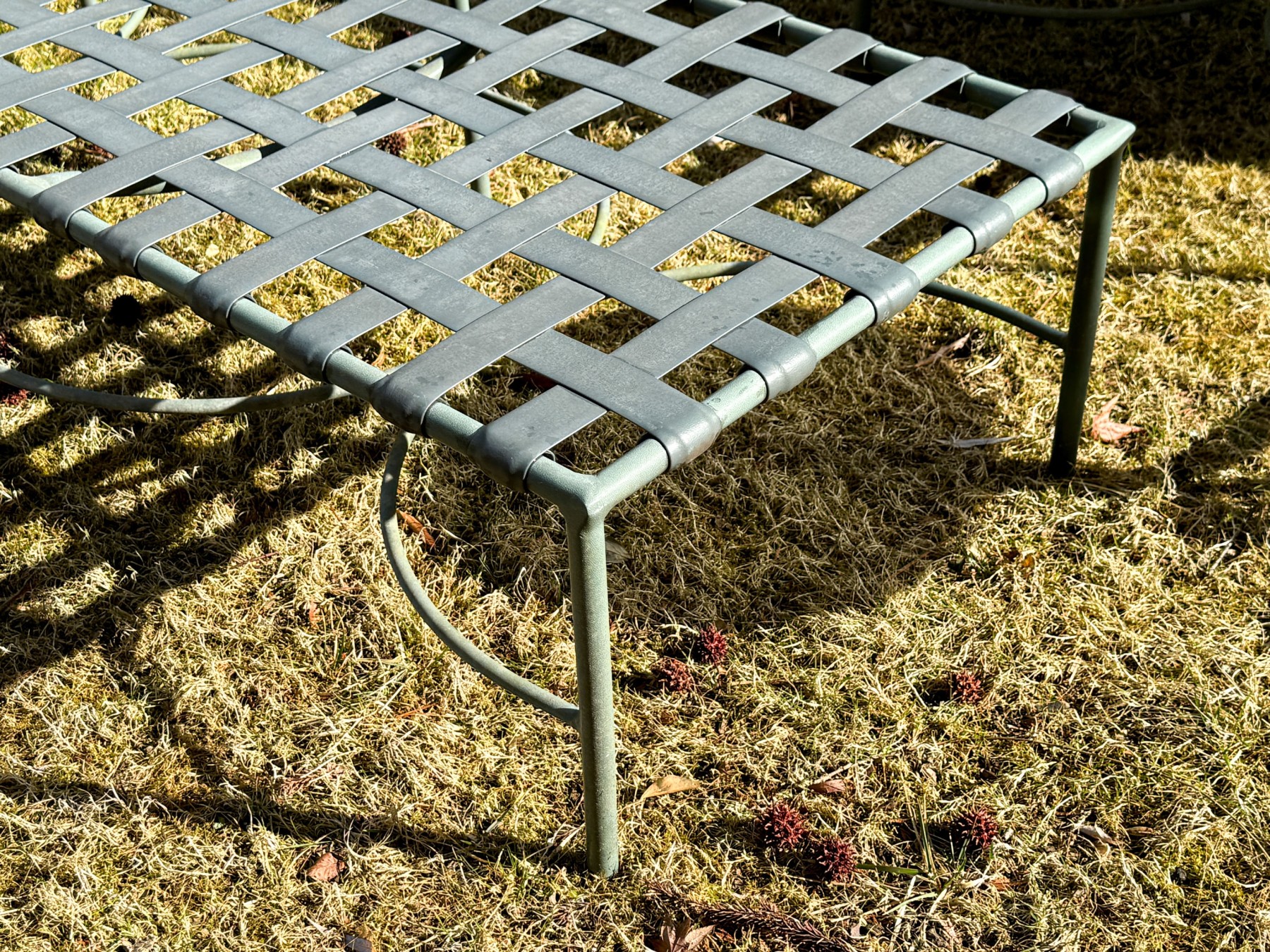 A fine pair of vintage Brown Jordan outdoor chaise lounges with great Art nouveau forms featuring three height adjustable settings for the chaise lounges seat back. Does not bear the makers mark.