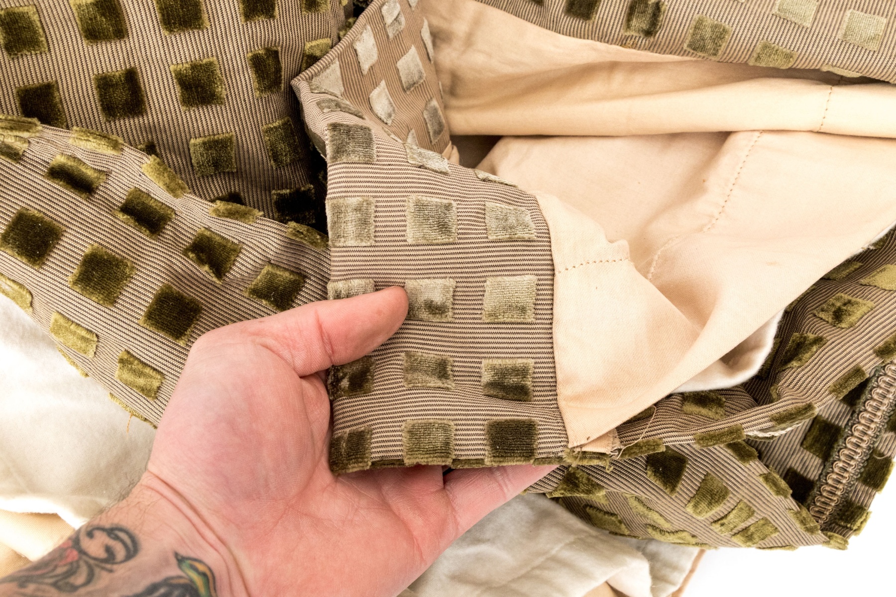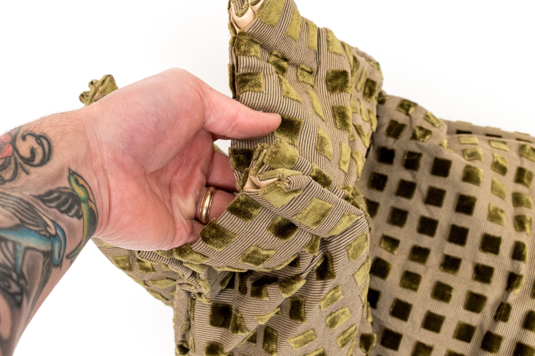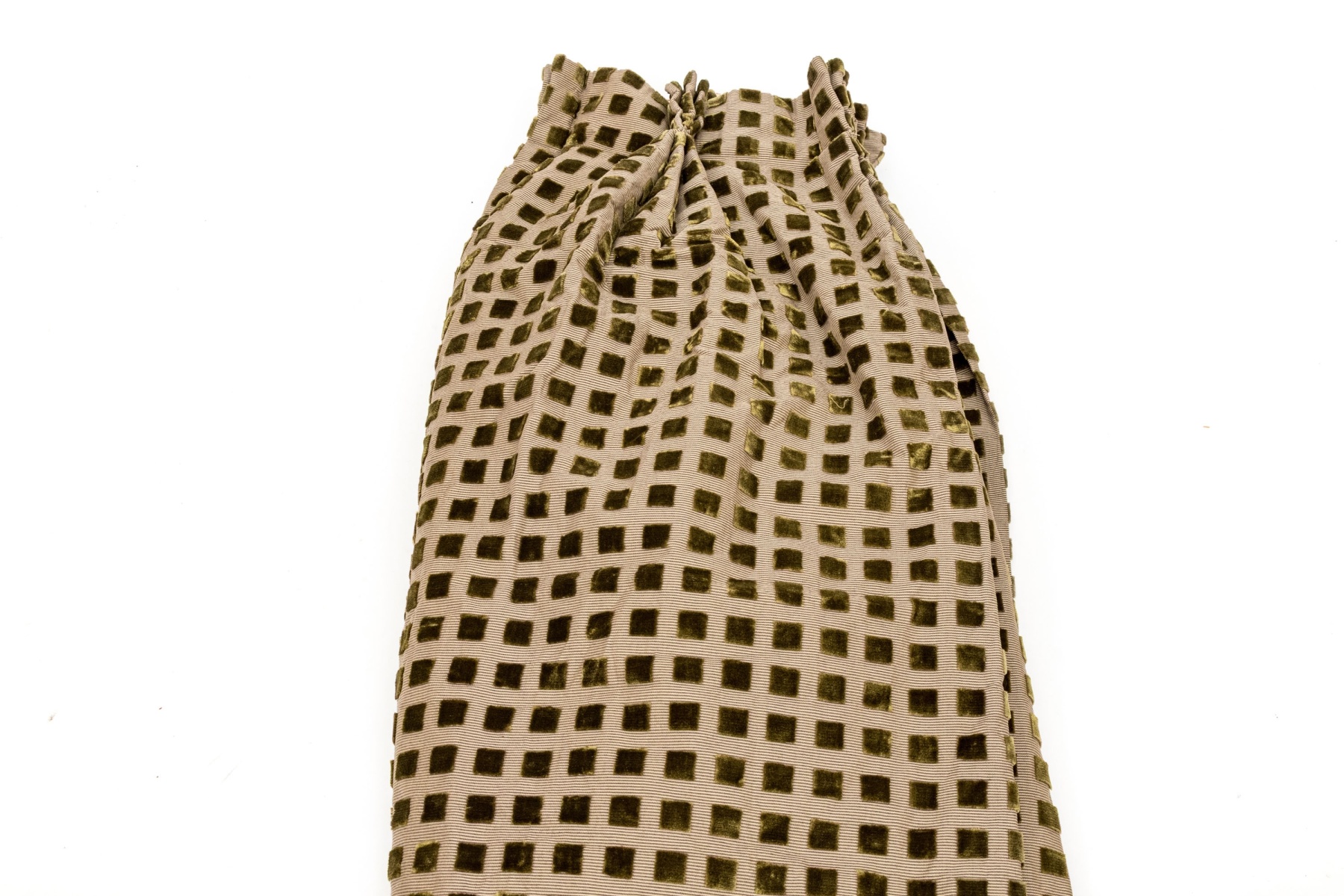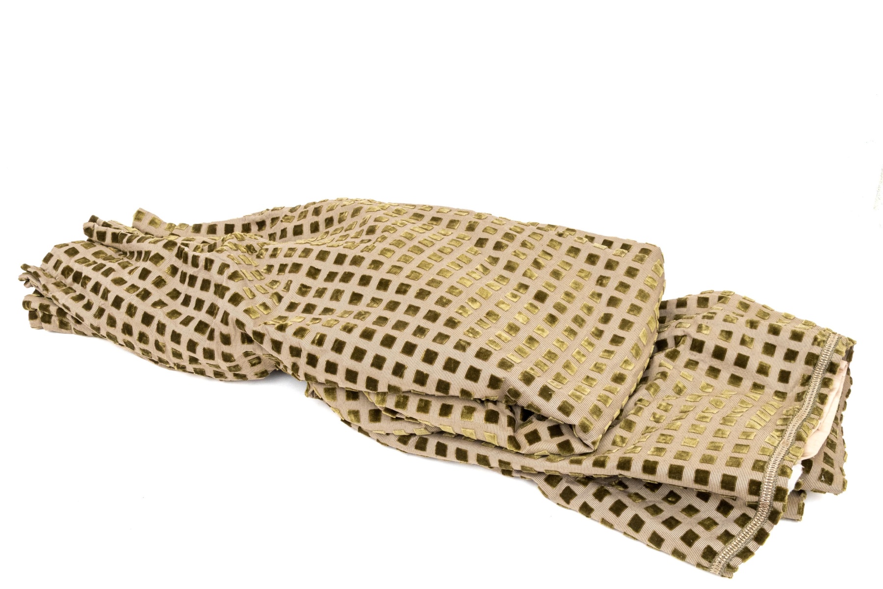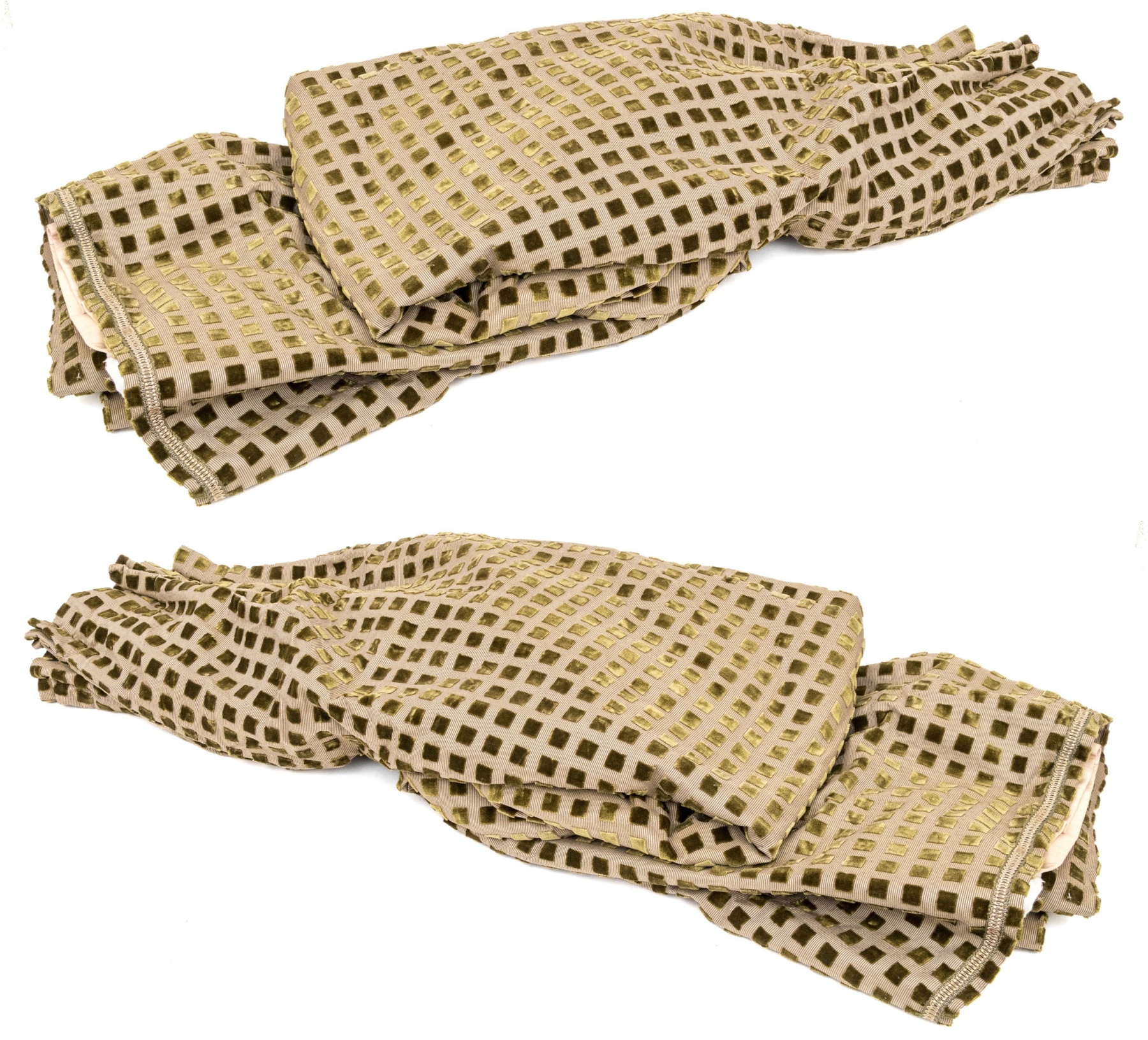 A high quality pair of Brunschwig and Fils fabric window curtains an elegant and eye-catching gridded design with raised moss green chenille squares against a corded beige-brown ground. Lined and interlined.