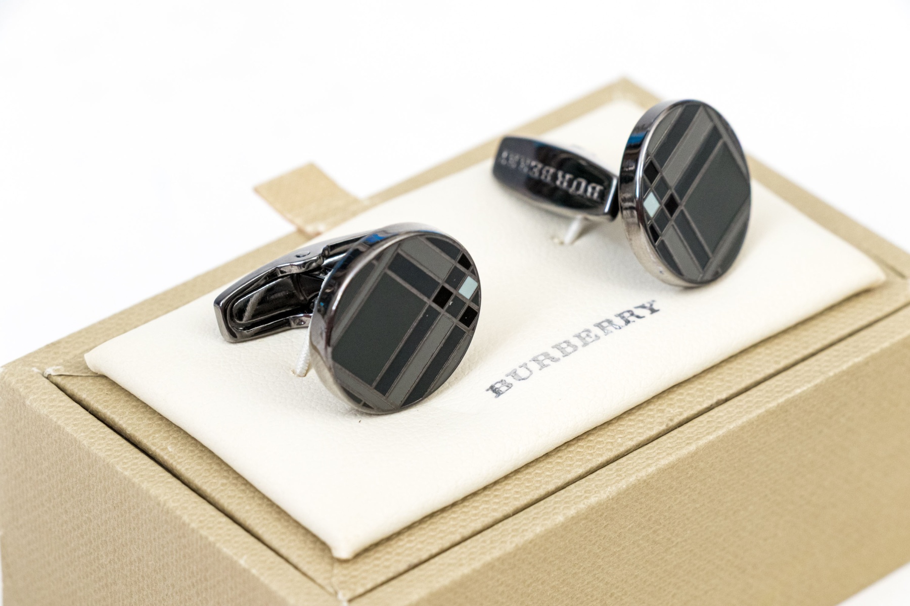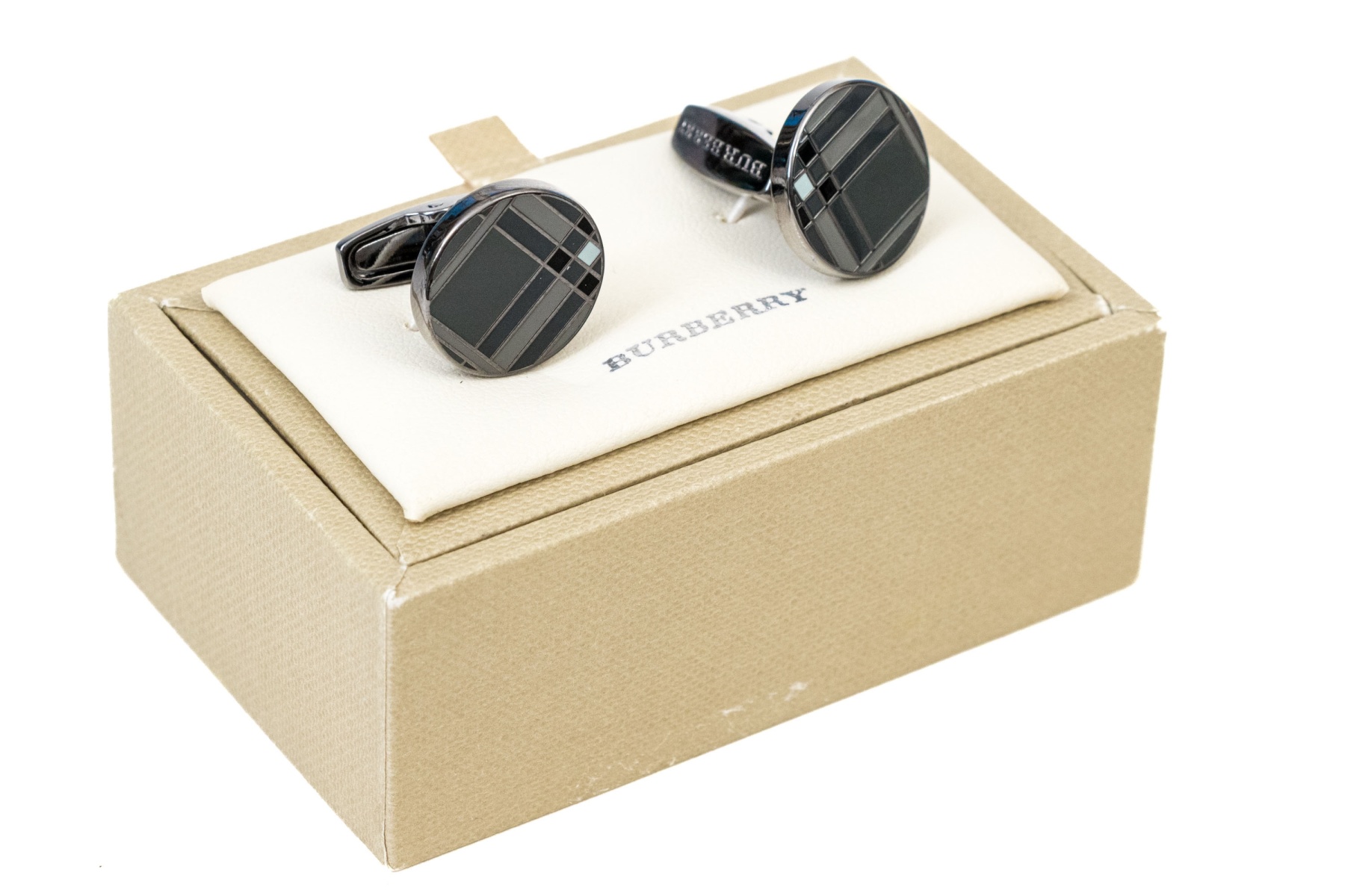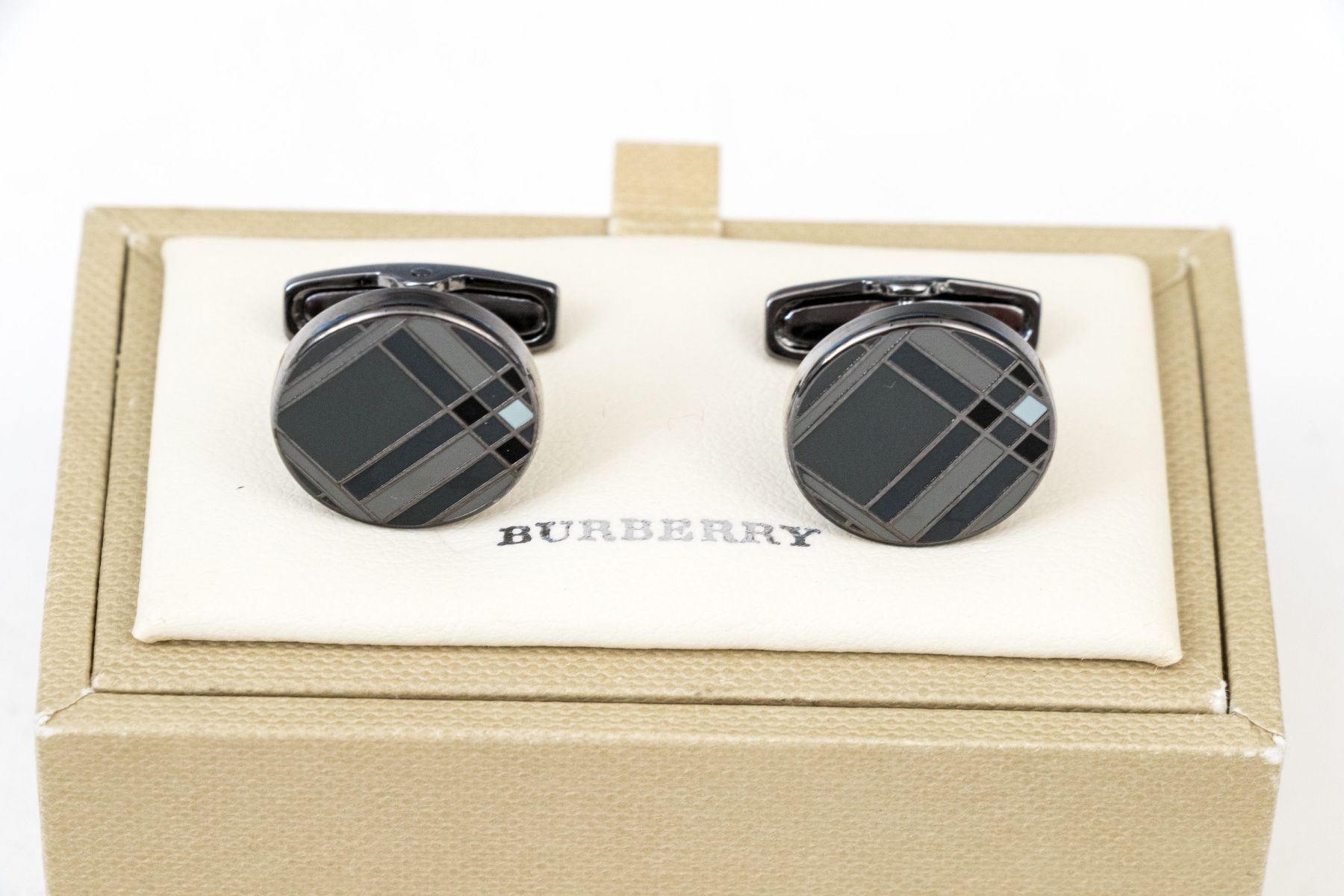 A handsome pair of Burberry cufflinks sporting gray and black enamel check patterns with light blue-white accents at the inner corners. Includes the original box.