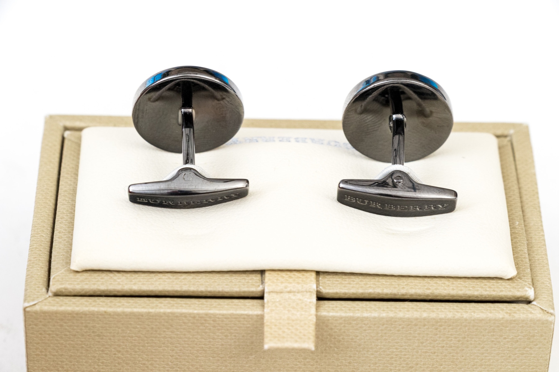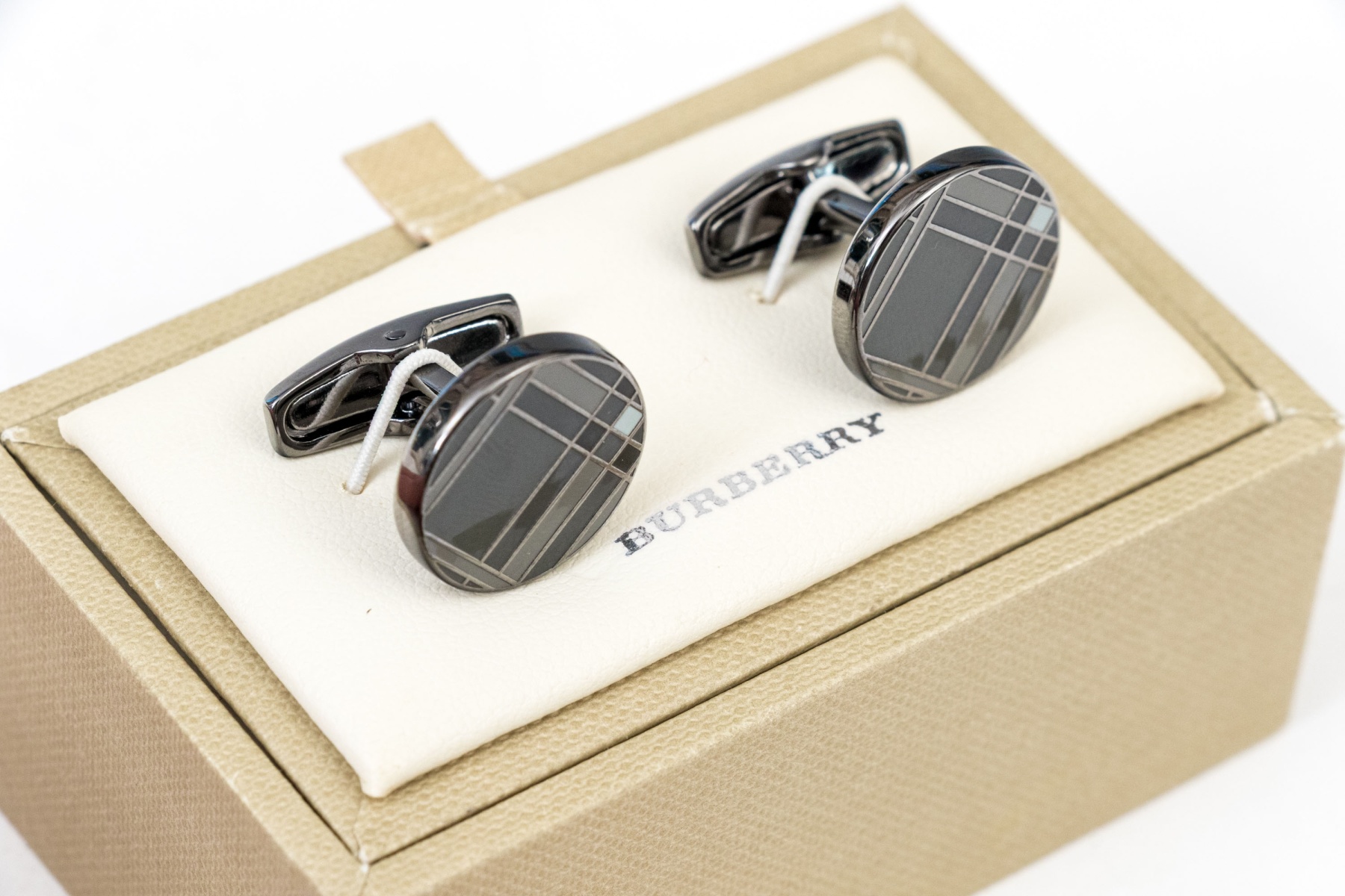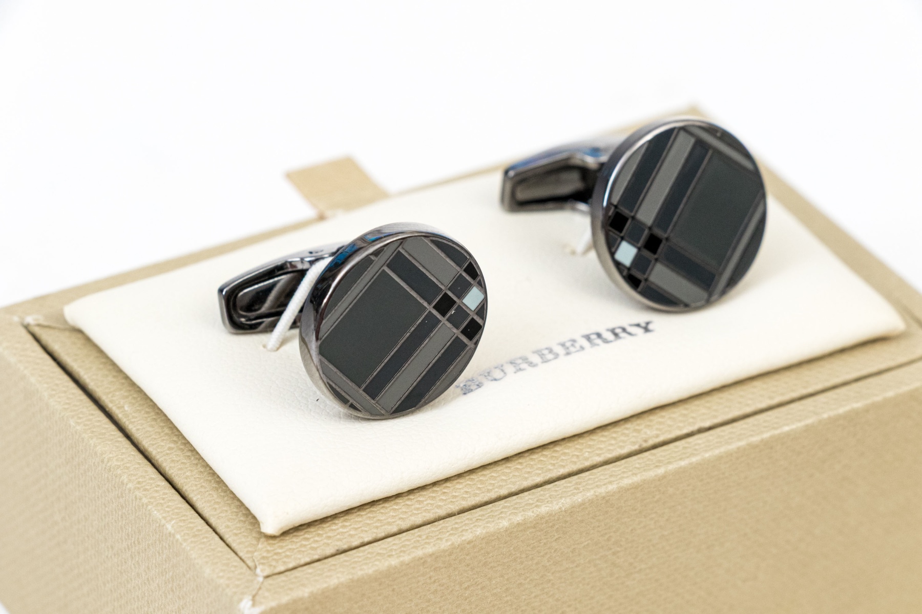 A handsome pair of Burberry cufflinks sporting gray and black enamel check patterns with light blue-white accents at the inner corners. Includes the original box.