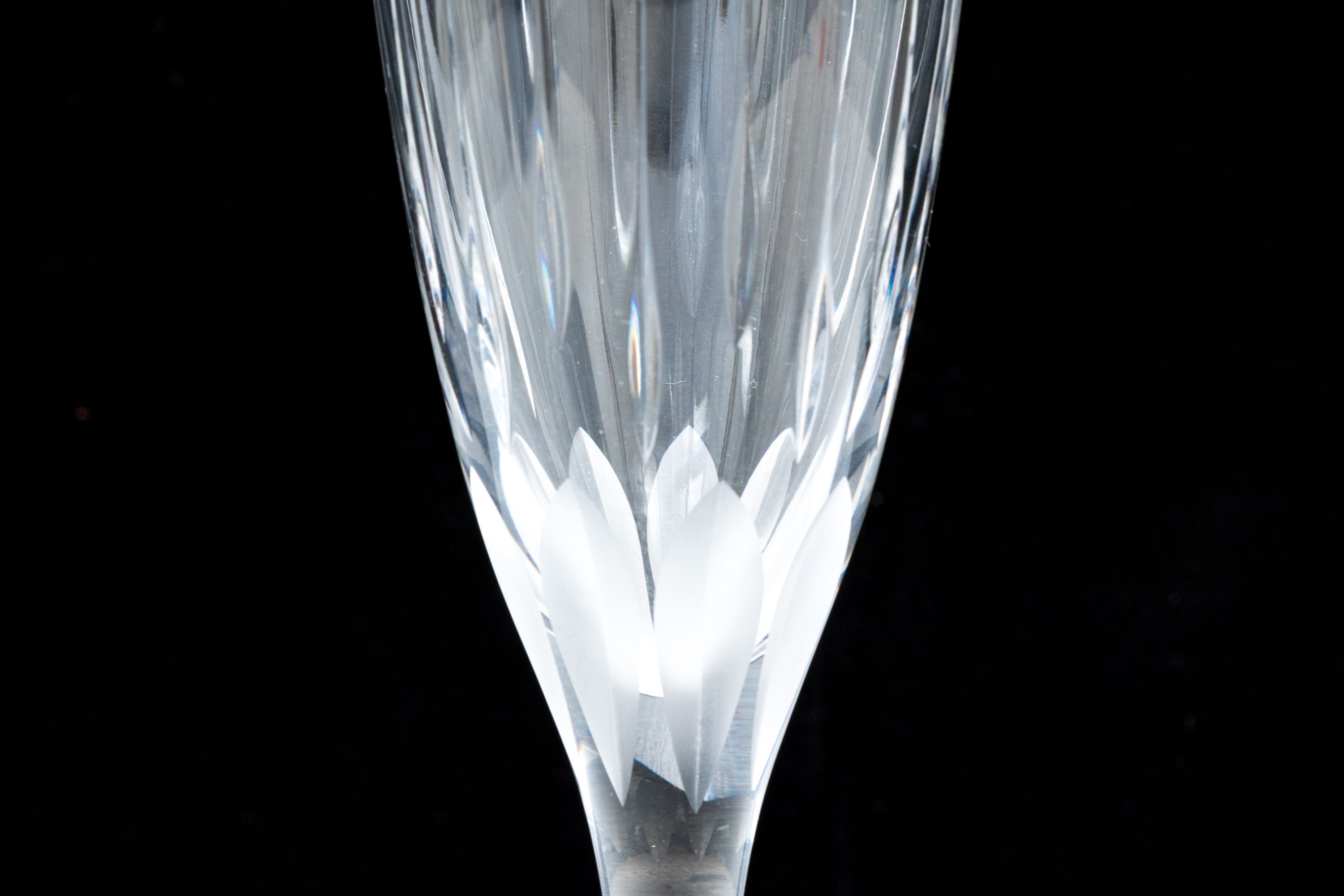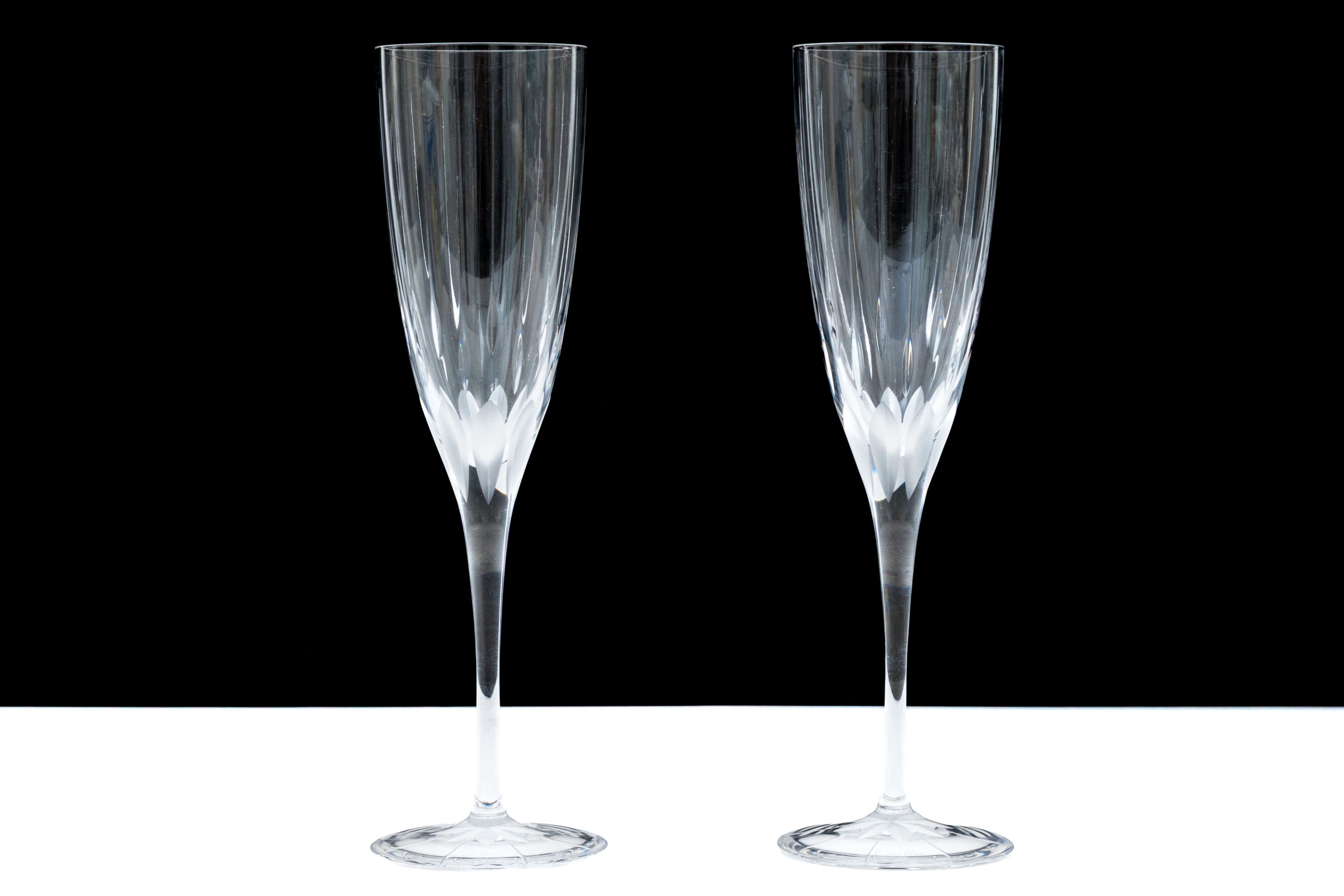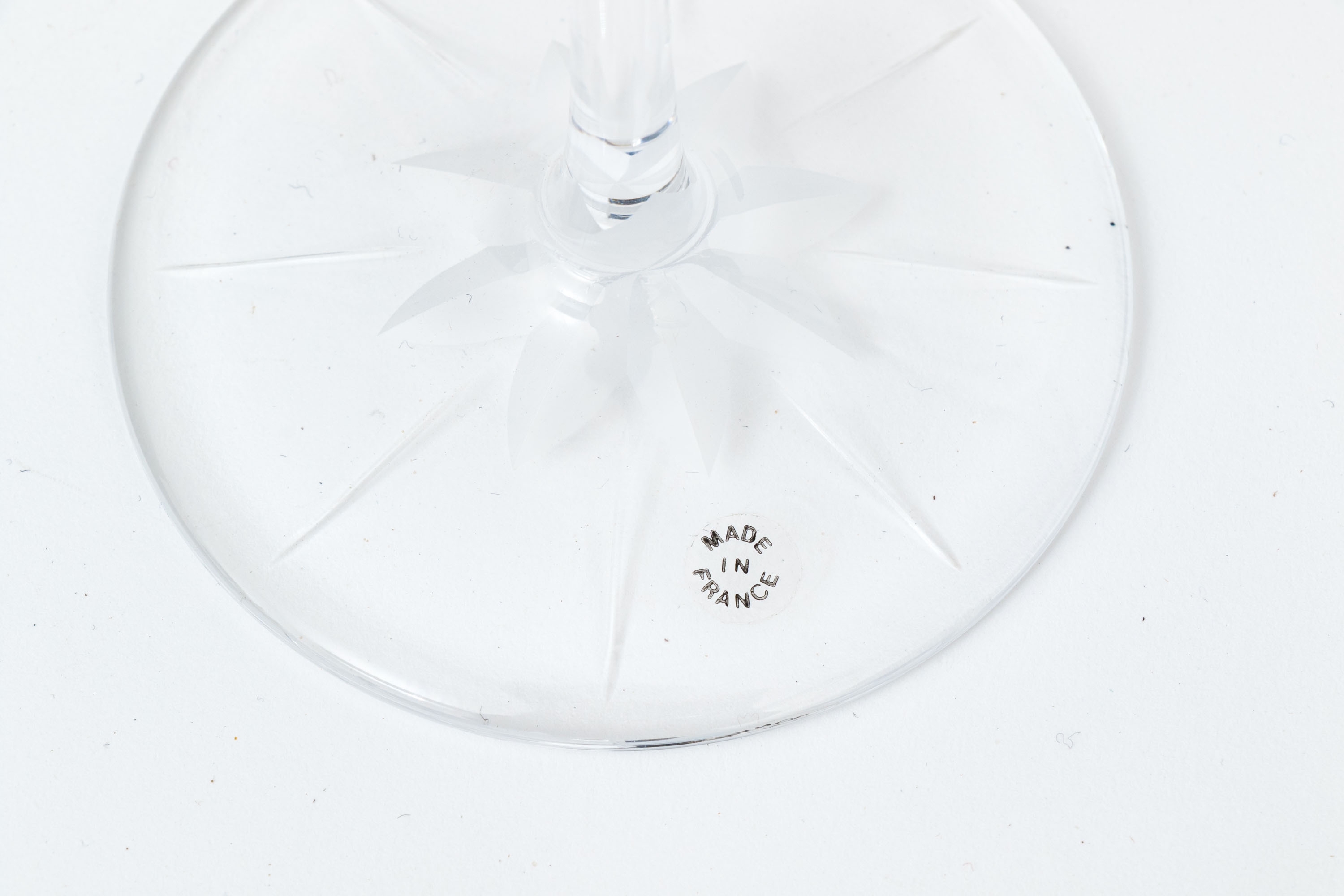 Made in France. Tall flutes with etched ribs and frosted cuts and stars on the feet.