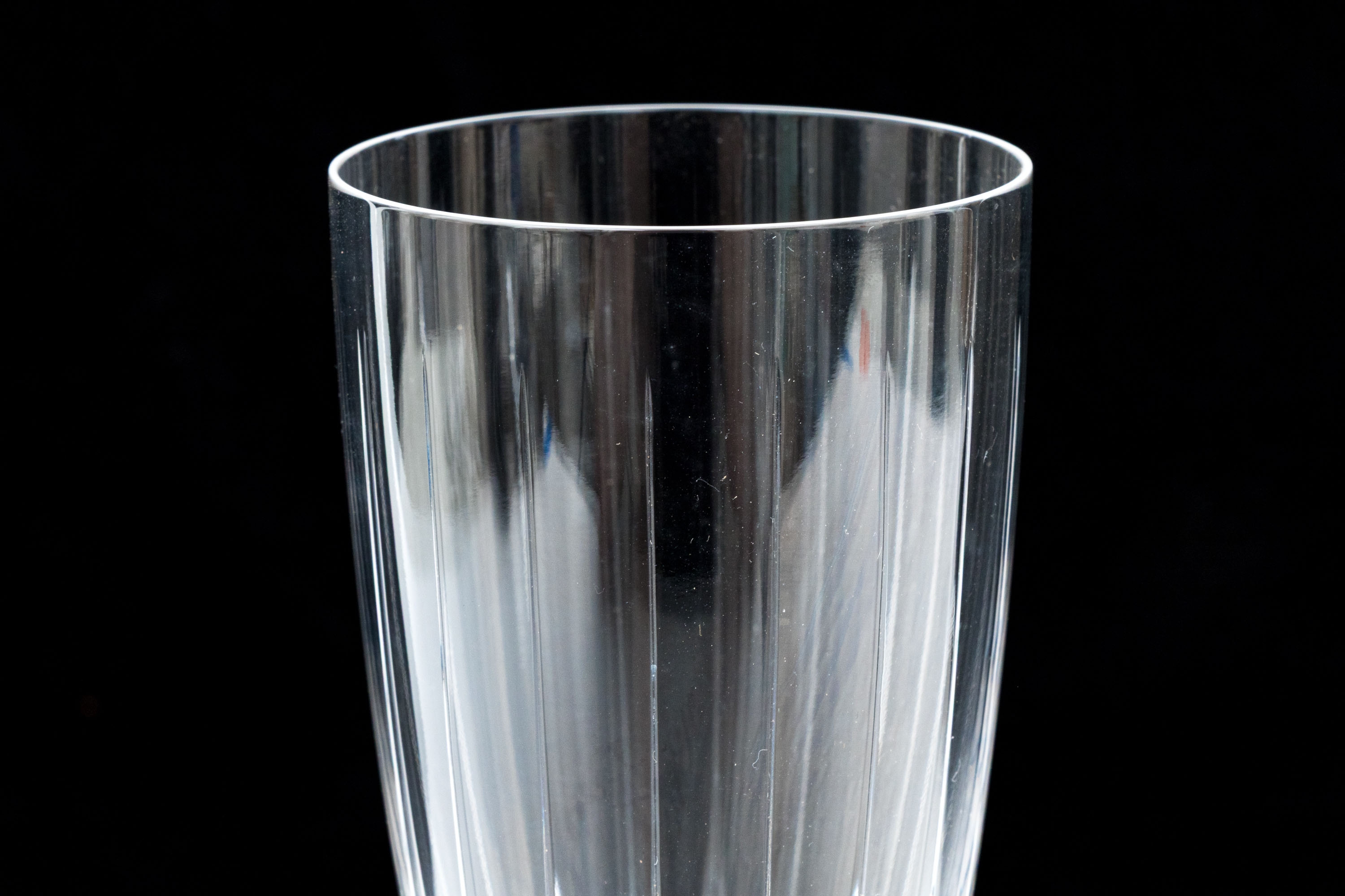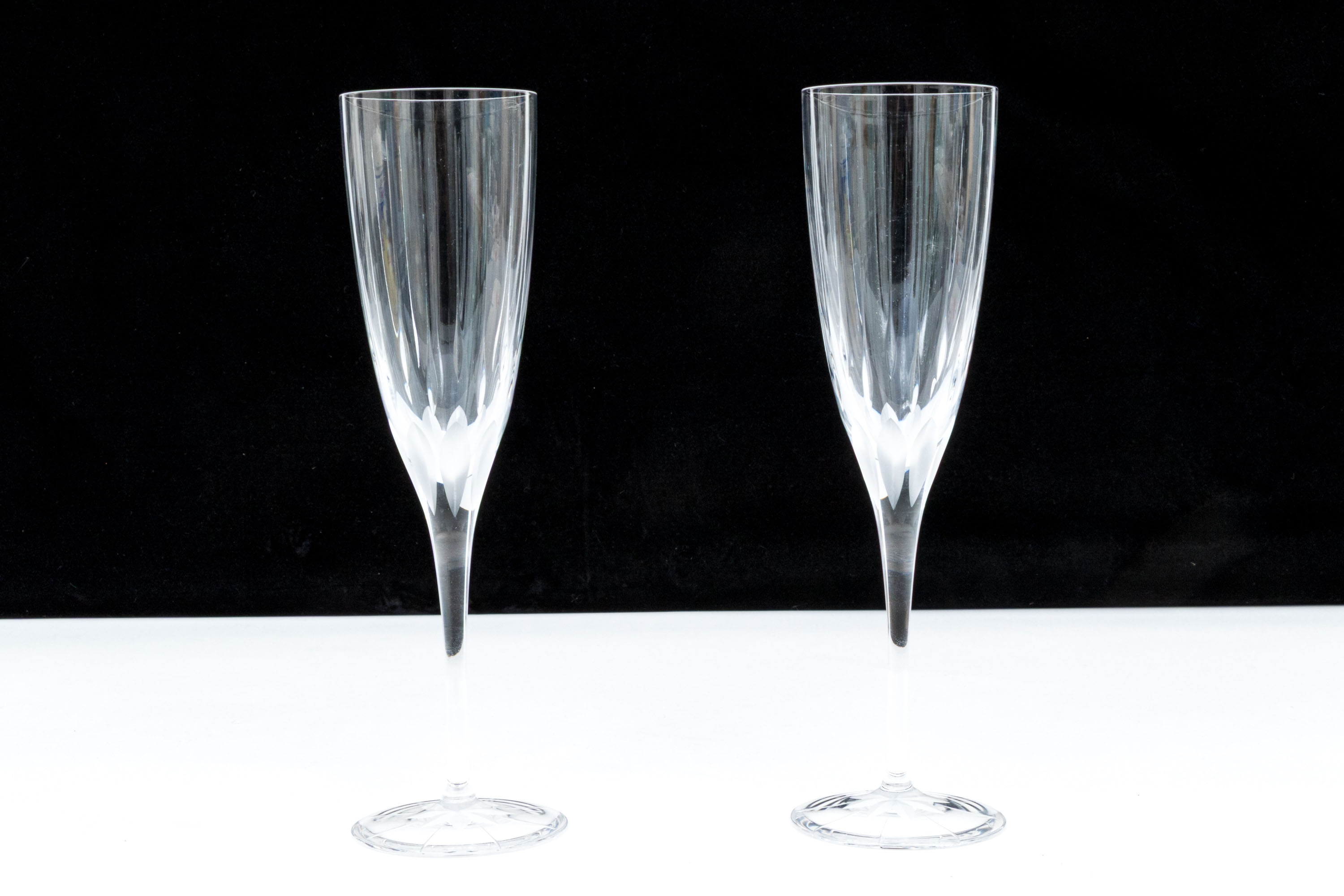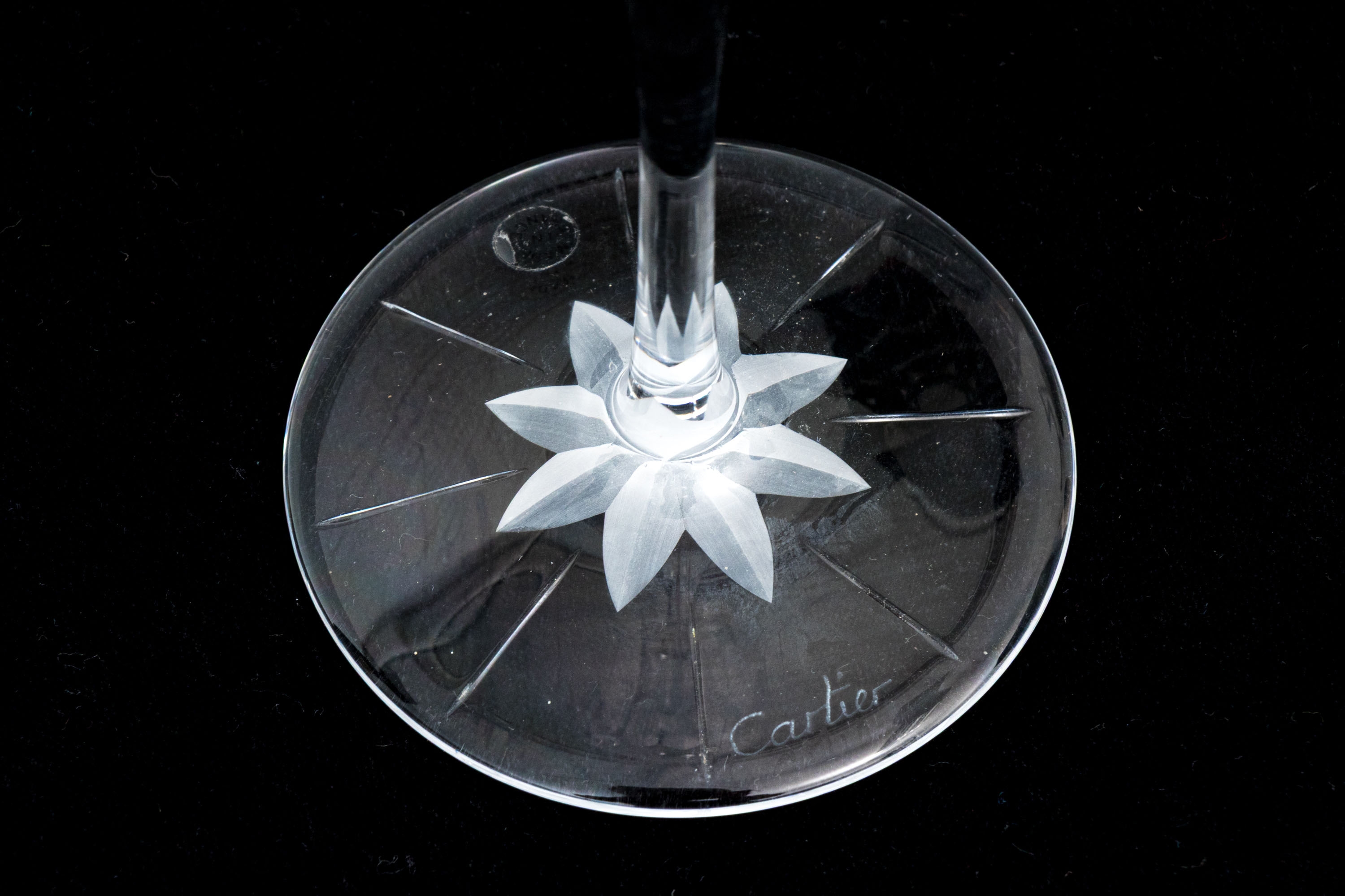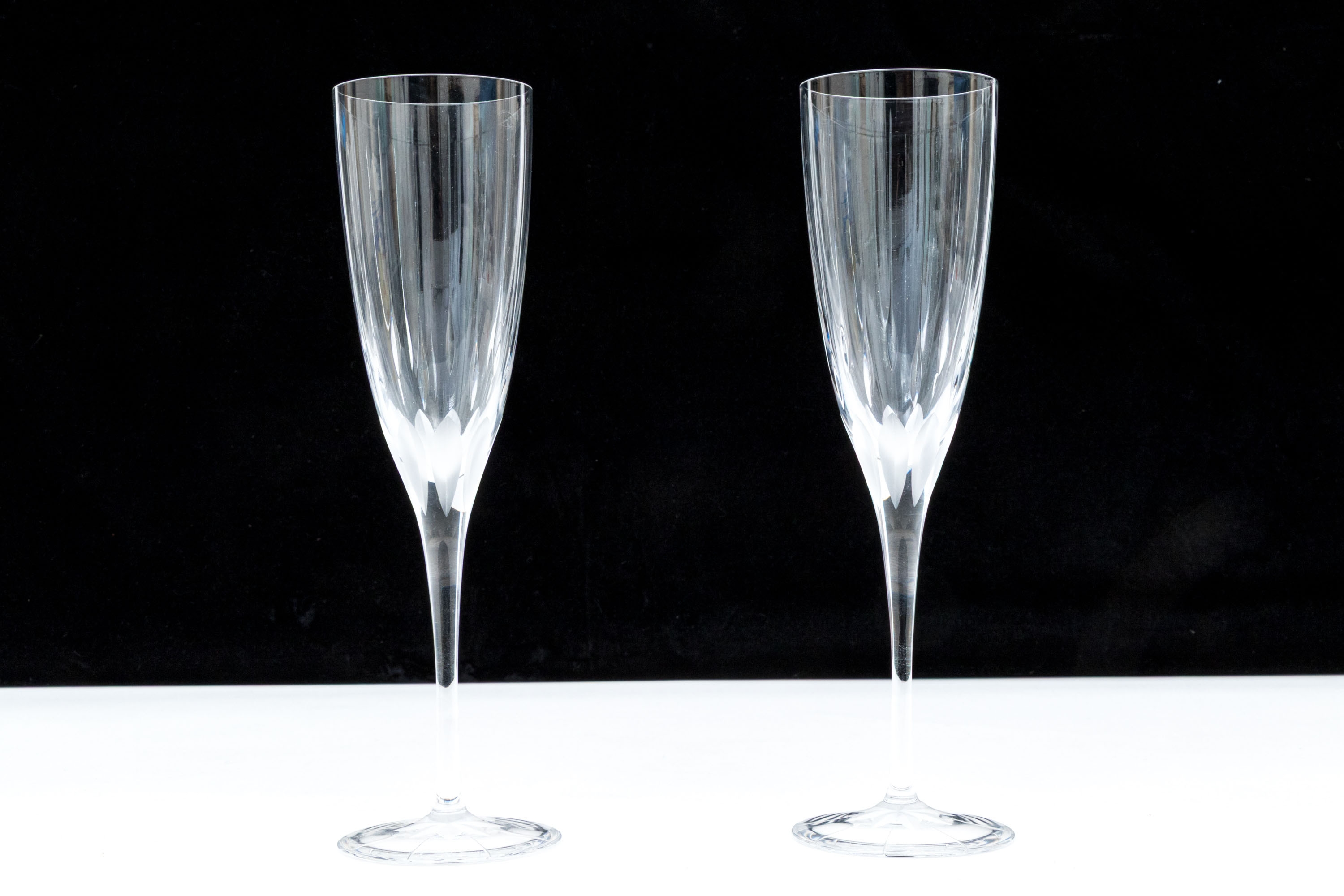 Made in France. Tall flutes with etched ribs and frosted cuts and stars on the feet.