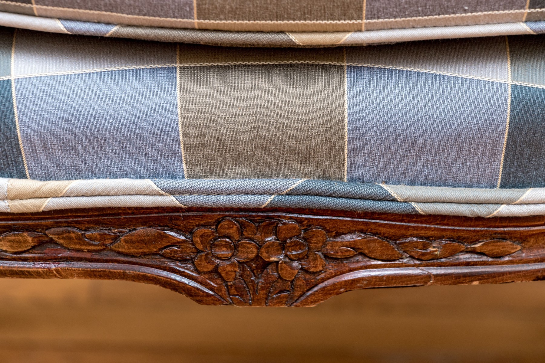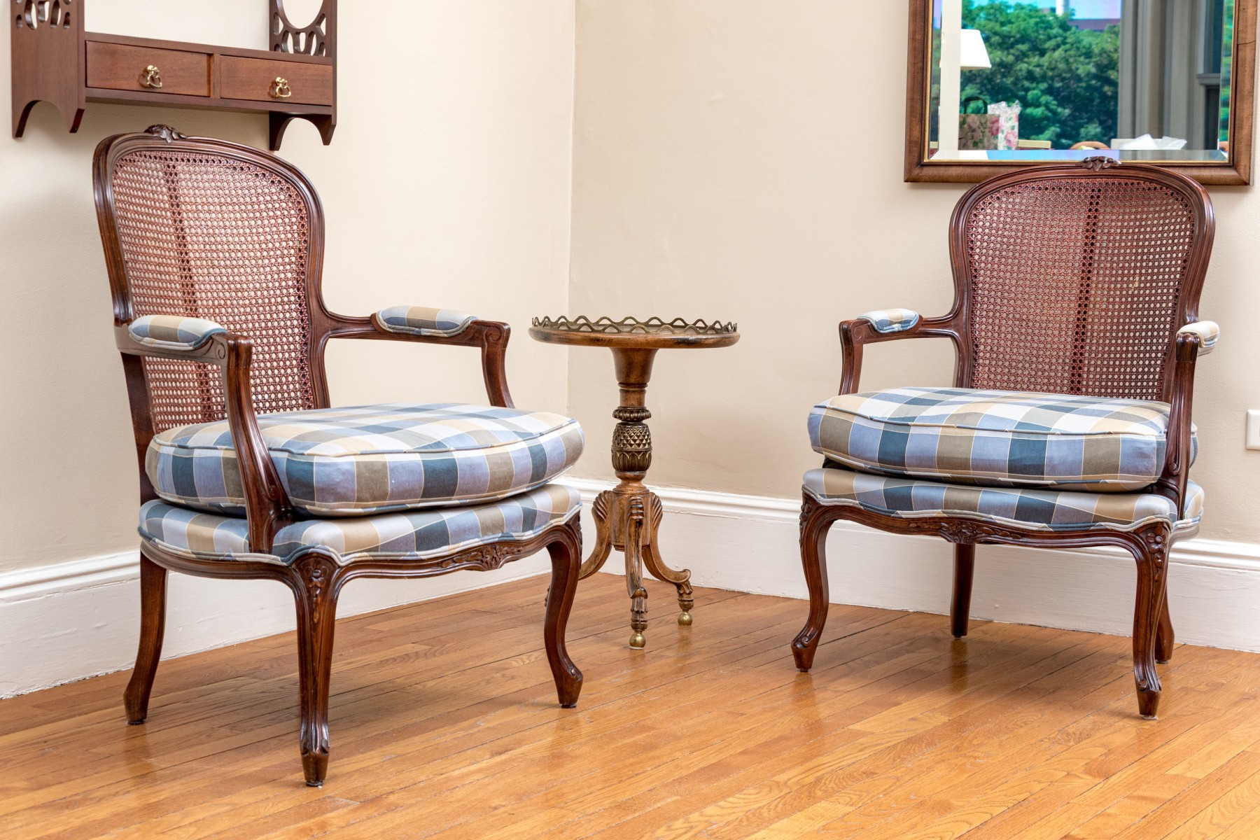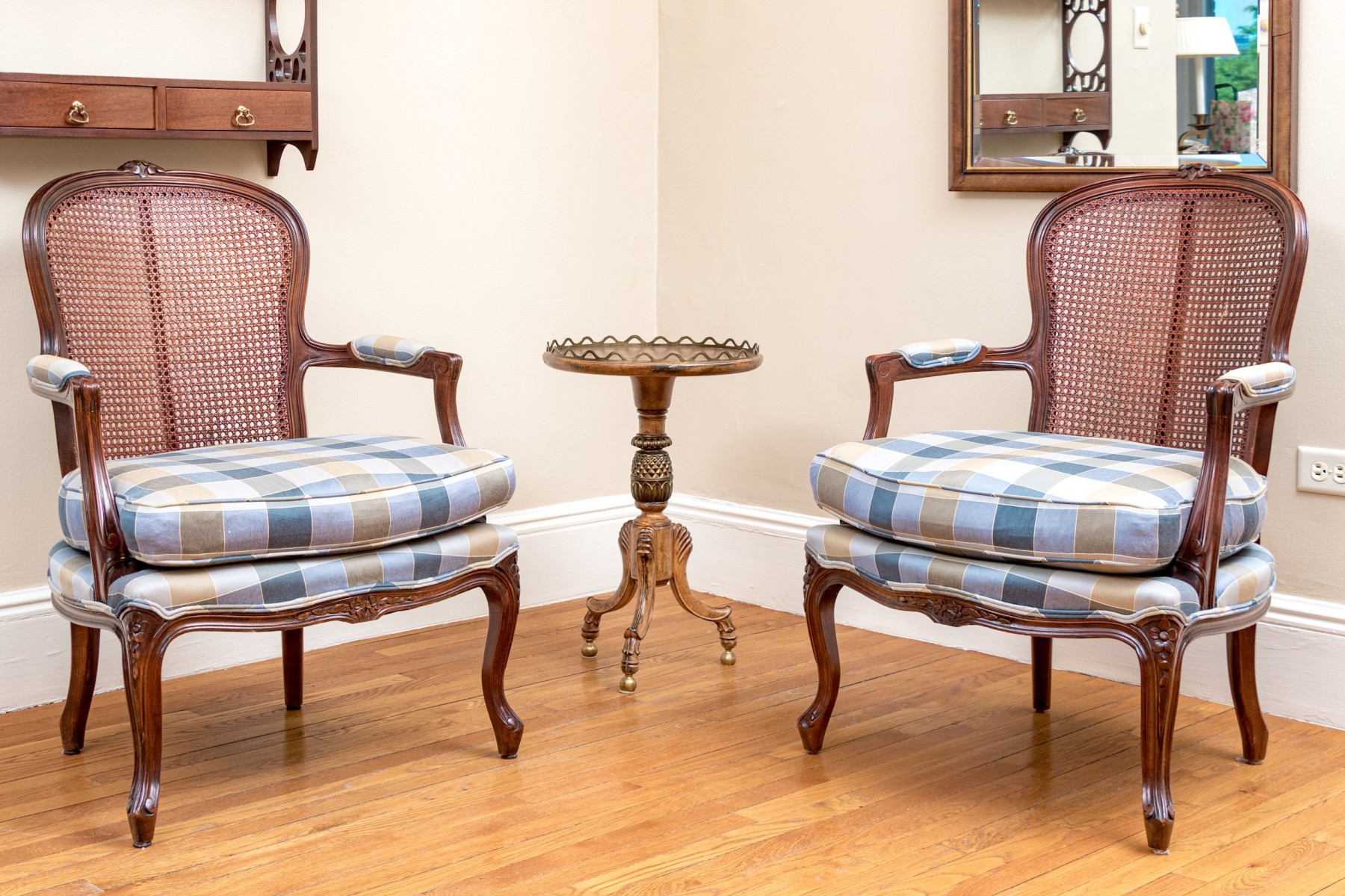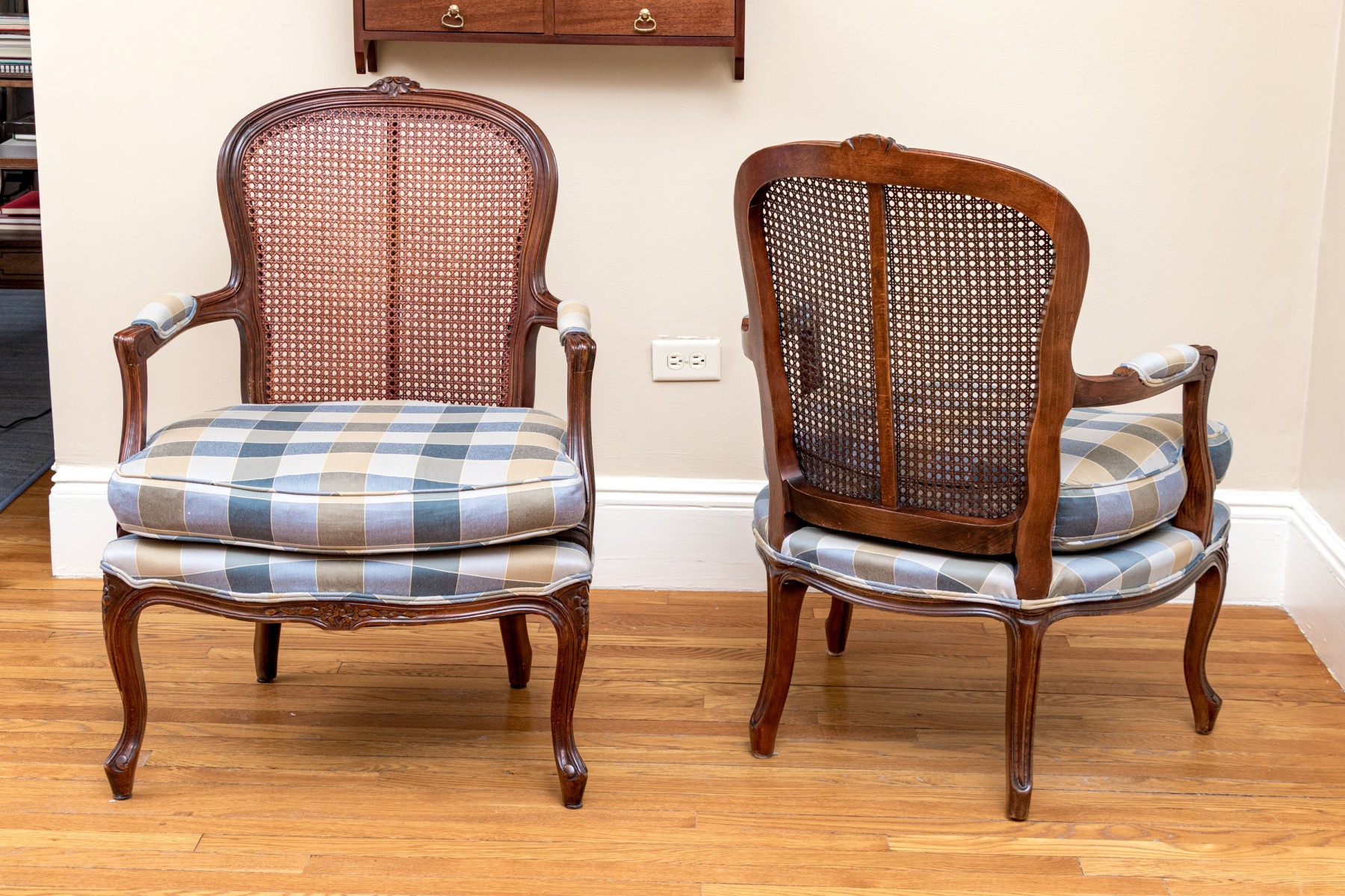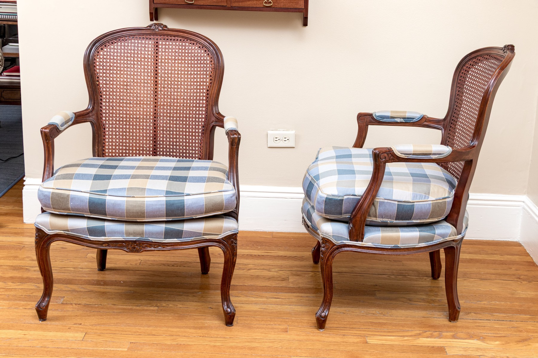 A handsome pair of Louis XV style fauteuils beautifully blending elegant tradition and a touch of modern style. The fauteuils sport rounded and caned backs with carved floral crets, padded arm rests with carved scroll fronts, and loose seat cushions upholstered in fabulous blue, beige, and white buffalo plaid. Nicely carved across serpentine aprons and raised over cabriole front legs with floral carving down the knees.