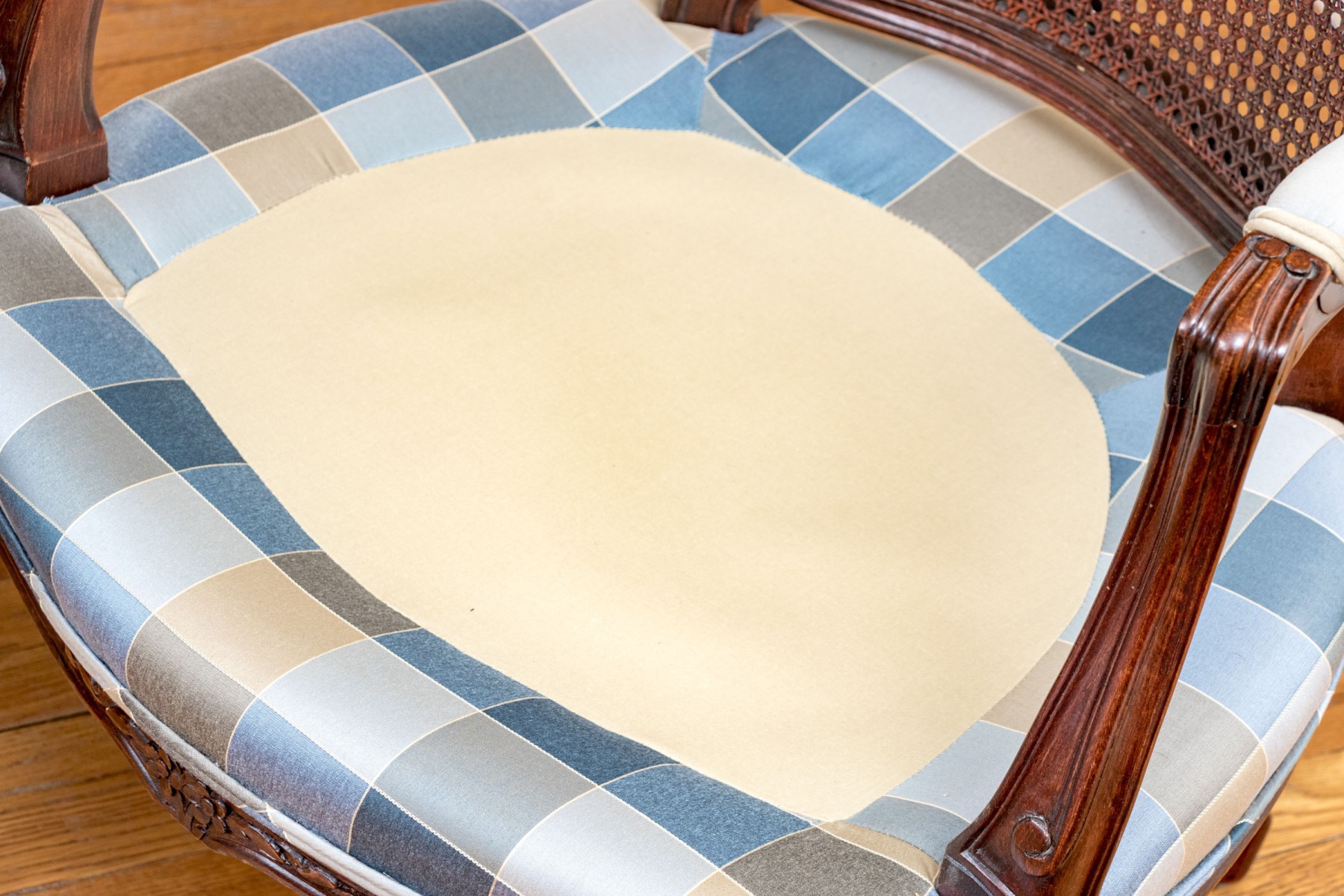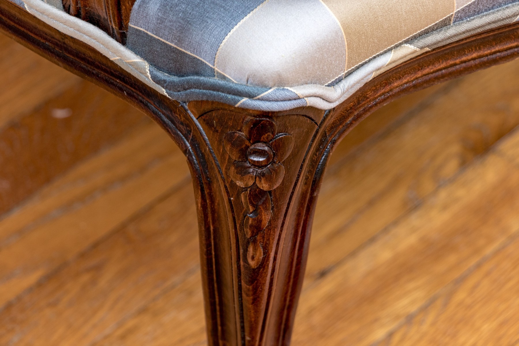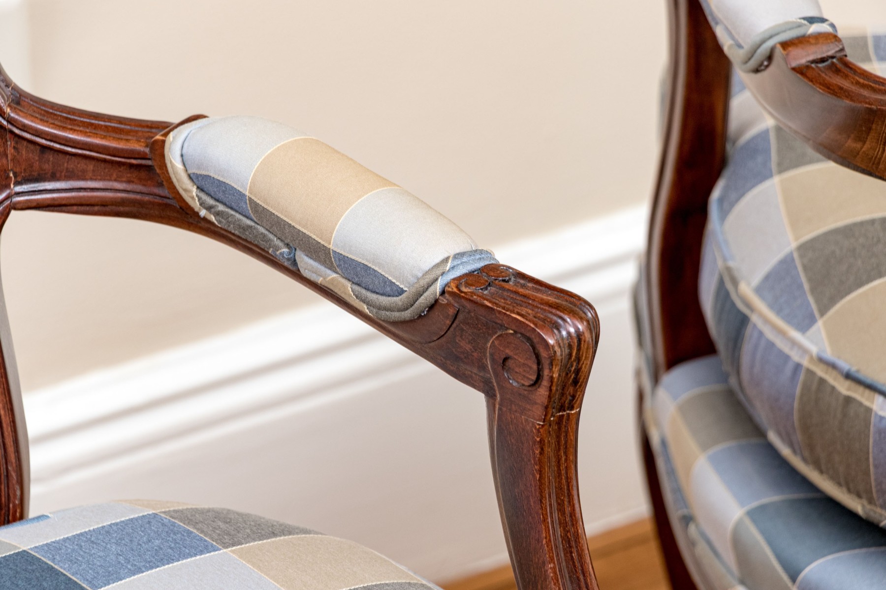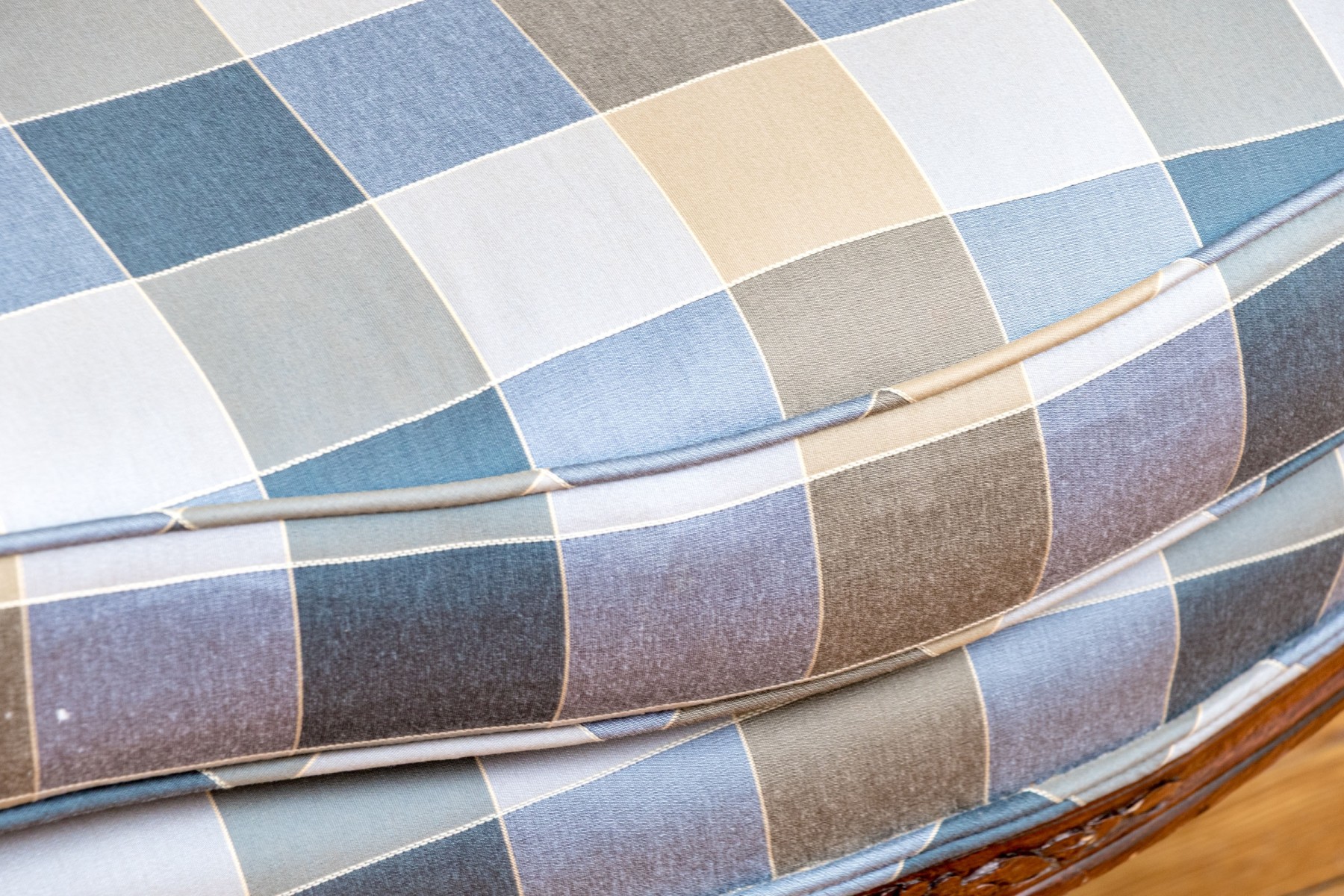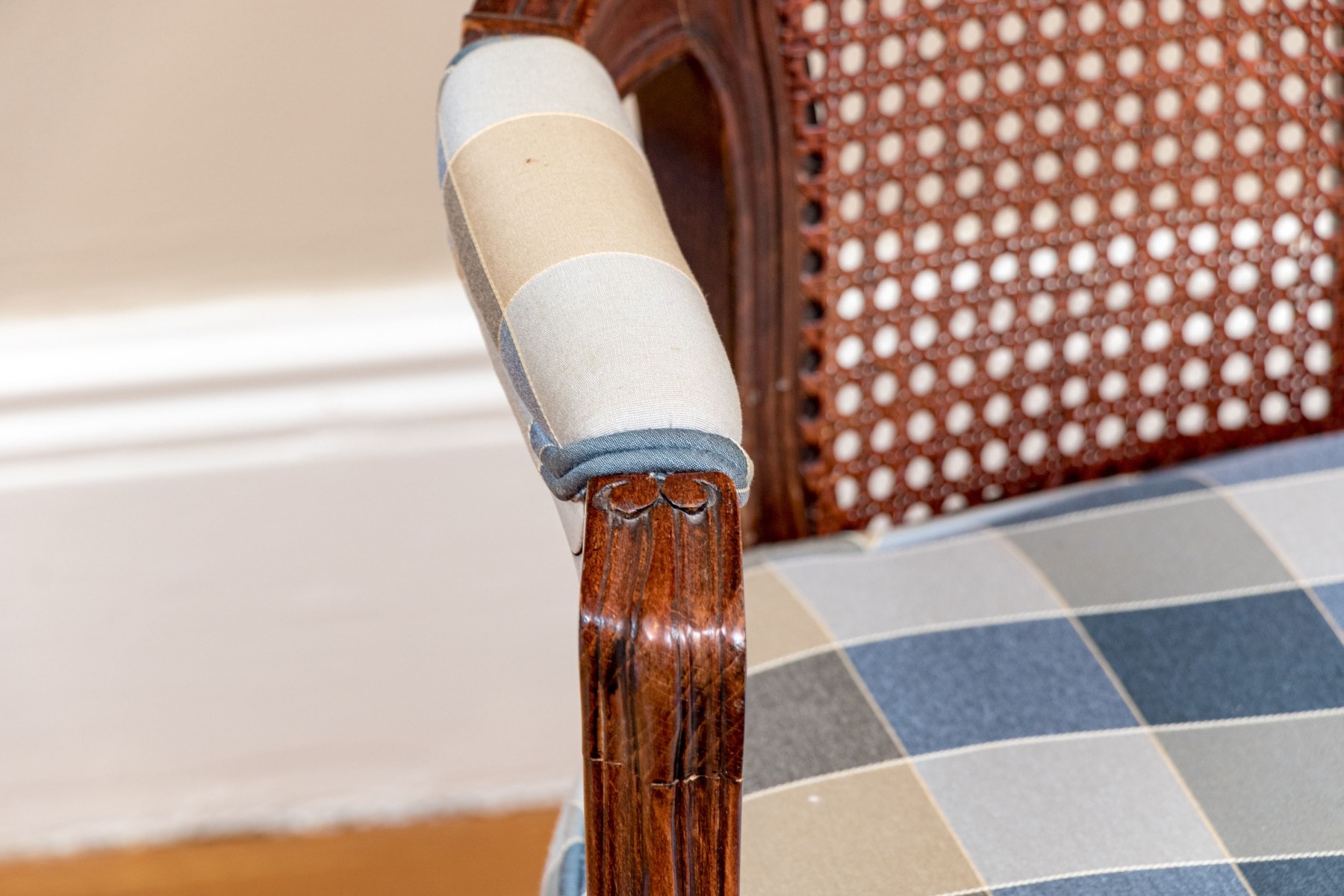 A handsome pair of Louis XV style fauteuils beautifully blending elegant tradition and a touch of modern style. The fauteuils sport rounded and caned backs with carved floral crets, padded arm rests with carved scroll fronts, and loose seat cushions upholstered in fabulous blue, beige, and white buffalo plaid. Nicely carved across serpentine aprons and raised over cabriole front legs with floral carving down the knees.