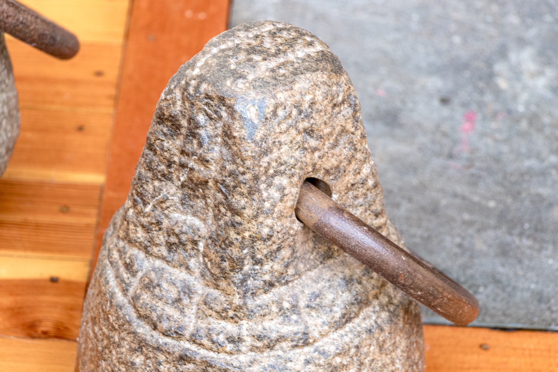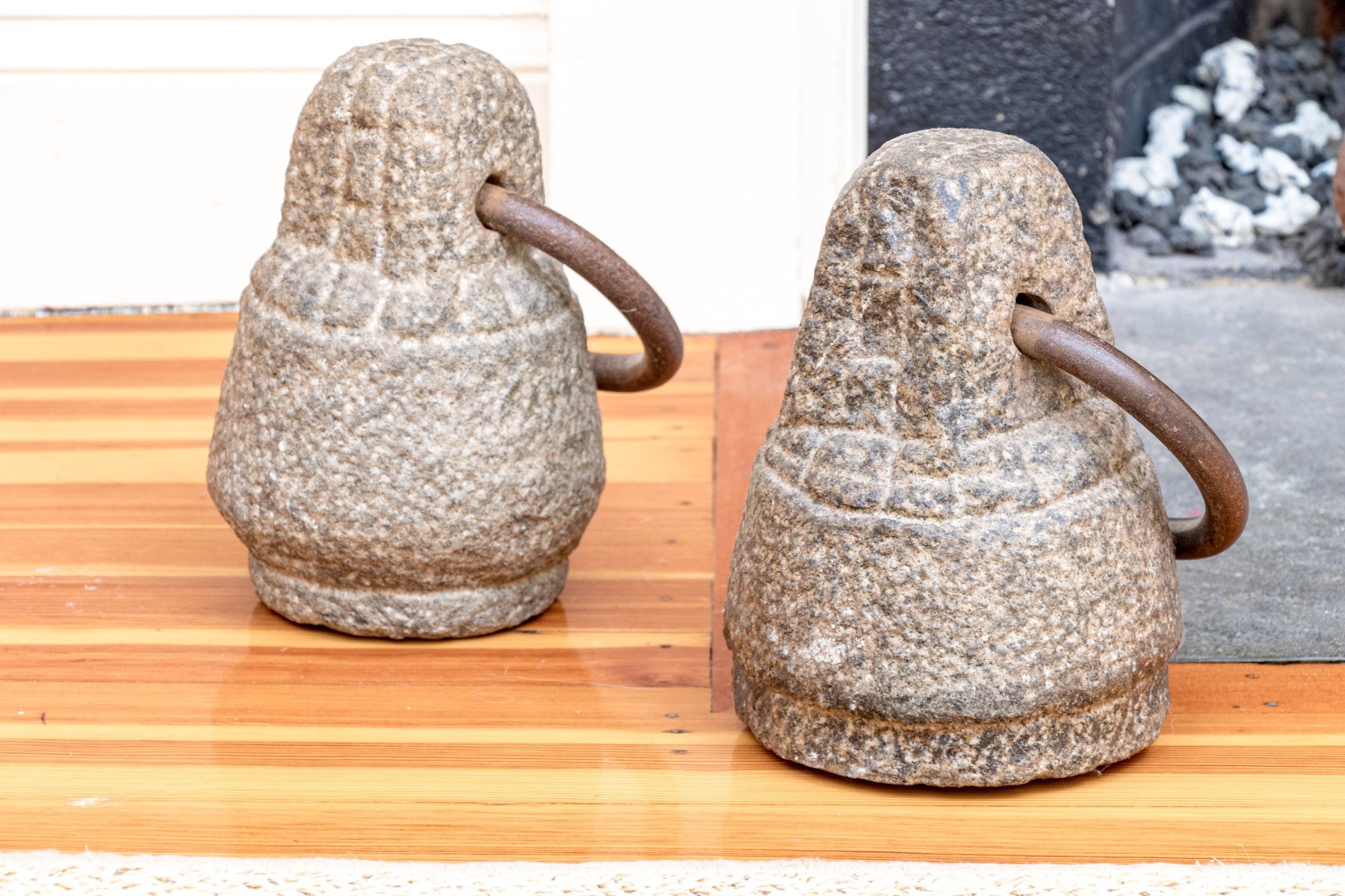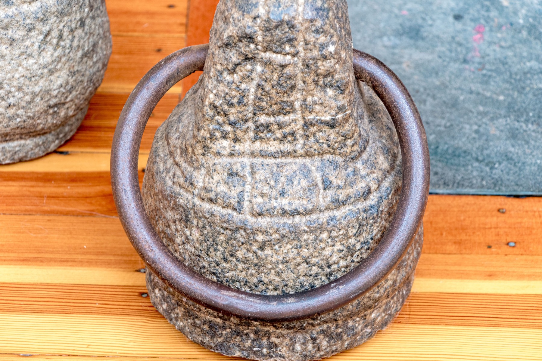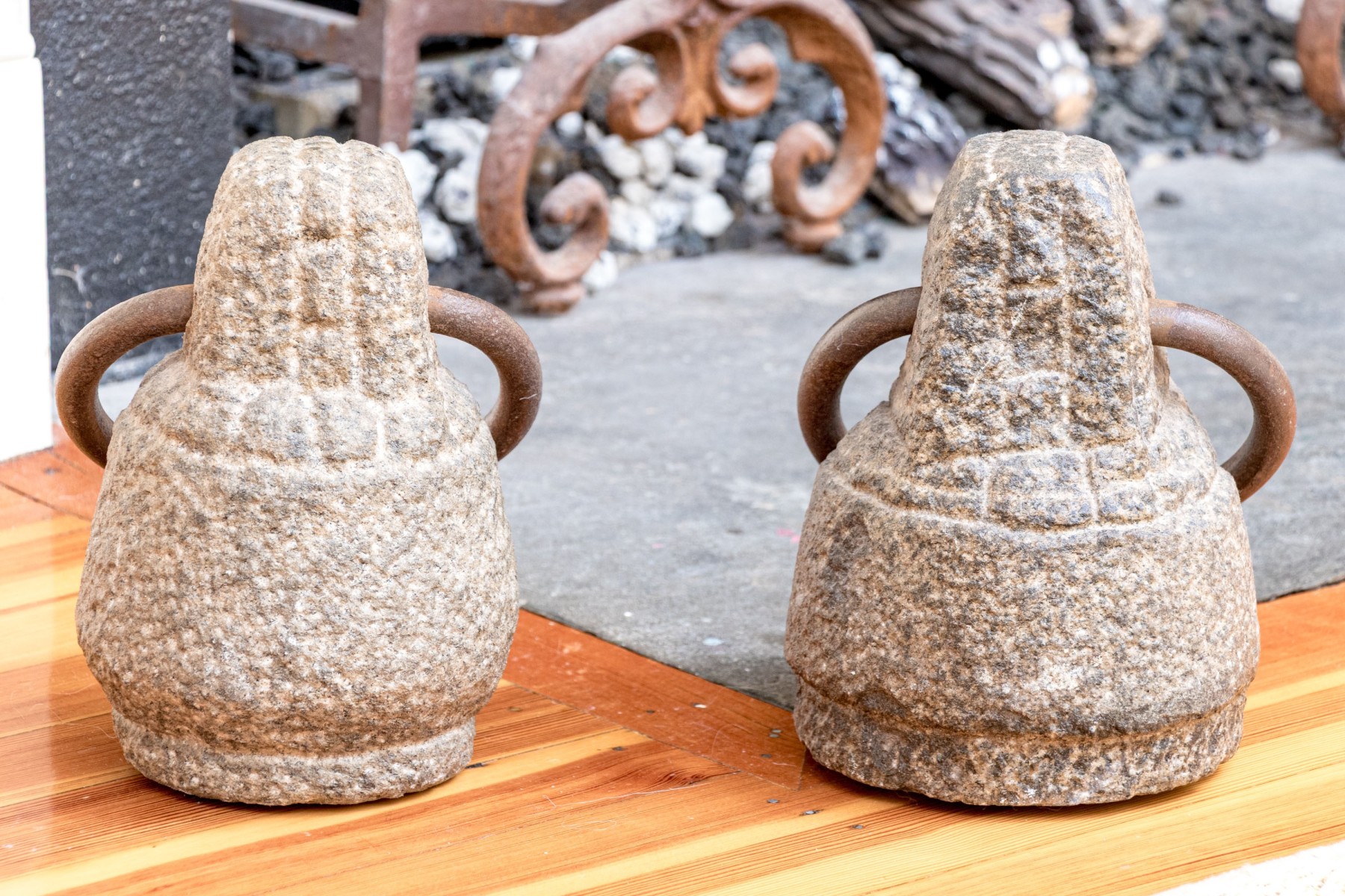 Each with carved stone bodies with ovoid lower bodies and bottle form squared necks with pierced holes through the side for 6 7/8" Dia. Iron ring handles through the tops.