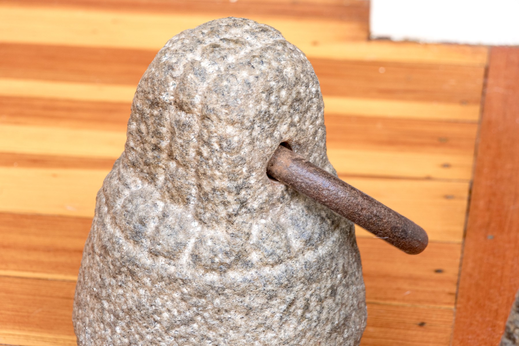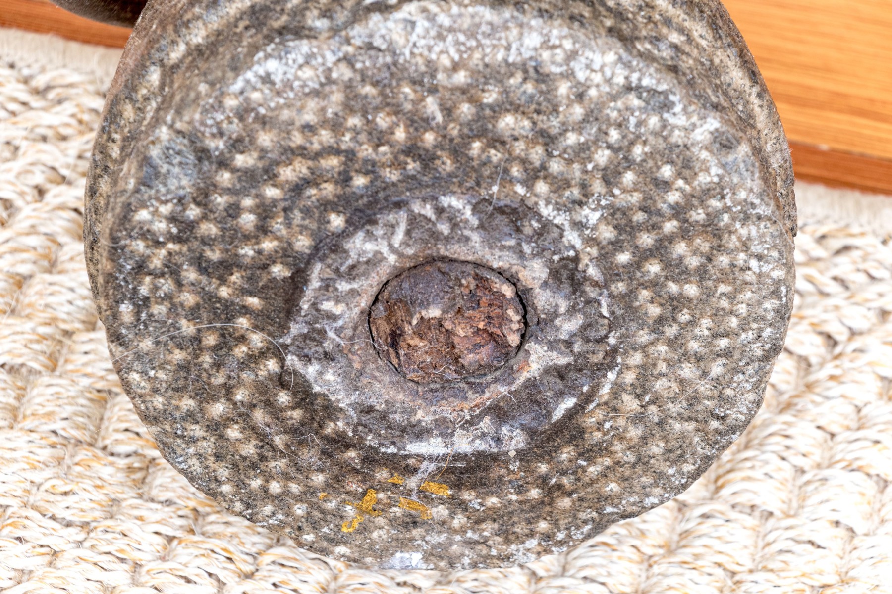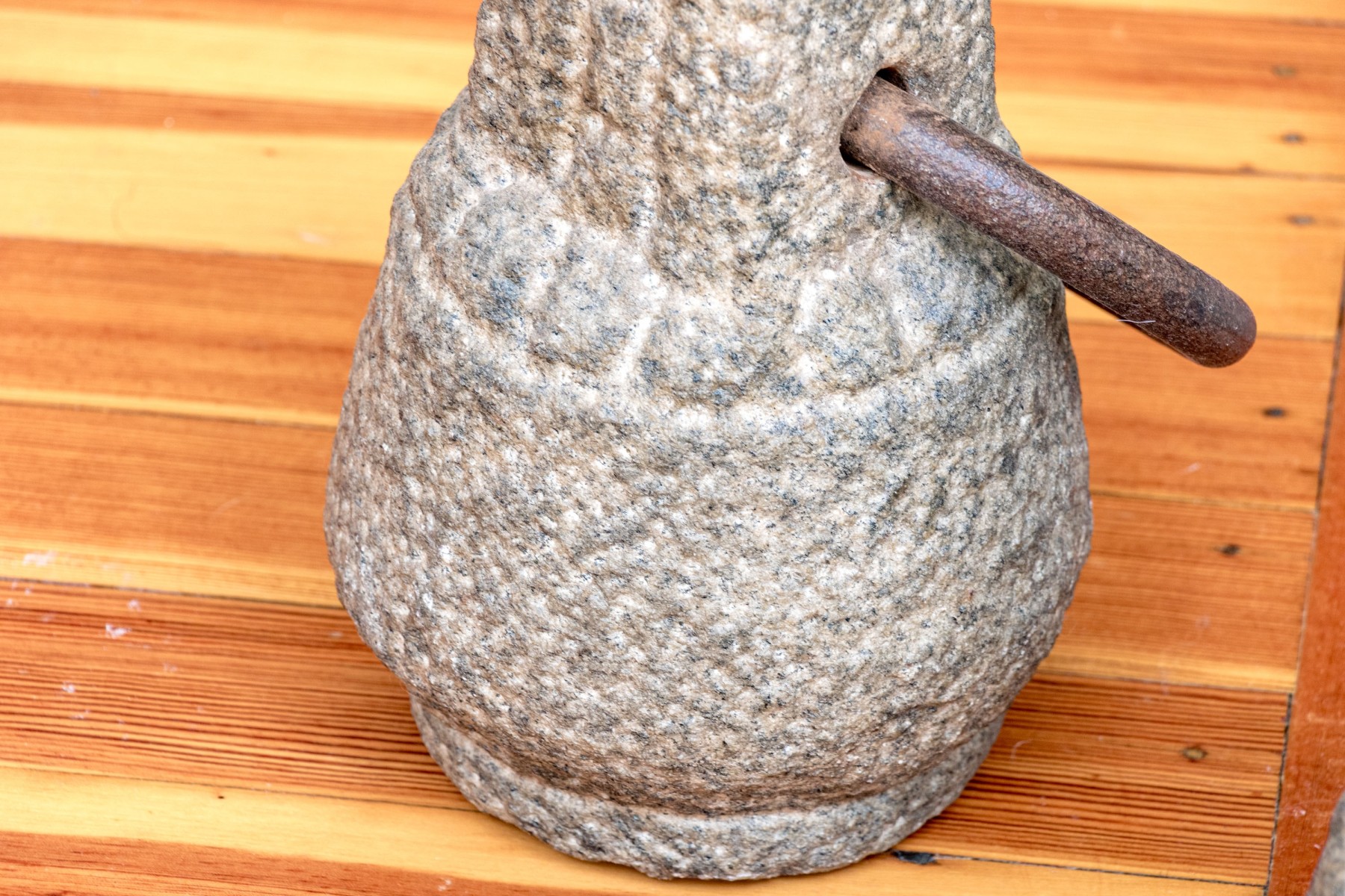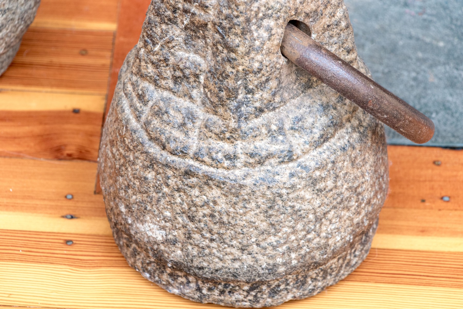 Each with carved stone bodies with ovoid lower bodies and bottle form squared necks with pierced holes through the side for 6 7/8" Dia. Iron ring handles through the tops.