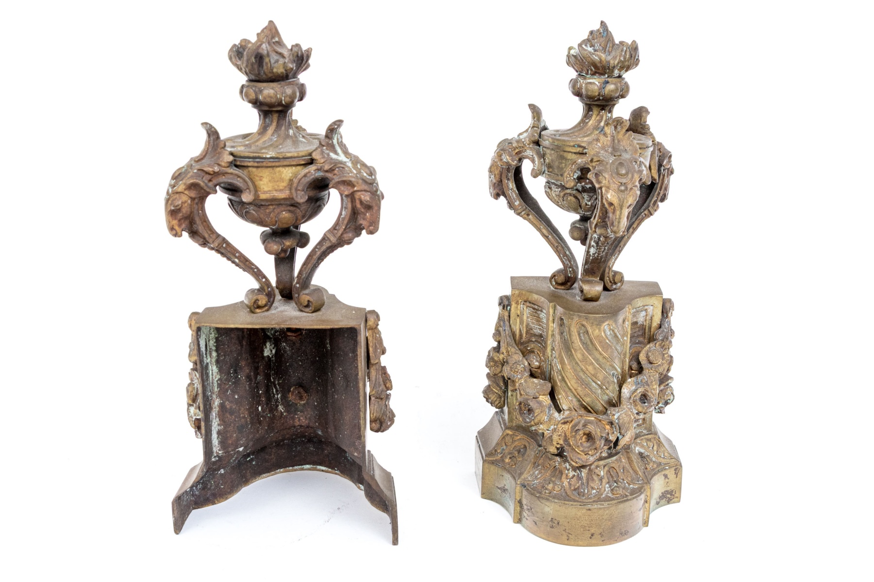 A stylish pair of cast chenets decorated with flame form finials and floral swags.