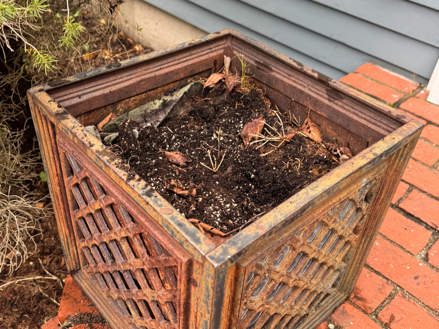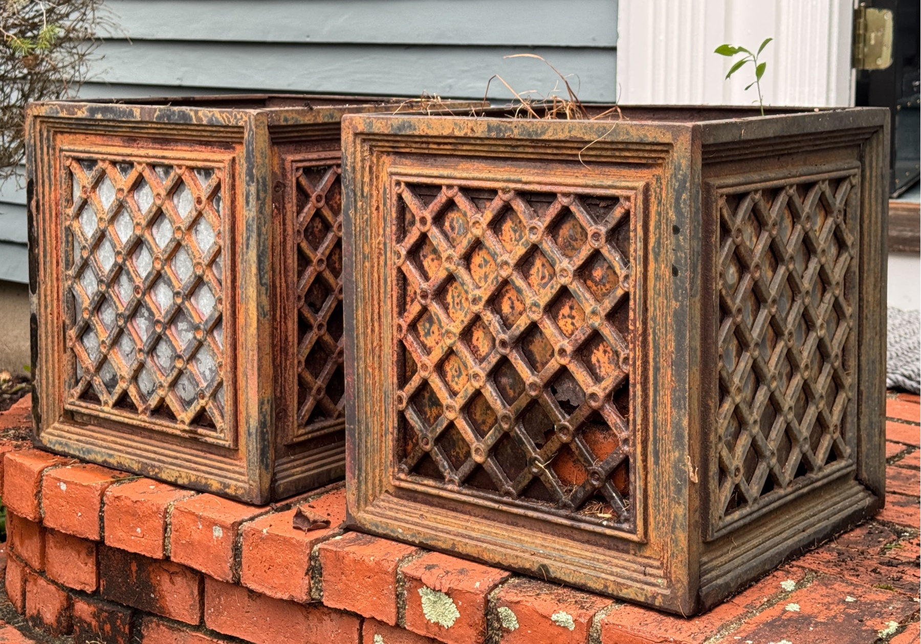 A delightful pair of semi-antique cast iron planters patianed to a gorgeous rustic finish with square forms and panels of relief lattices detailed with stepped borders around the edges.