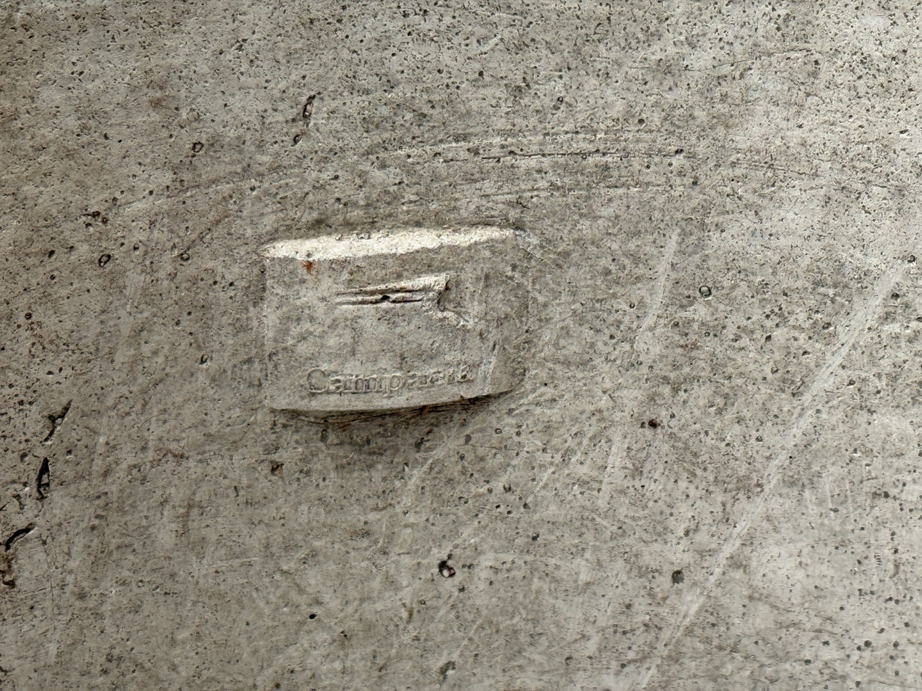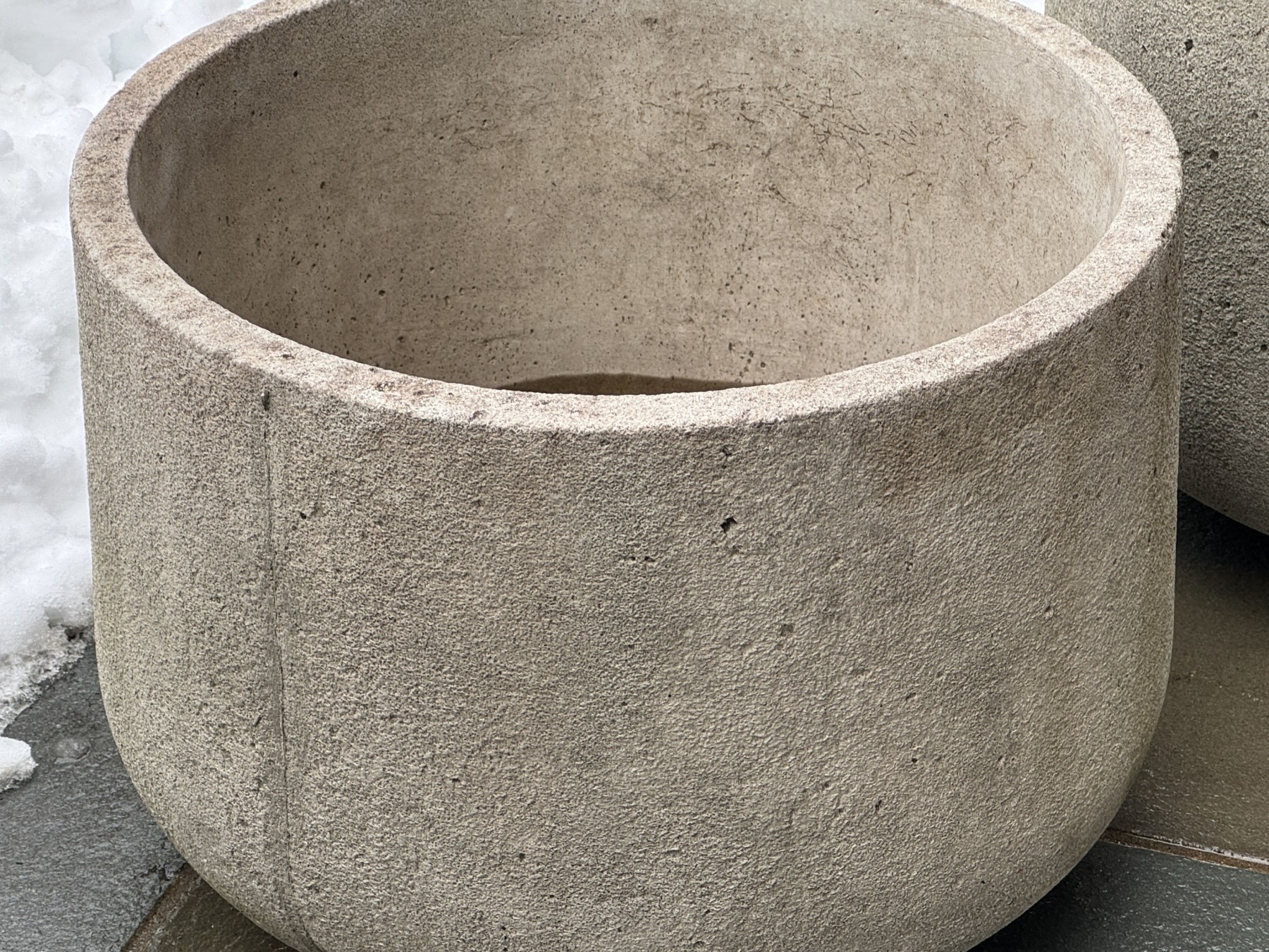 A wonderful pair of cast stone garden planters with sleek, Brutalist bowl forms making for impactful, simple designs.
