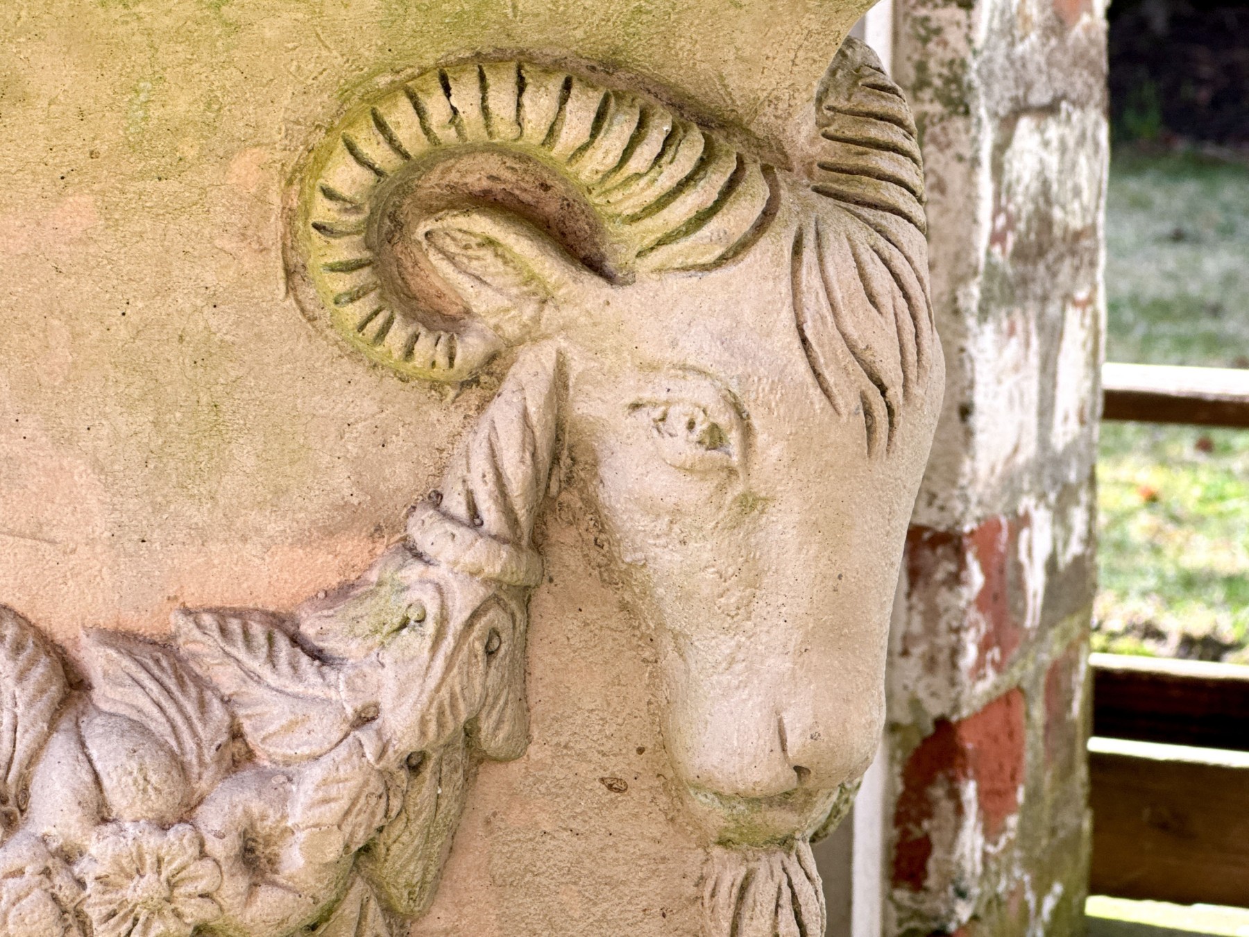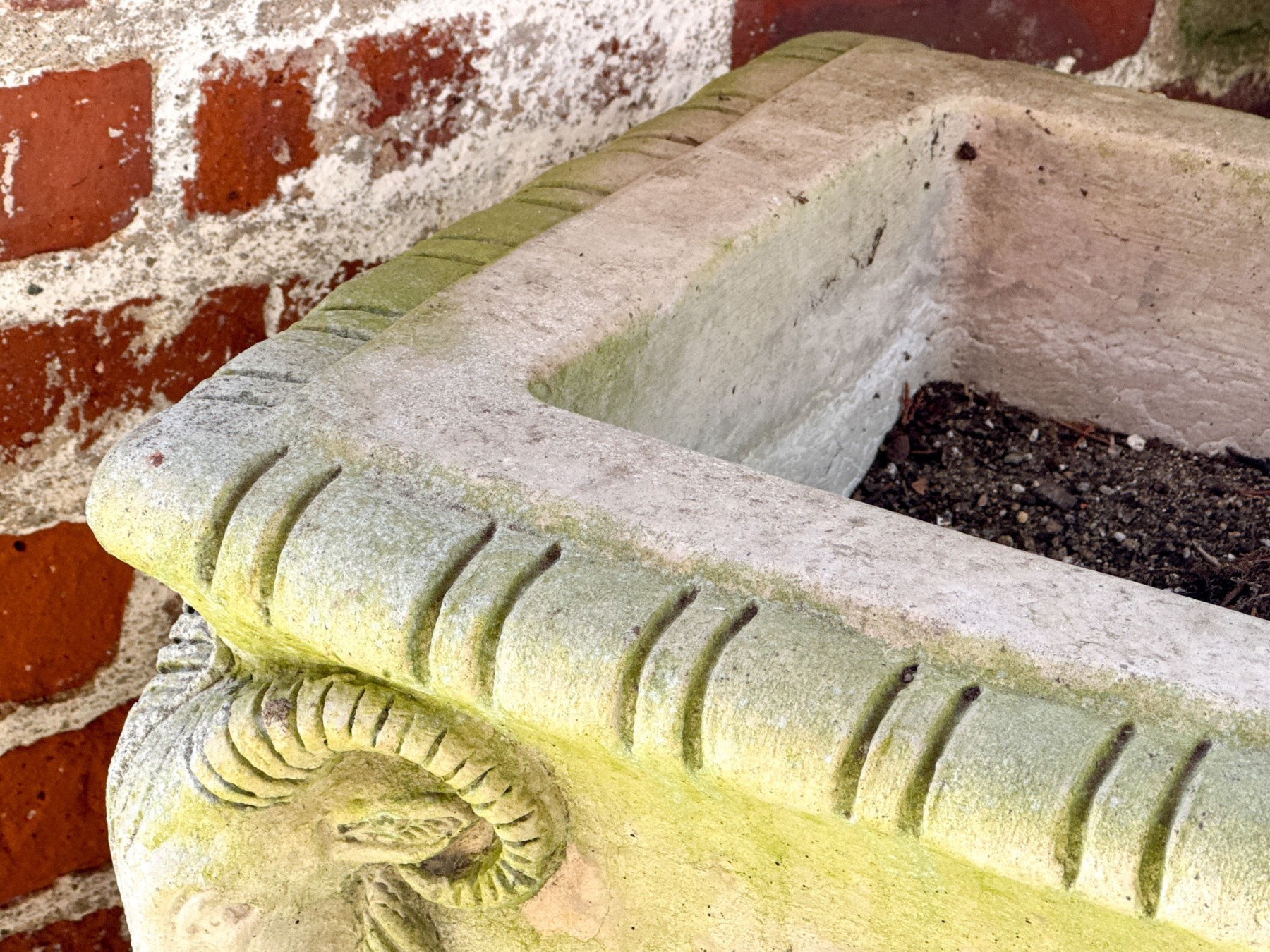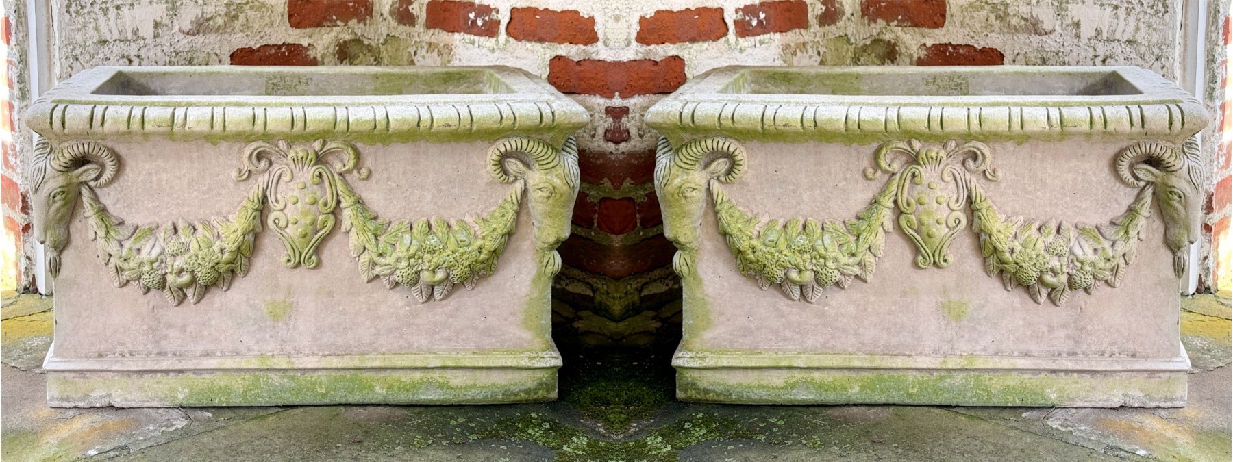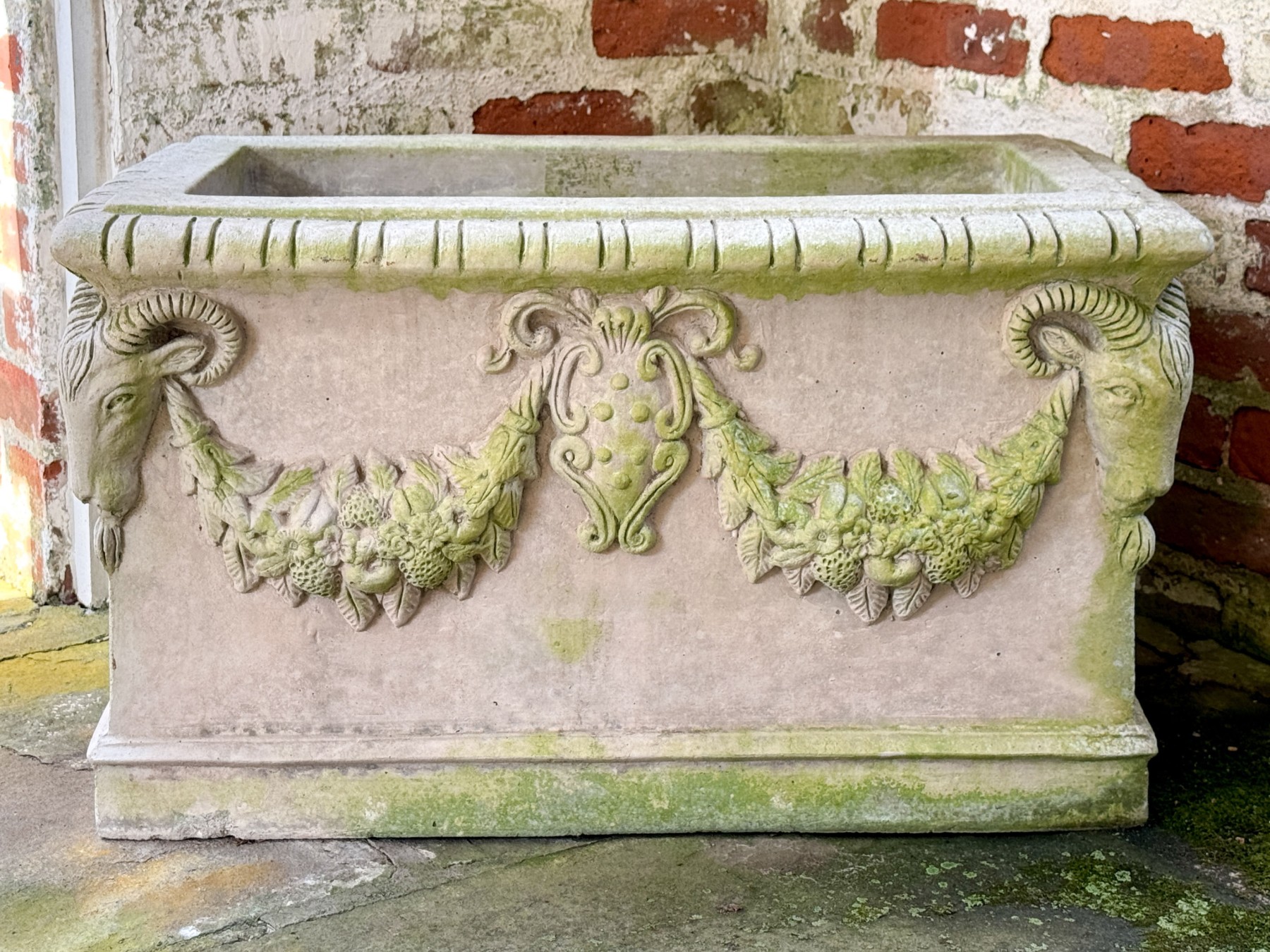 An elegant pair of cast stone garden planters in rectangular form with great neoclassical appeal. Planters sport everted rims and stunning sculptural rams heads at the corners with foliate swags across the sides.