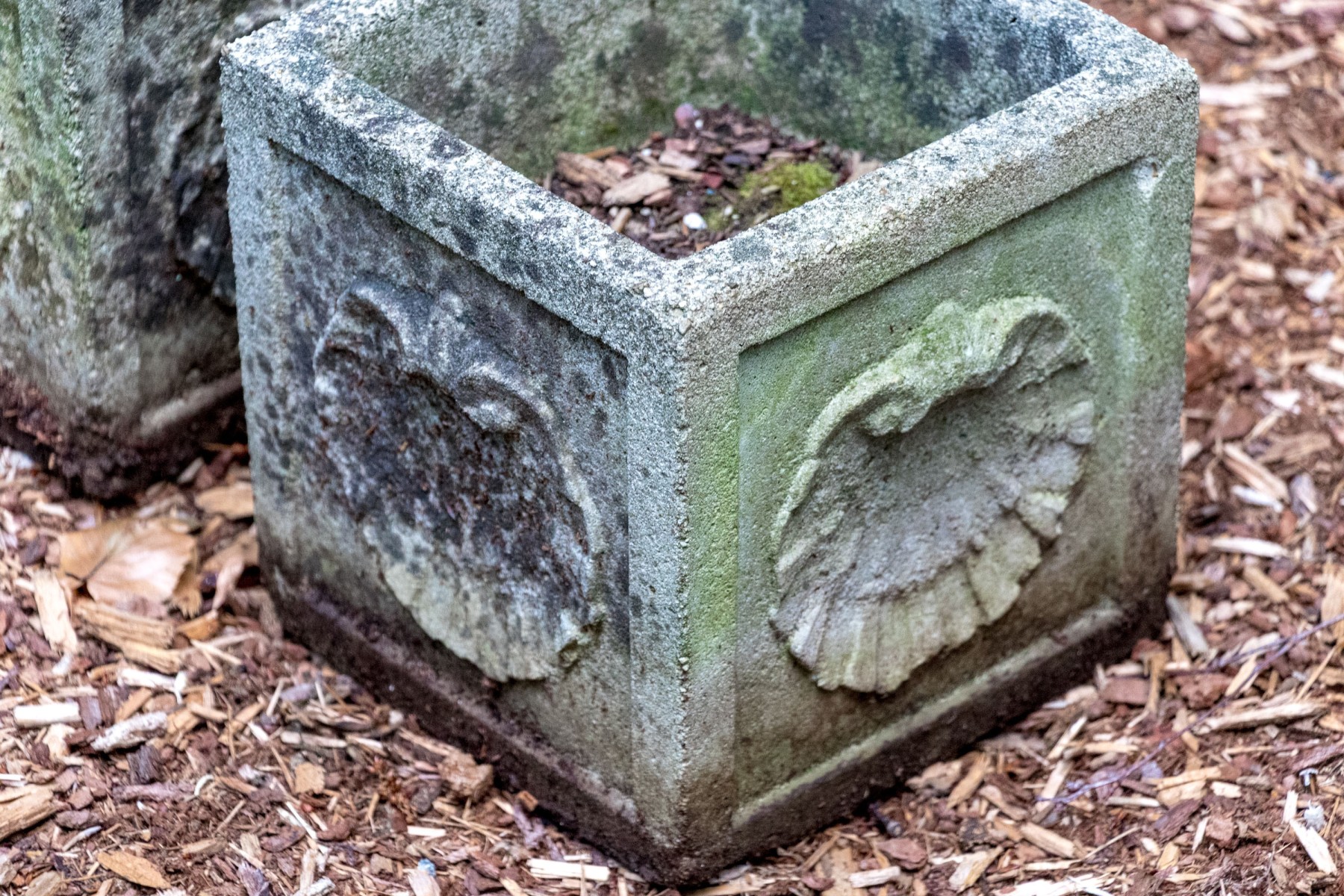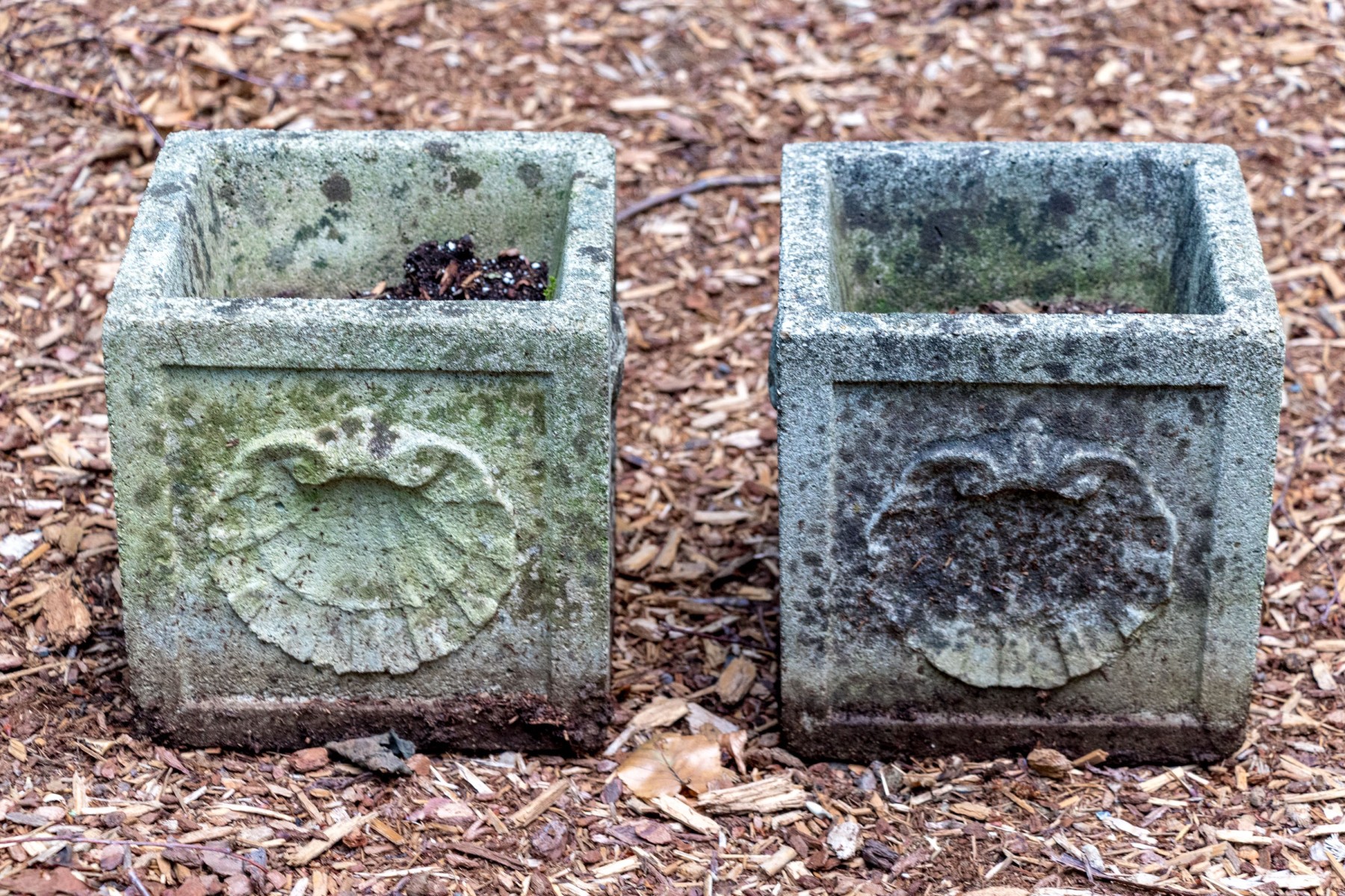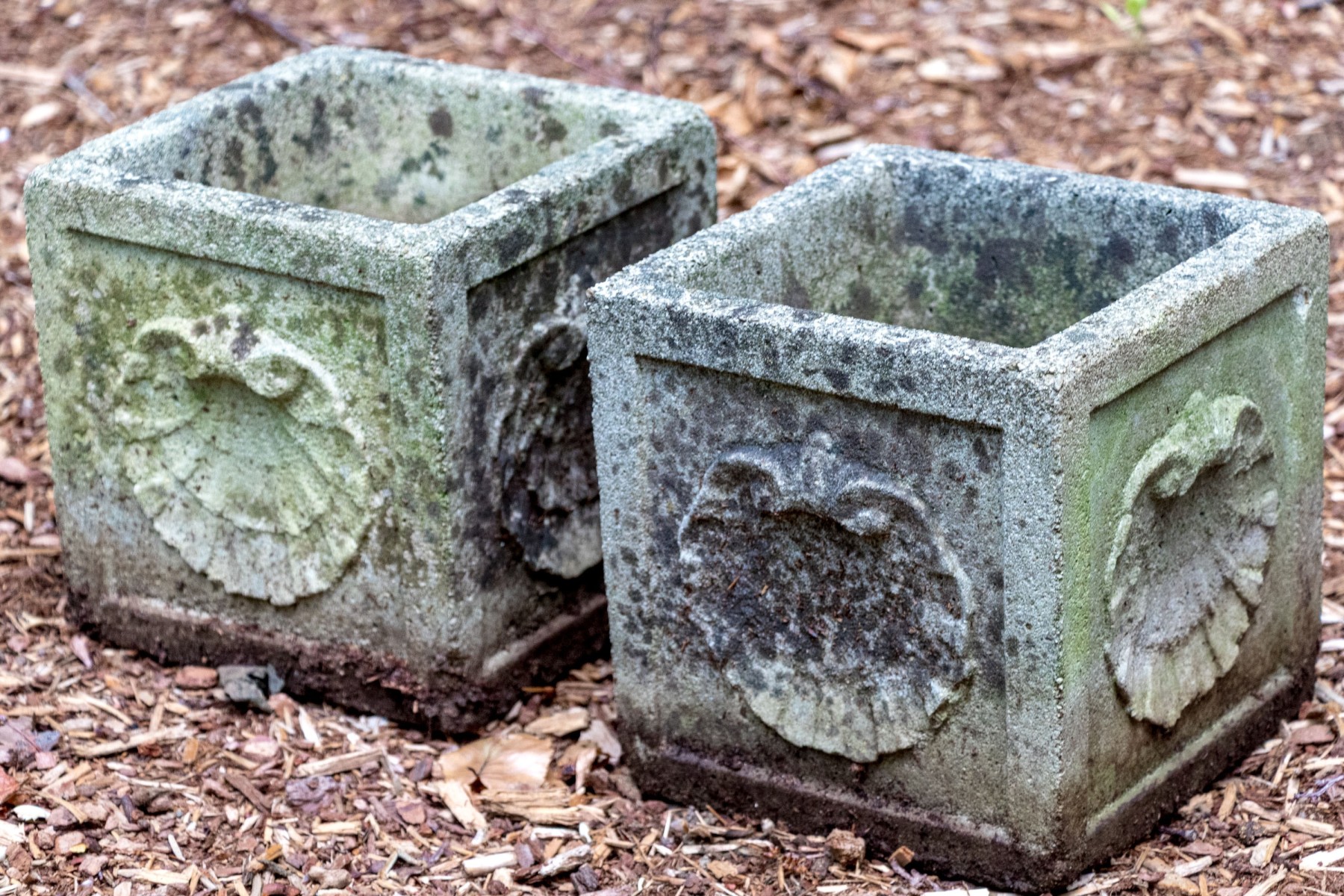 A fabulous pair of cast stone garden planters in square form with gorgeous circular shell medallions in low relief on the sides.