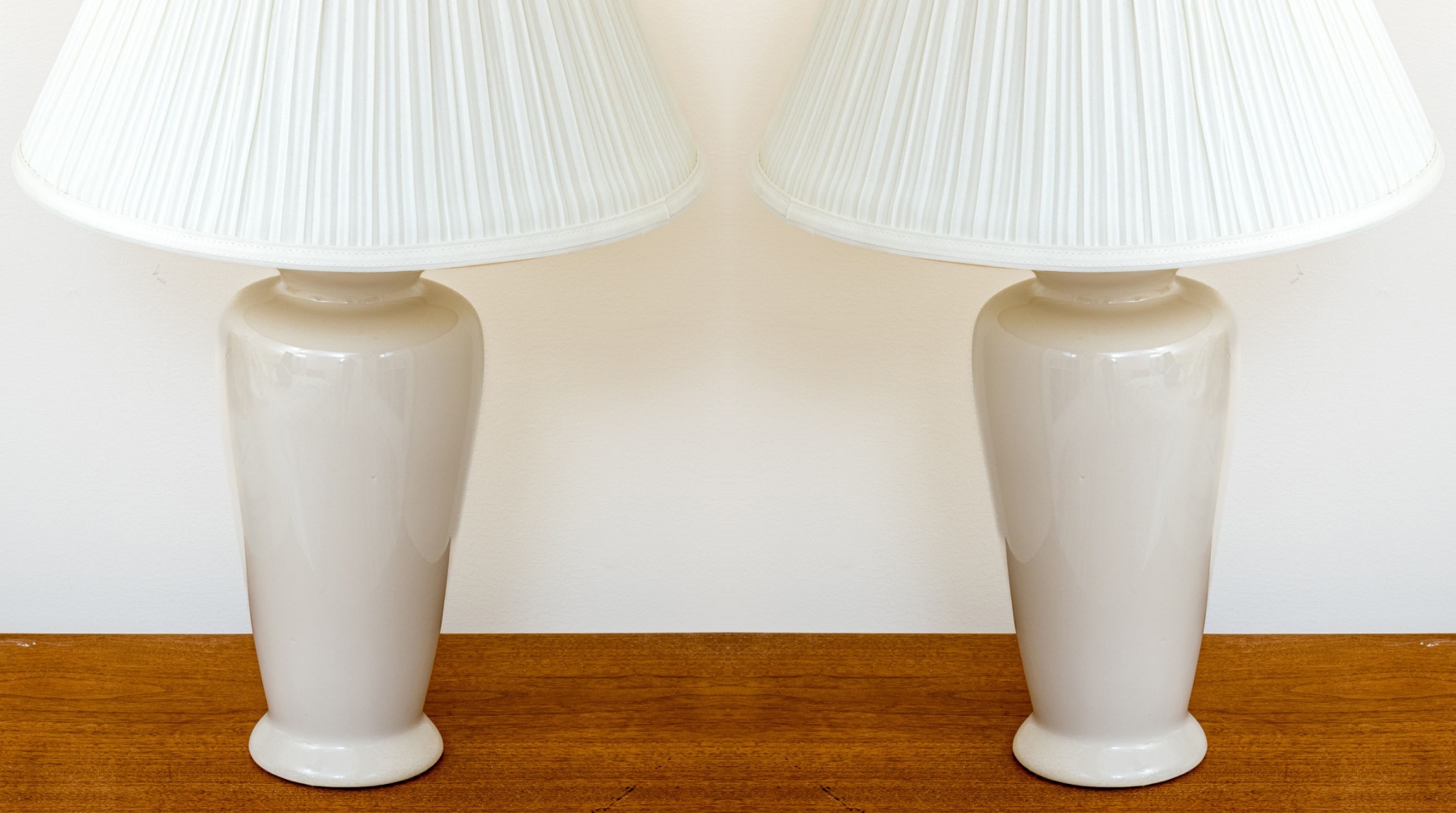 A contemporary pair of ceramic table lamps featuring cream white glazed baluster vase form bodies with flared circular bases surmounted by pleated white empire shades.