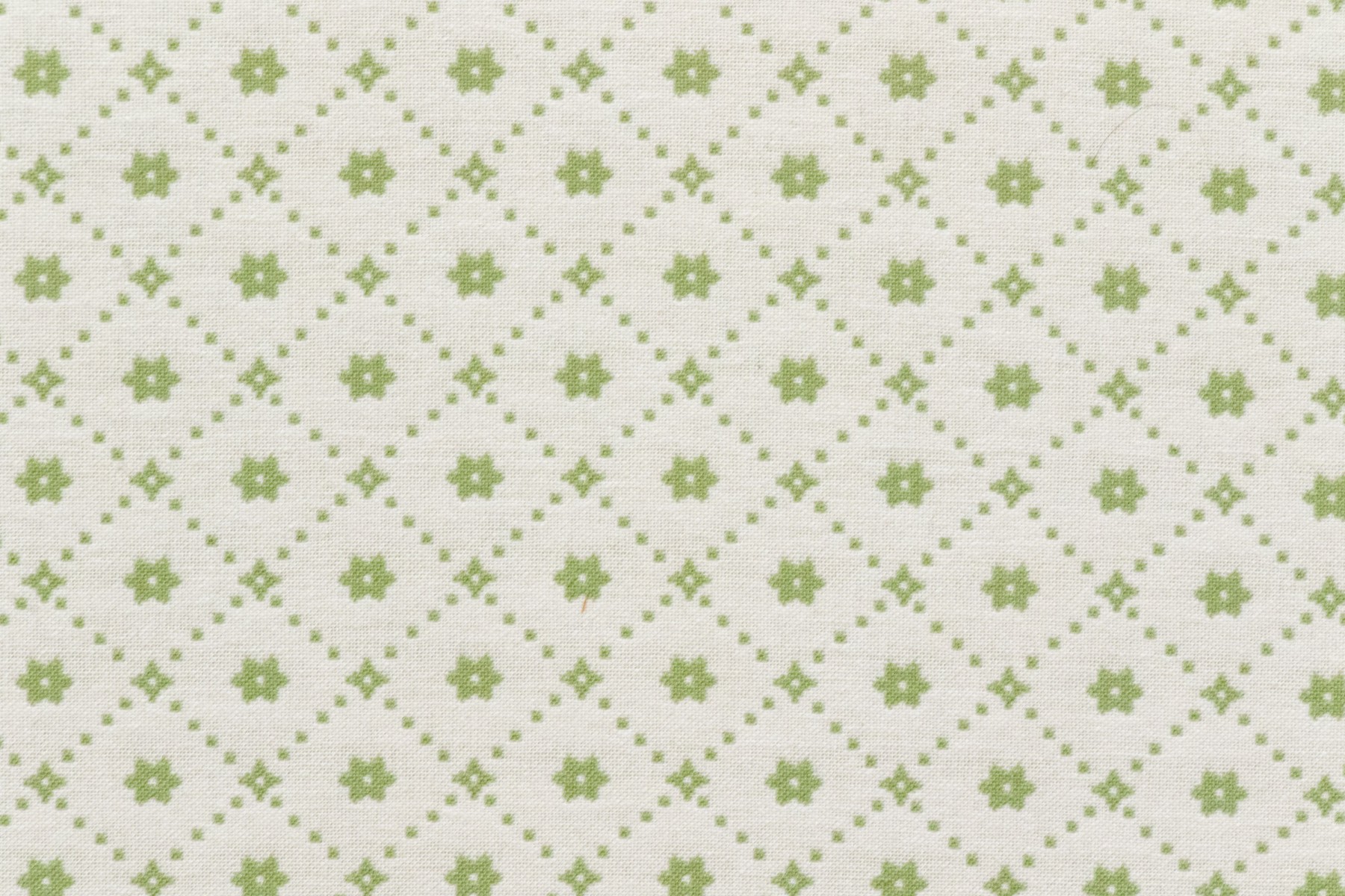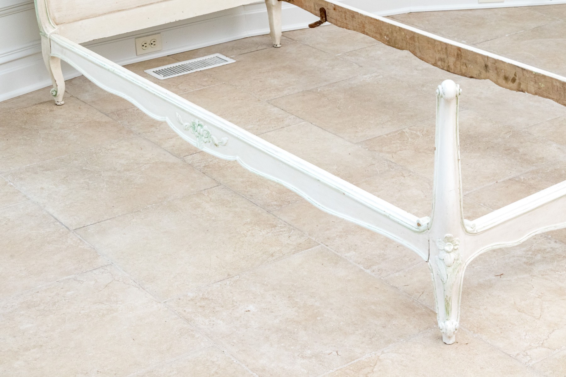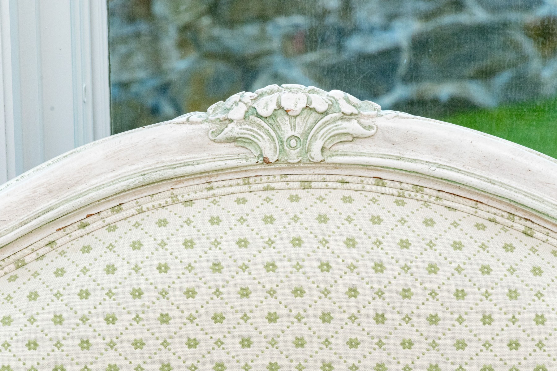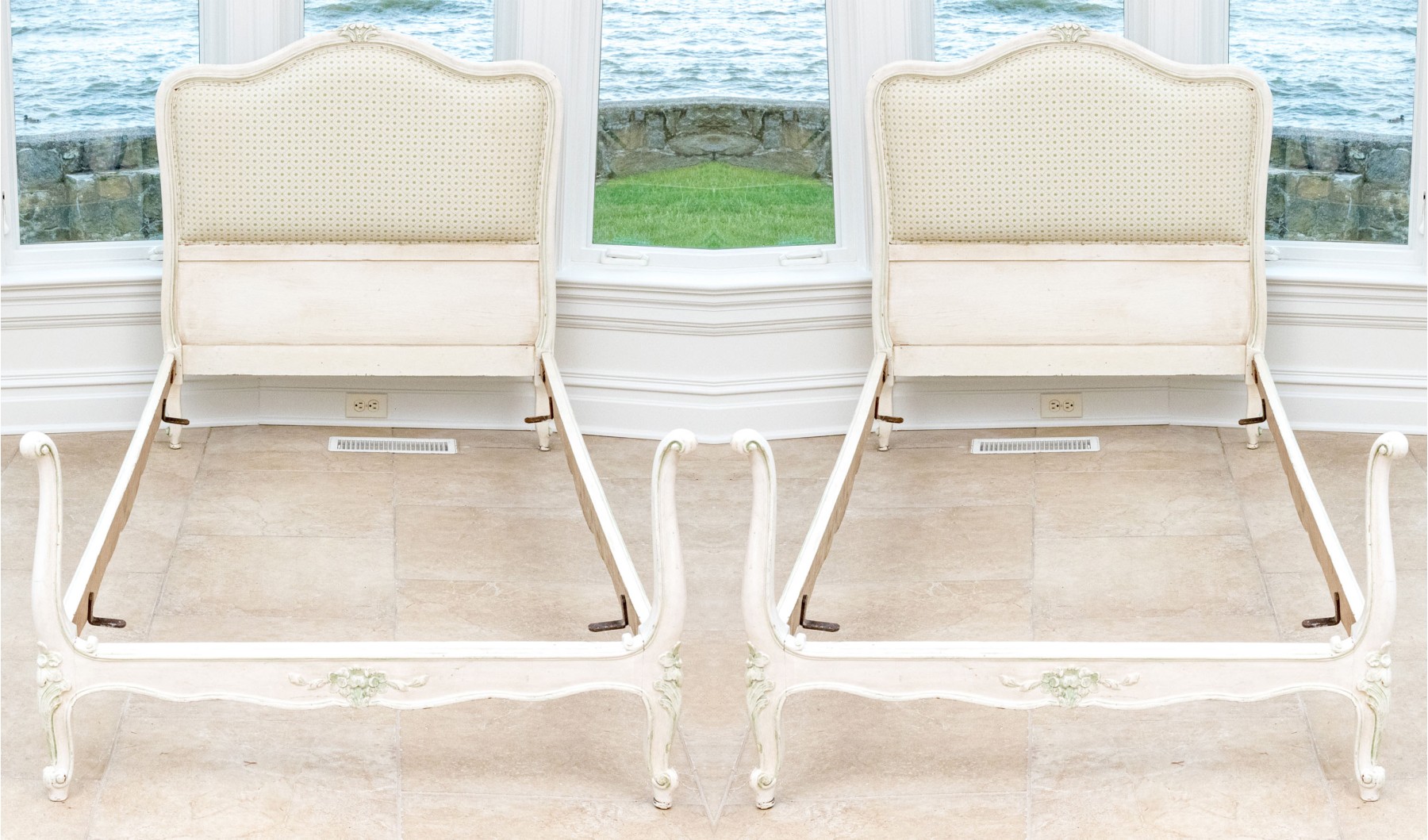 A pair of chic French provincial twin bed frames circa 1920, featuring upholstered headboards in a dainty floral lattice and whitewashed frames with elegant carved details.