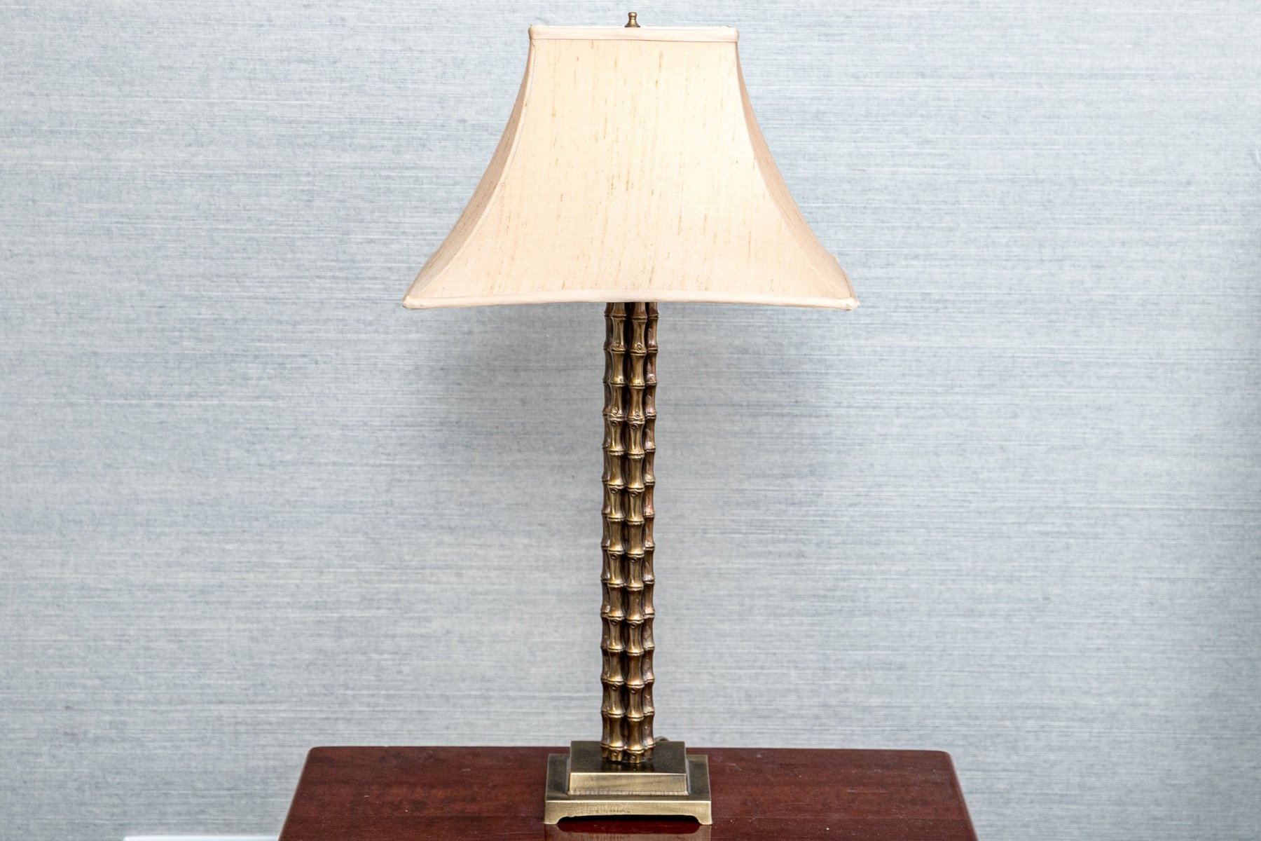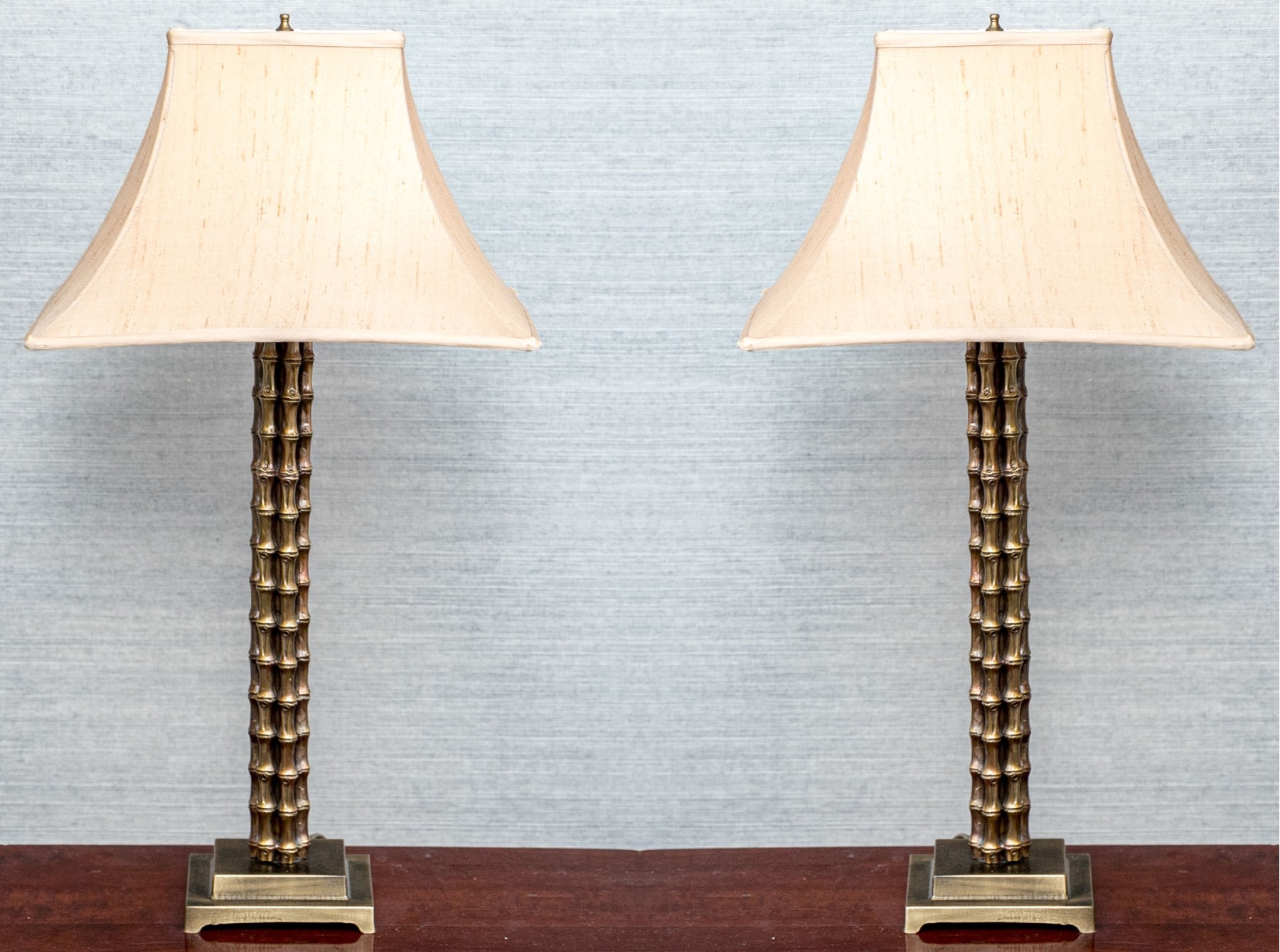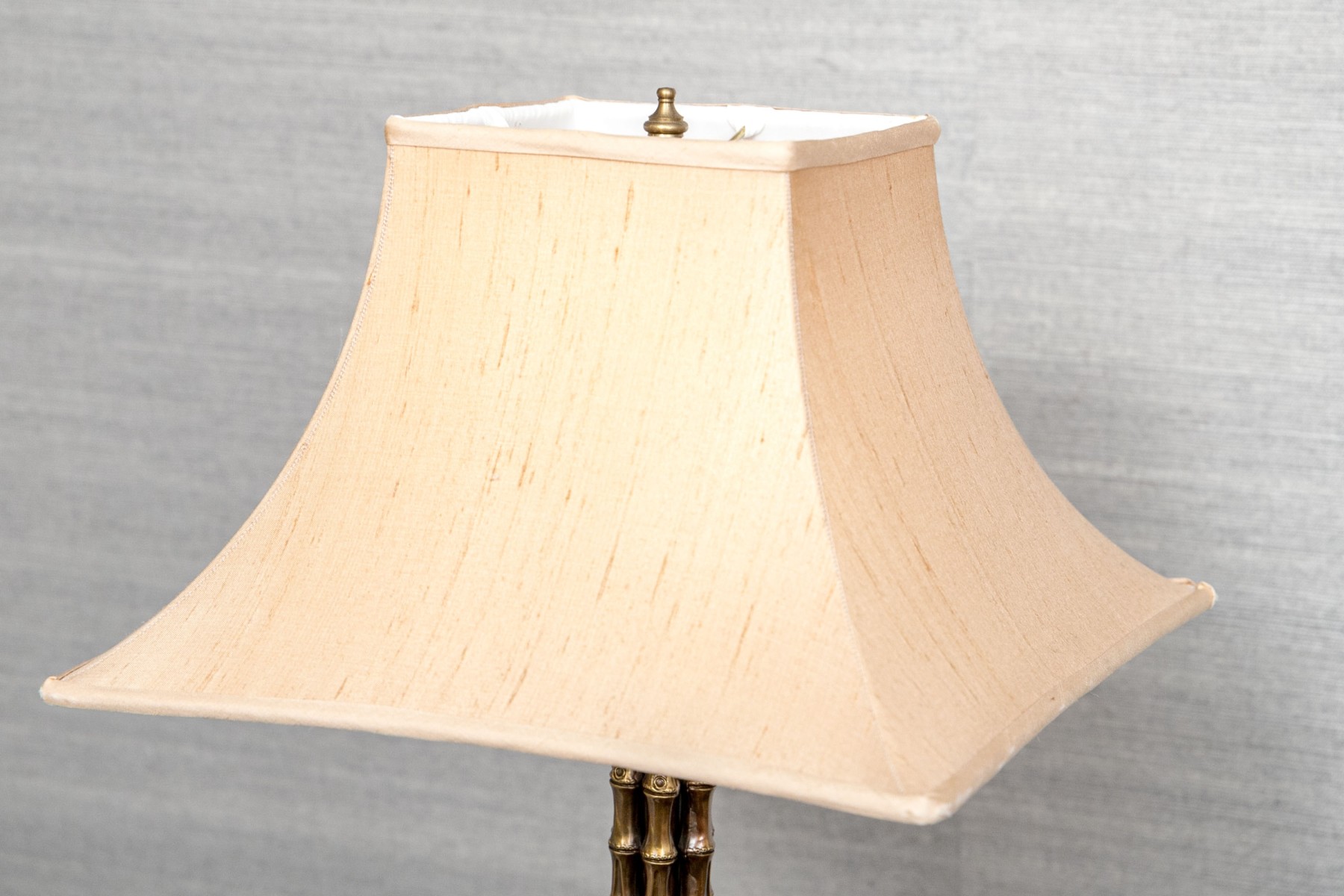 A chic pair of table lamps with excellent mid-century, Hollywood Regency, and chinoiserie appeal, showcasing banded faux gilt bamboo columns over tiered square brass bases. Surmounted with beige silk square corner shades.