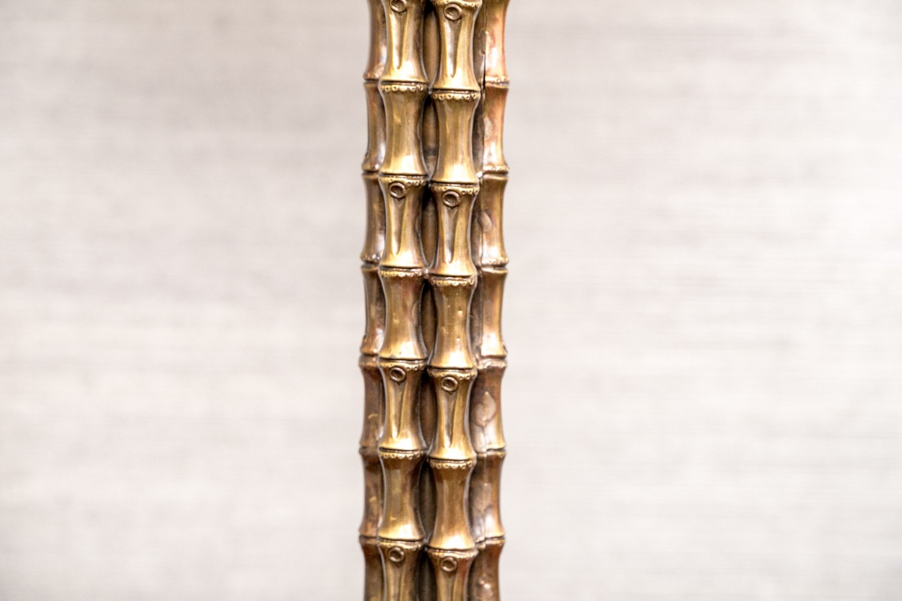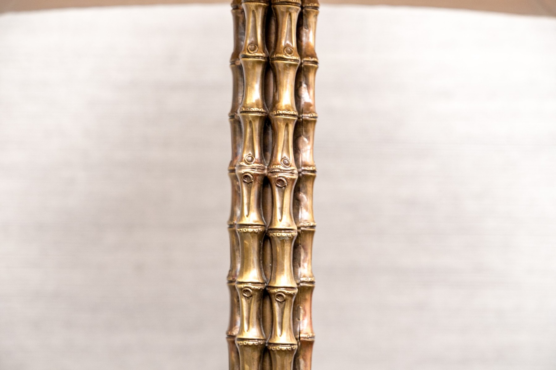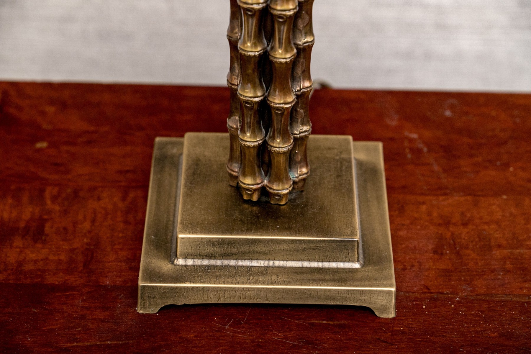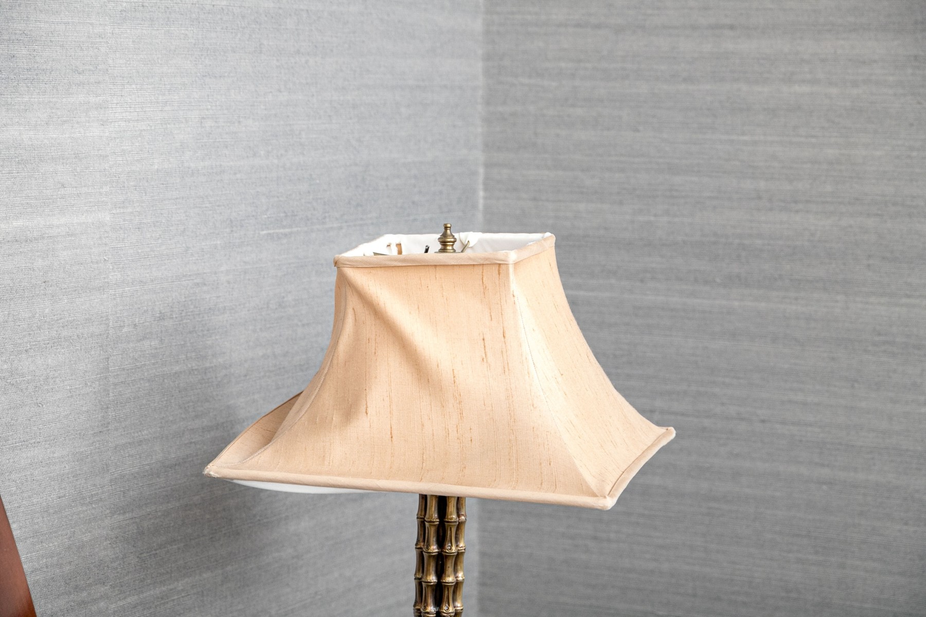 A chic pair of table lamps with excellent mid-century, Hollywood Regency, and chinoiserie appeal, showcasing banded faux gilt bamboo columns over tiered square brass bases. Surmounted with beige silk square corner shades.
