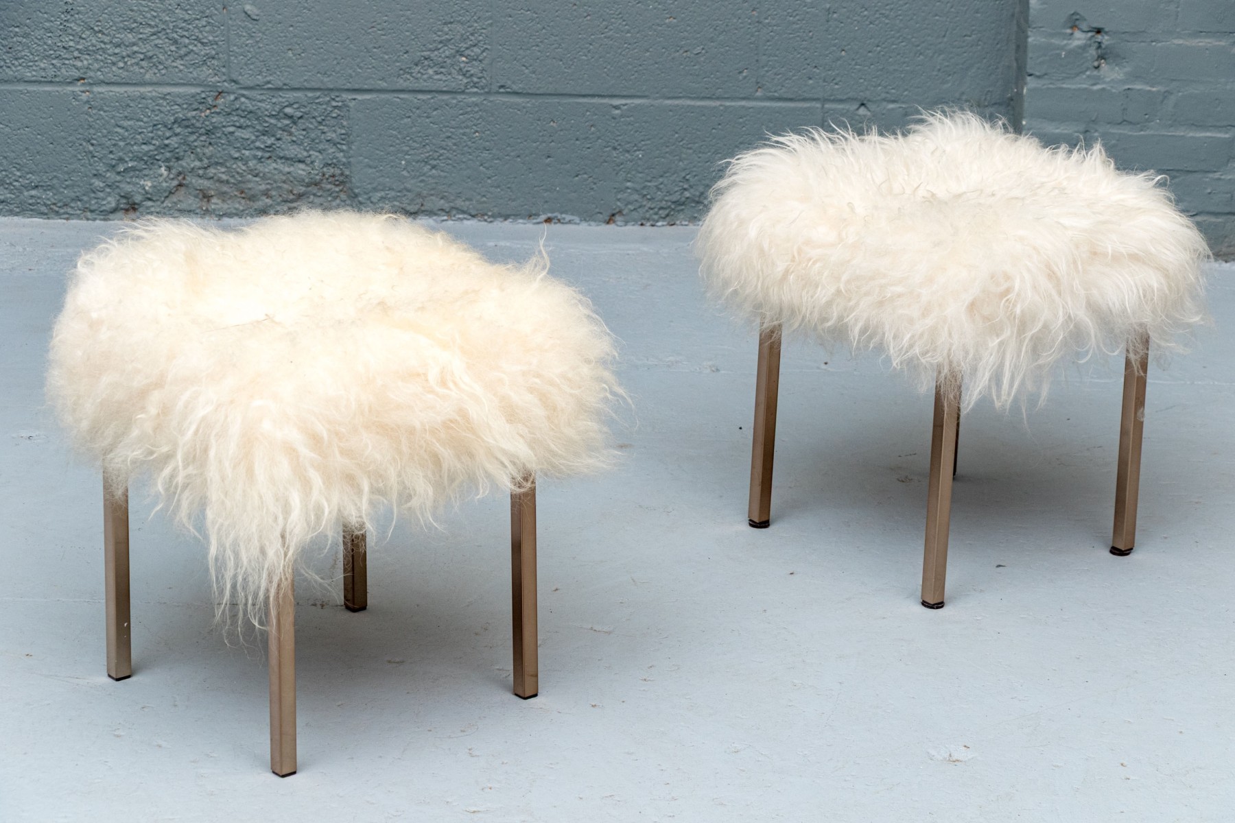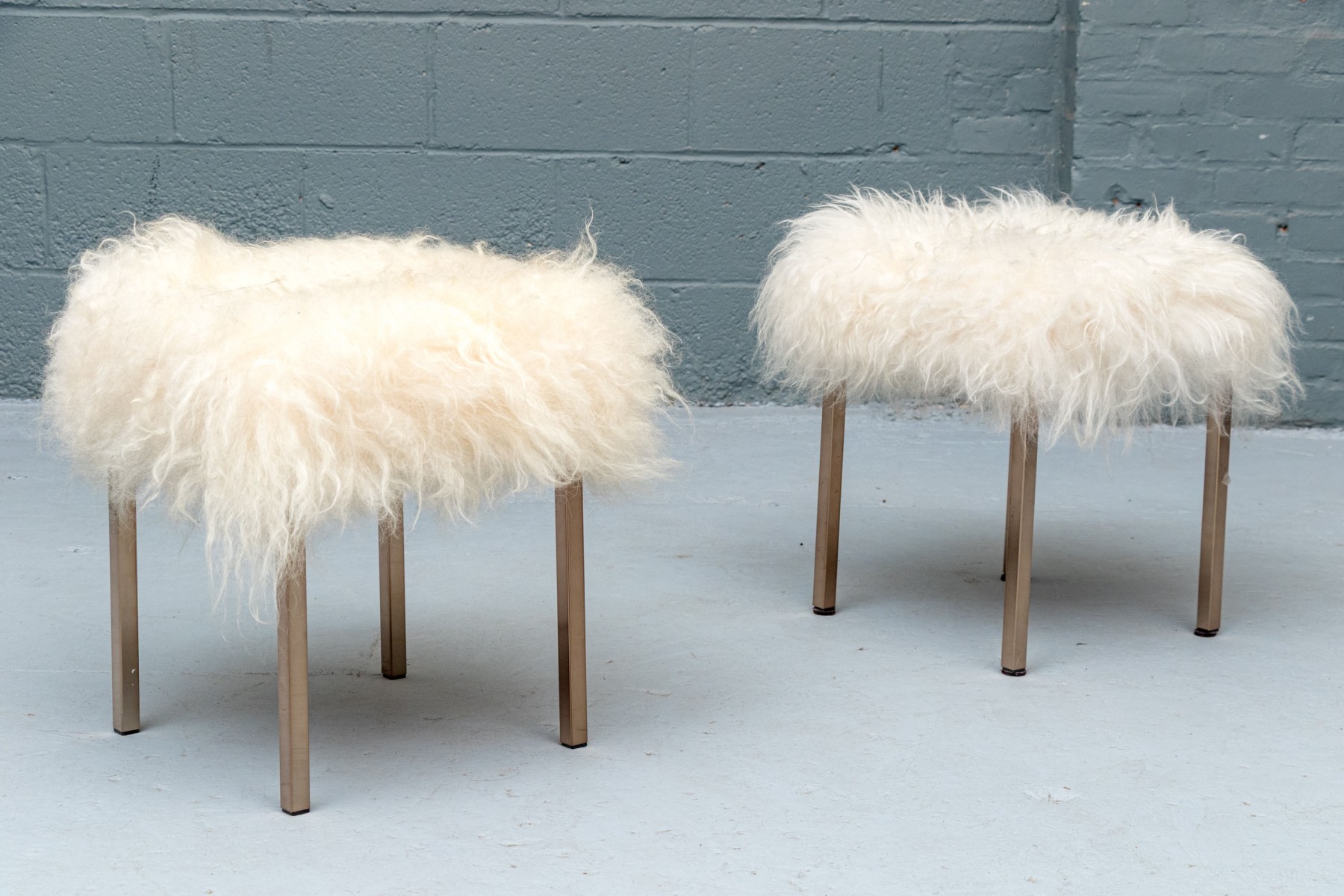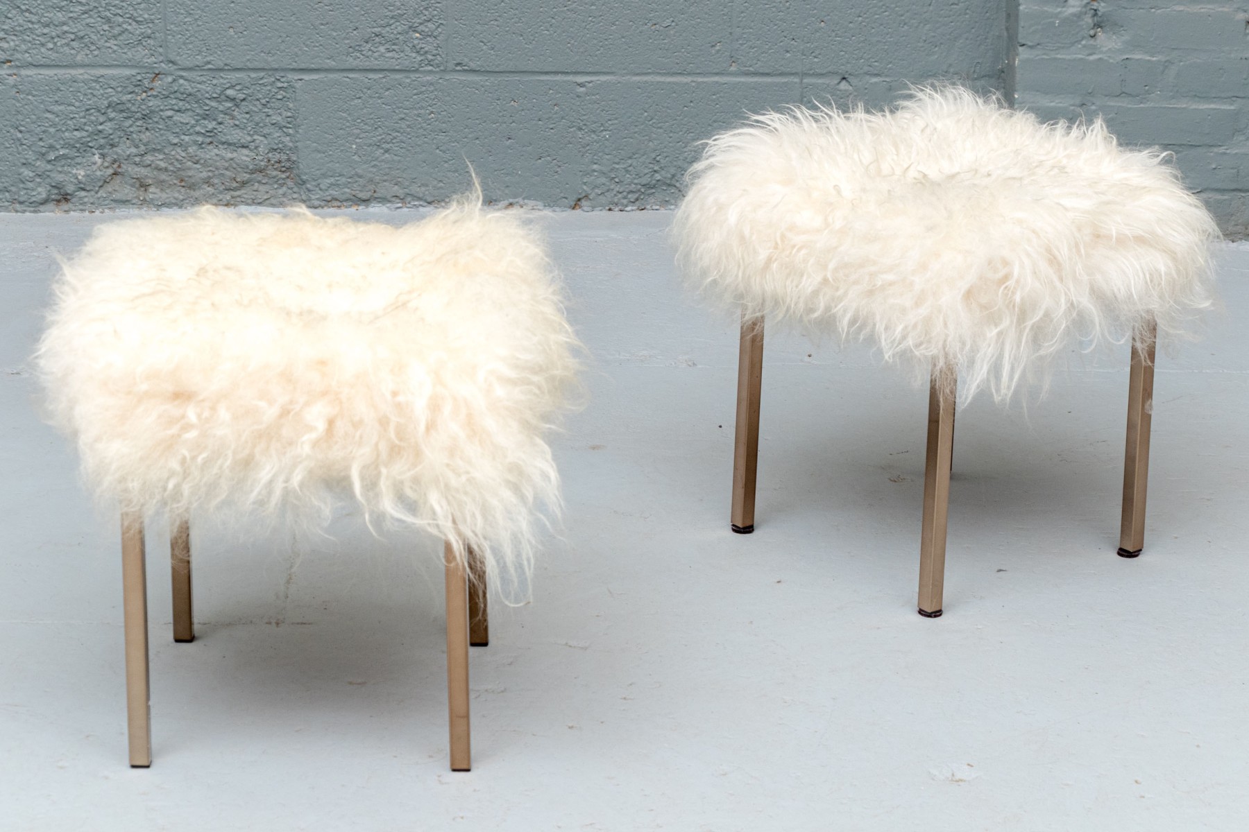 Each on four squared legs with square seat cushions with white shag upholstery.