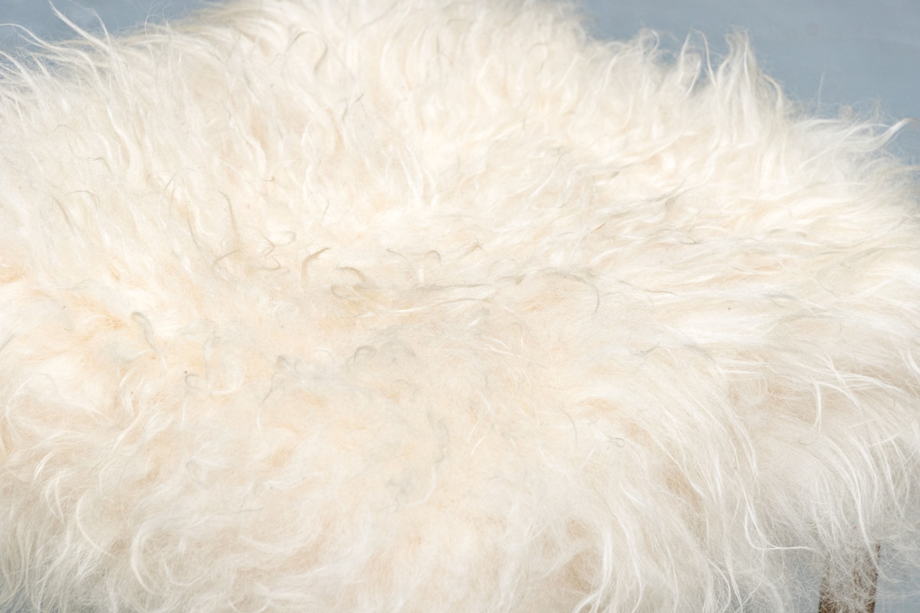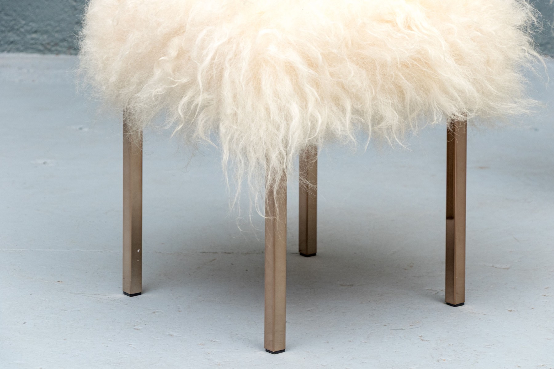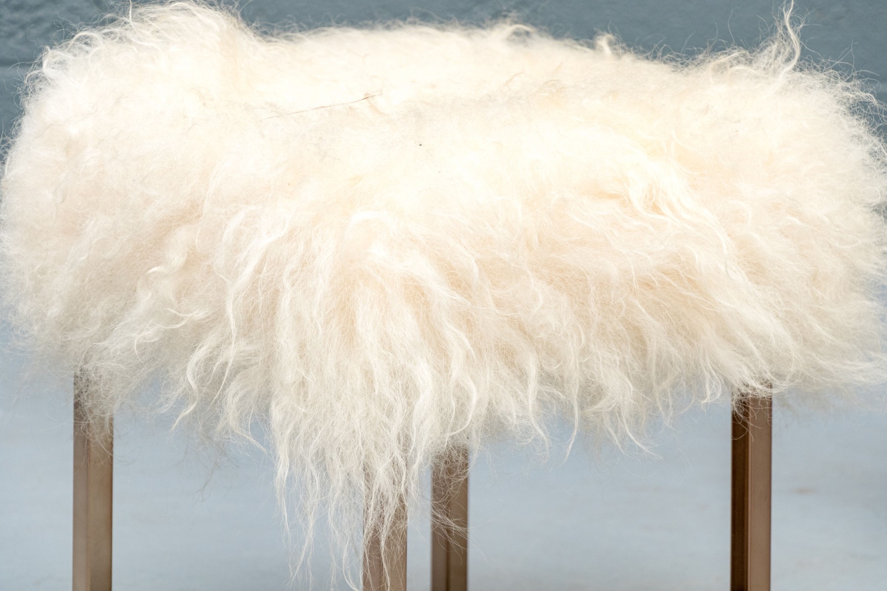Each on four squared legs with square seat cushions with white shag upholstery.
