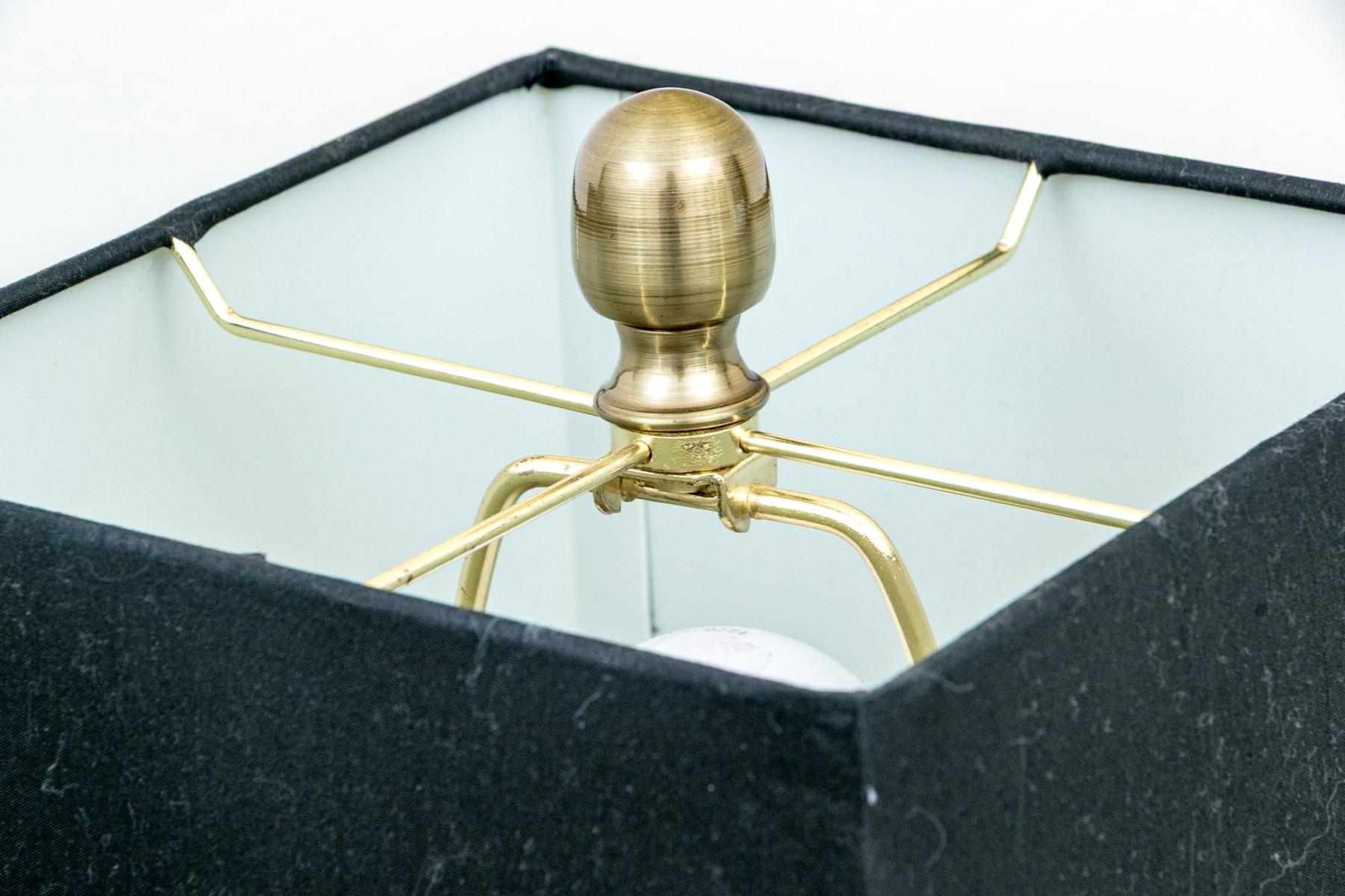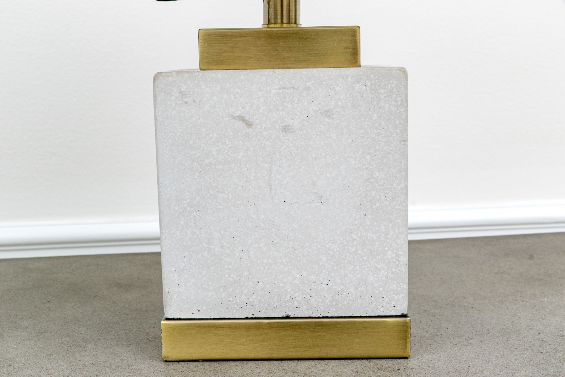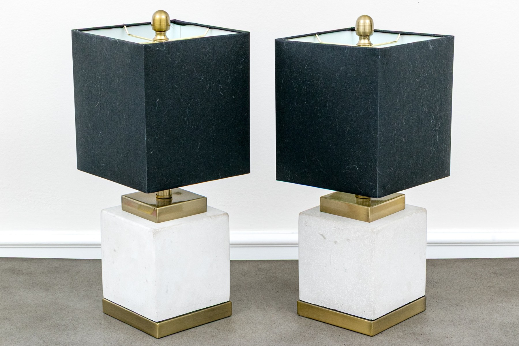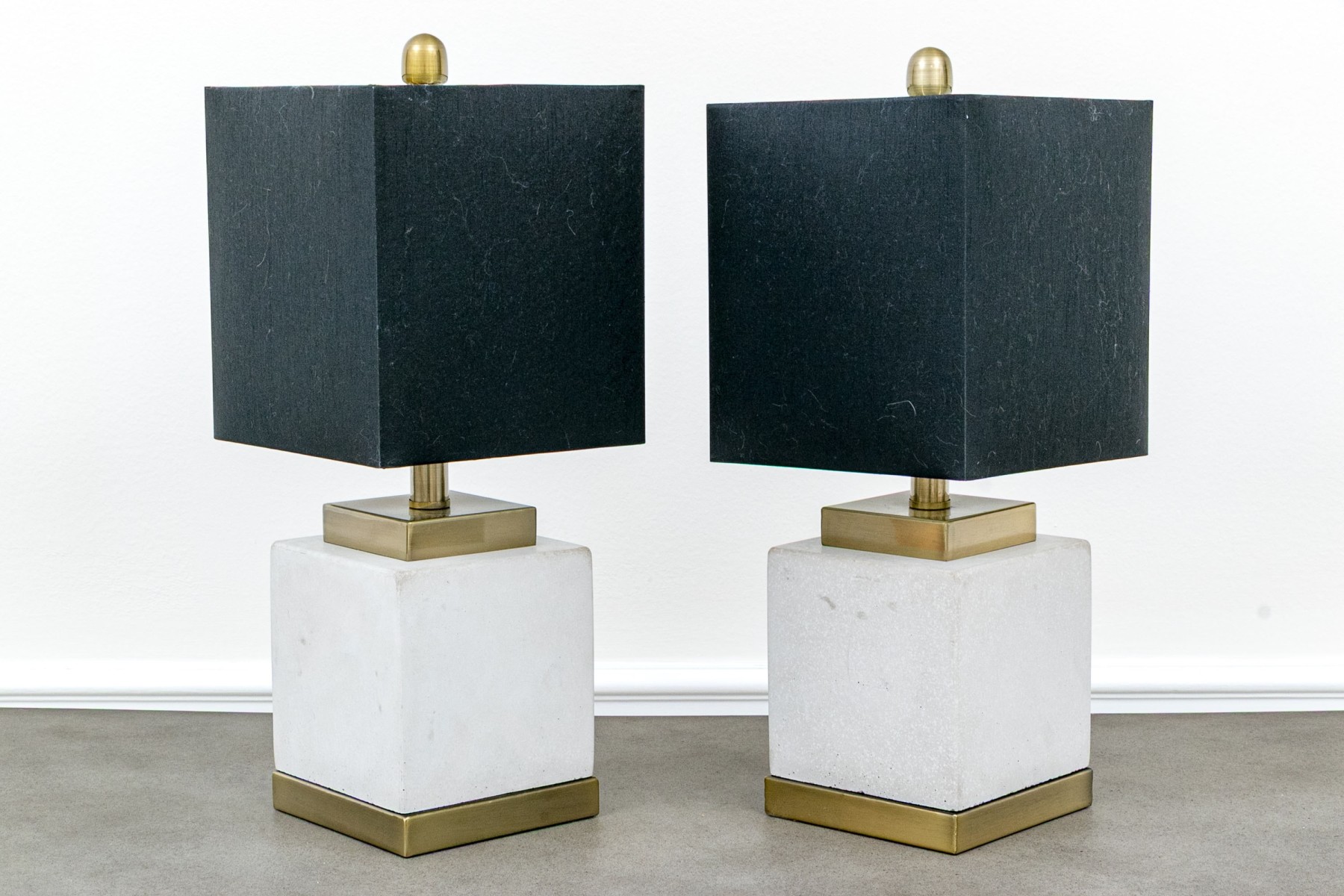 A stylish pair of table lamps featuring cast cement cube bodies on brass tone bases matching square caps leading up to black fabric shades with ovoid finials.