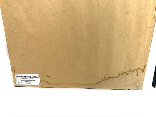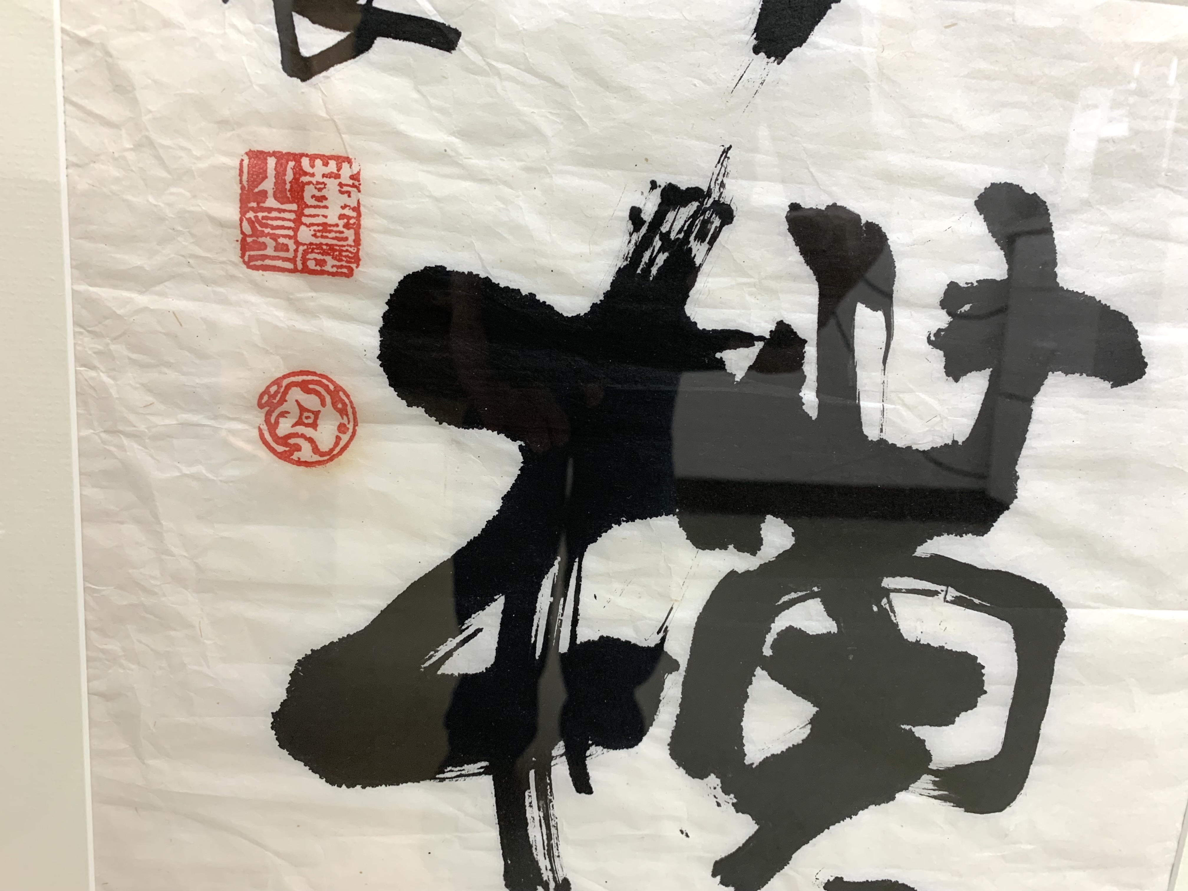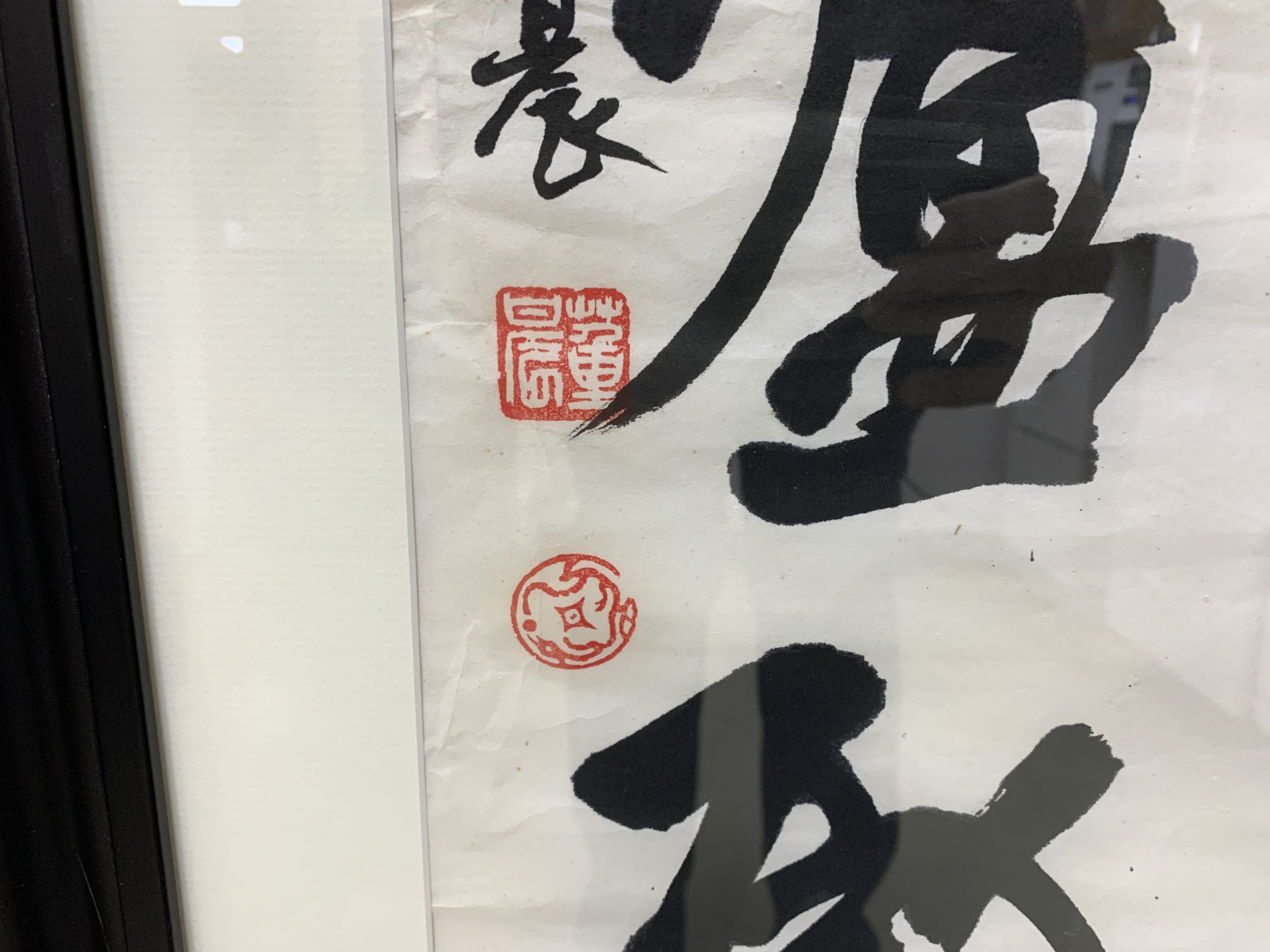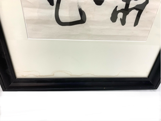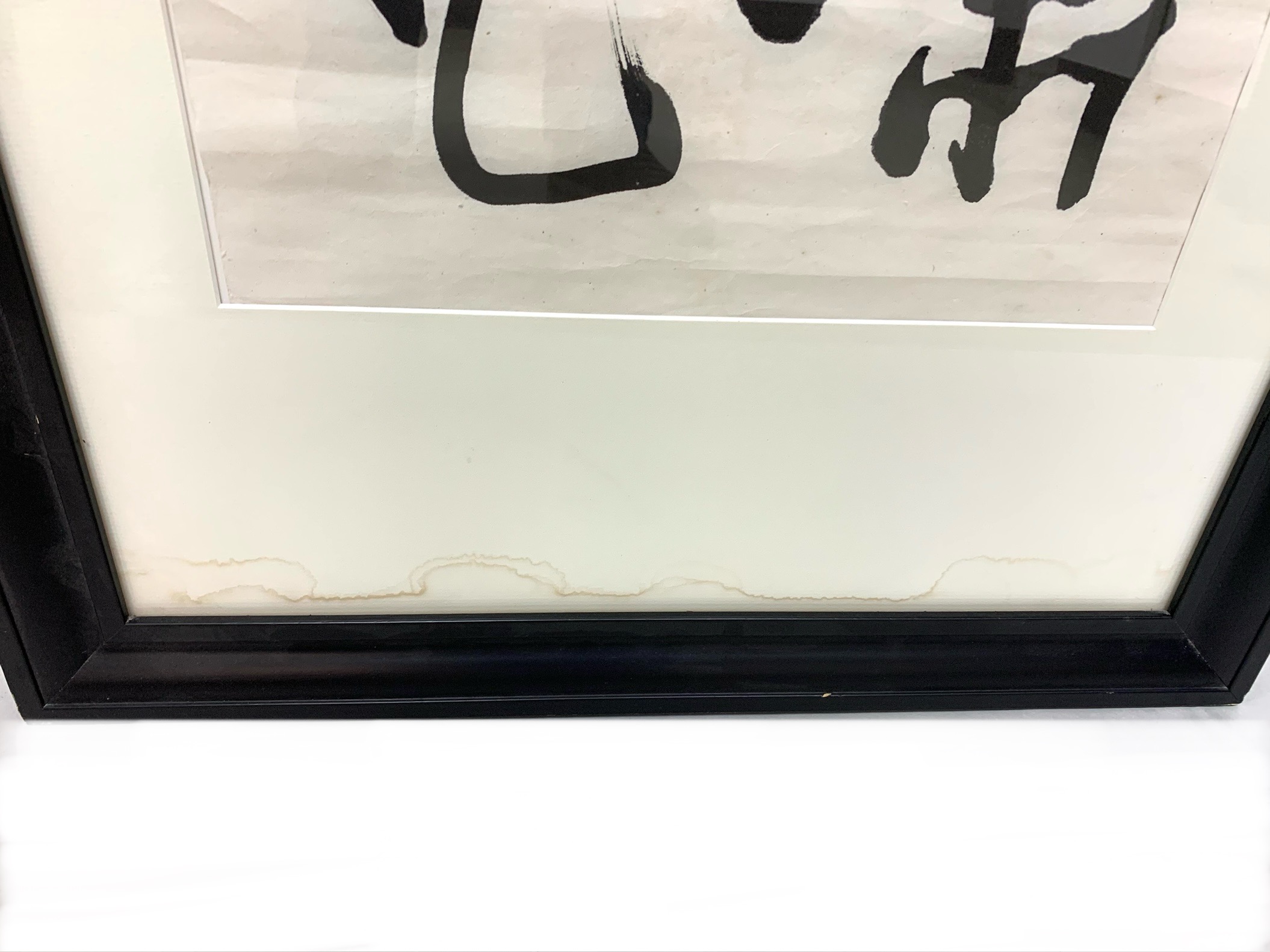 A pair of boldly brushed Rice Paper Calligraphy Panels having a particularly fine Asian presentation. One panel with 10 Calligraphic characters and the other with 4 and both with red seal/ chop marks. Housed in custom Ebonized frames with frames having Ivory tone mats by the iconic artist and gallery owner Mark Humphrey with locations in South Hampton and New York City. Mr. Humphrey is a celebrated artist and gallery owner who actually started his business by producing the custom frames for his clients works as well as his gallery offerings. Both with Mark Humphrey Gallery labels attached.
