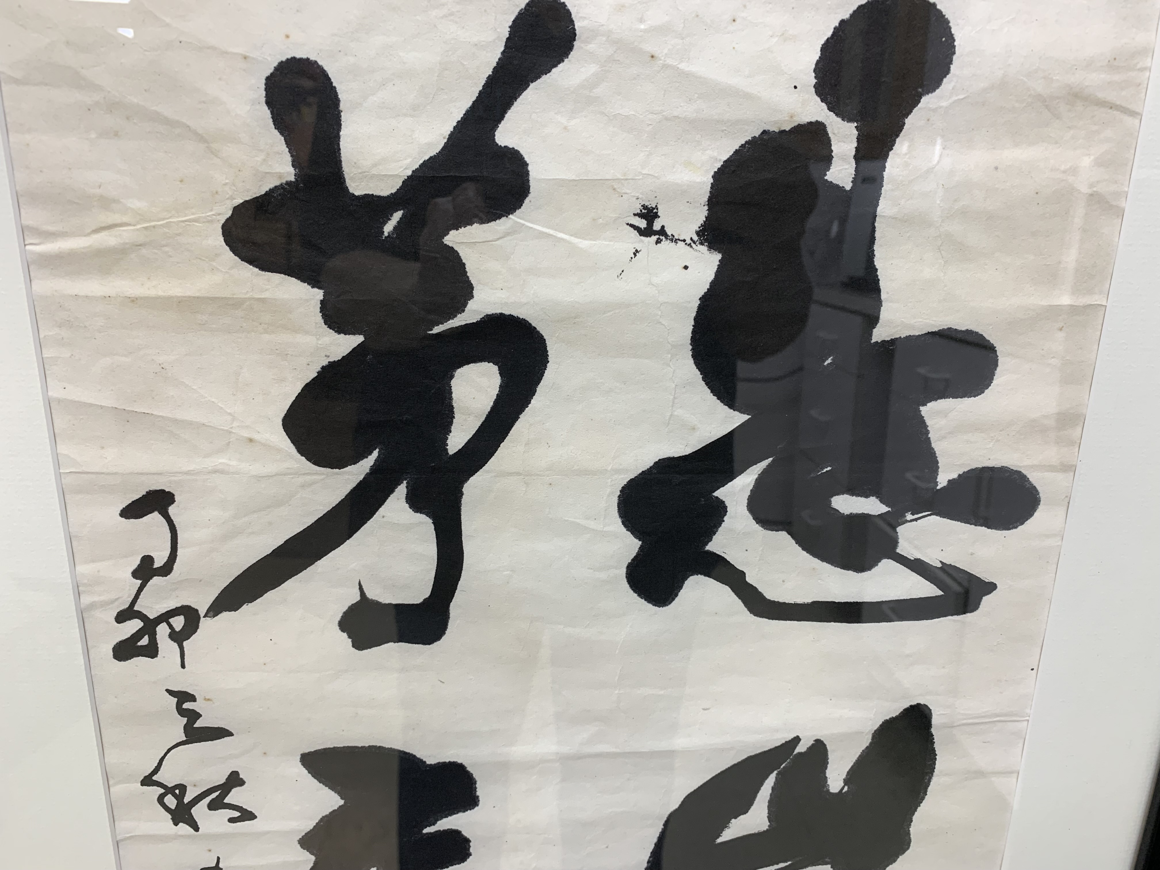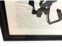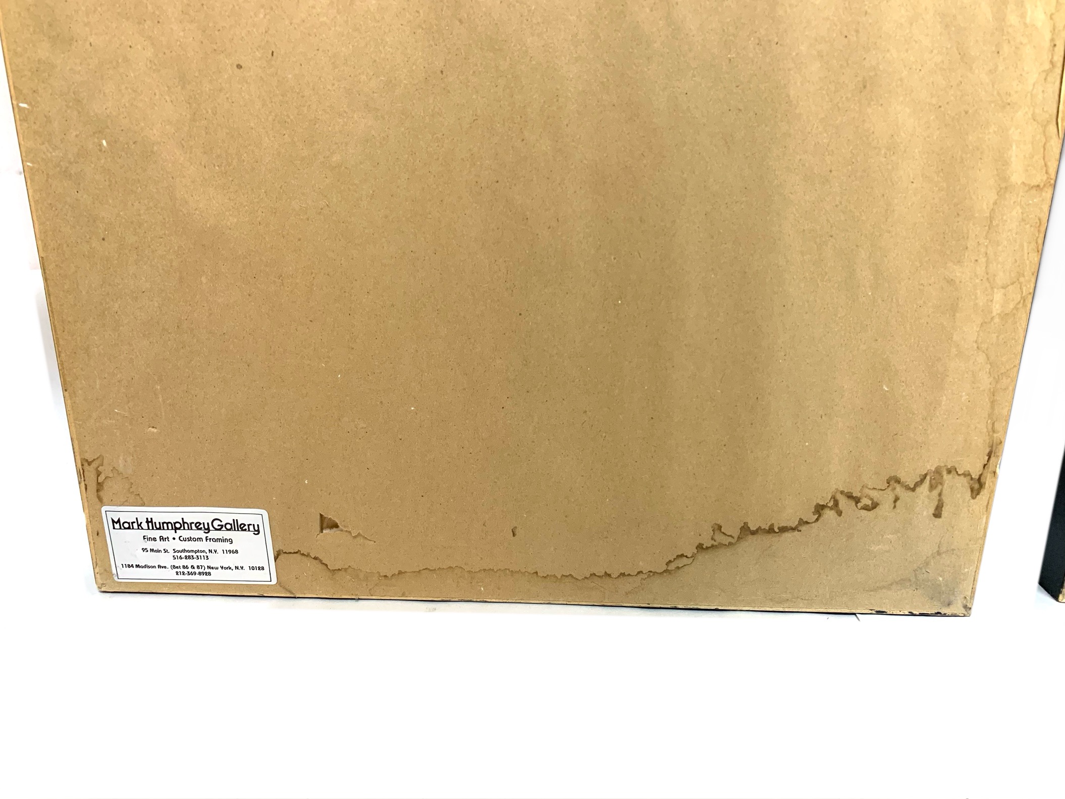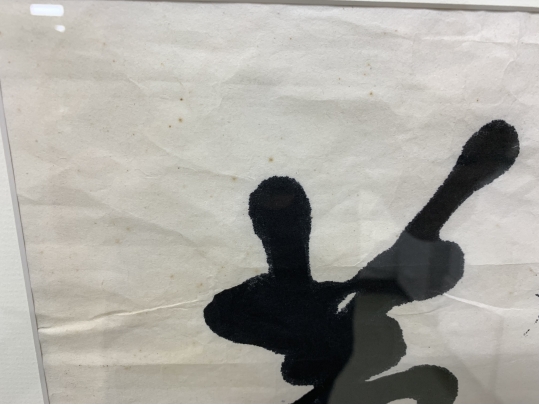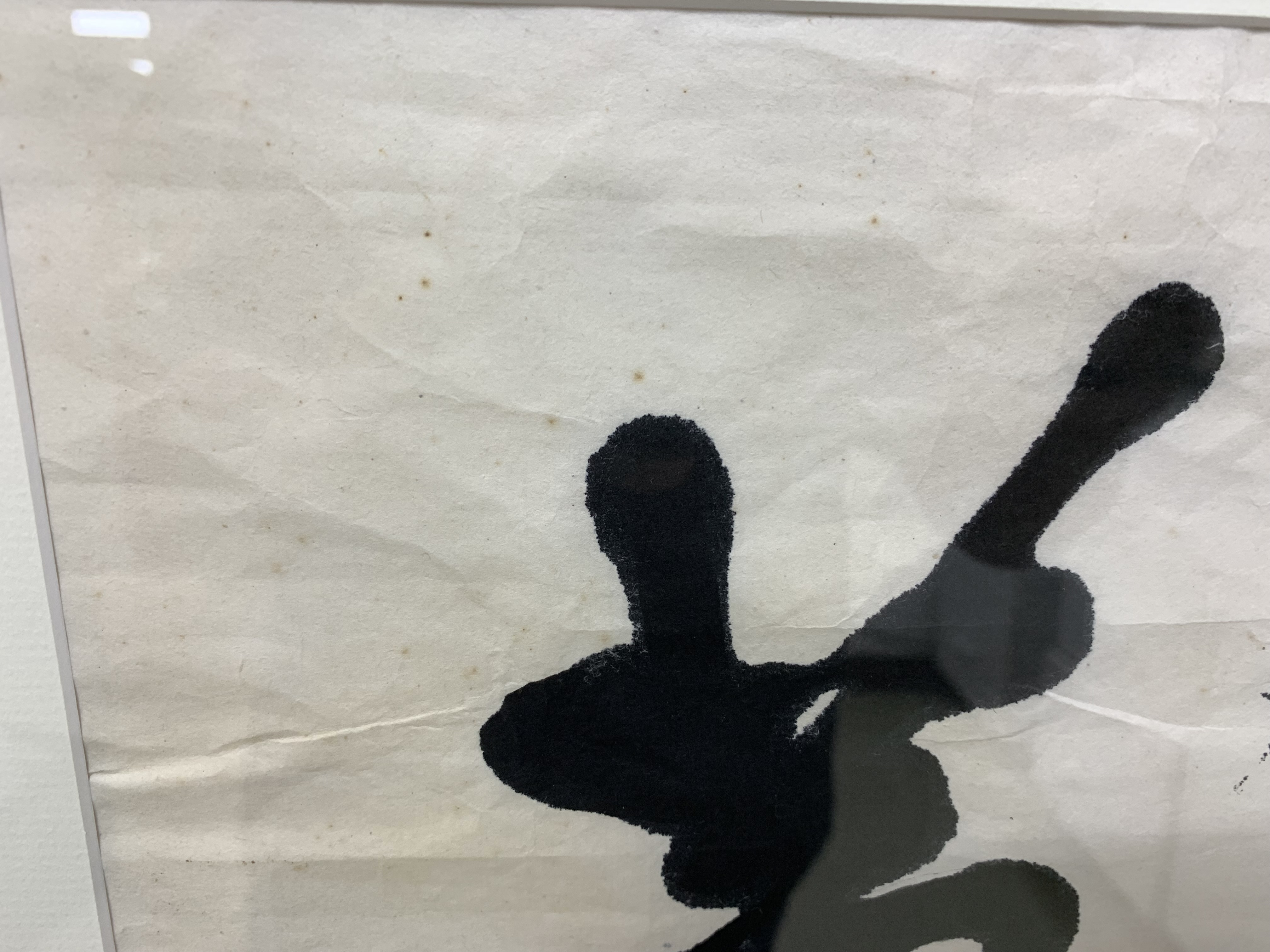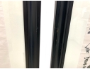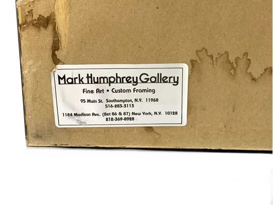 A pair of boldly brushed Rice Paper Calligraphy Panels having a particularly fine Asian presentation. One panel with 10 Calligraphic characters and the other with 4 and both with red seal/ chop marks. Housed in custom Ebonized frames with frames having Ivory tone mats by the iconic artist and gallery owner Mark Humphrey with locations in South Hampton and New York City. Mr. Humphrey is a celebrated artist and gallery owner who actually started his business by producing the custom frames for his clients works as well as his gallery offerings. Both with Mark Humphrey Gallery labels attached.