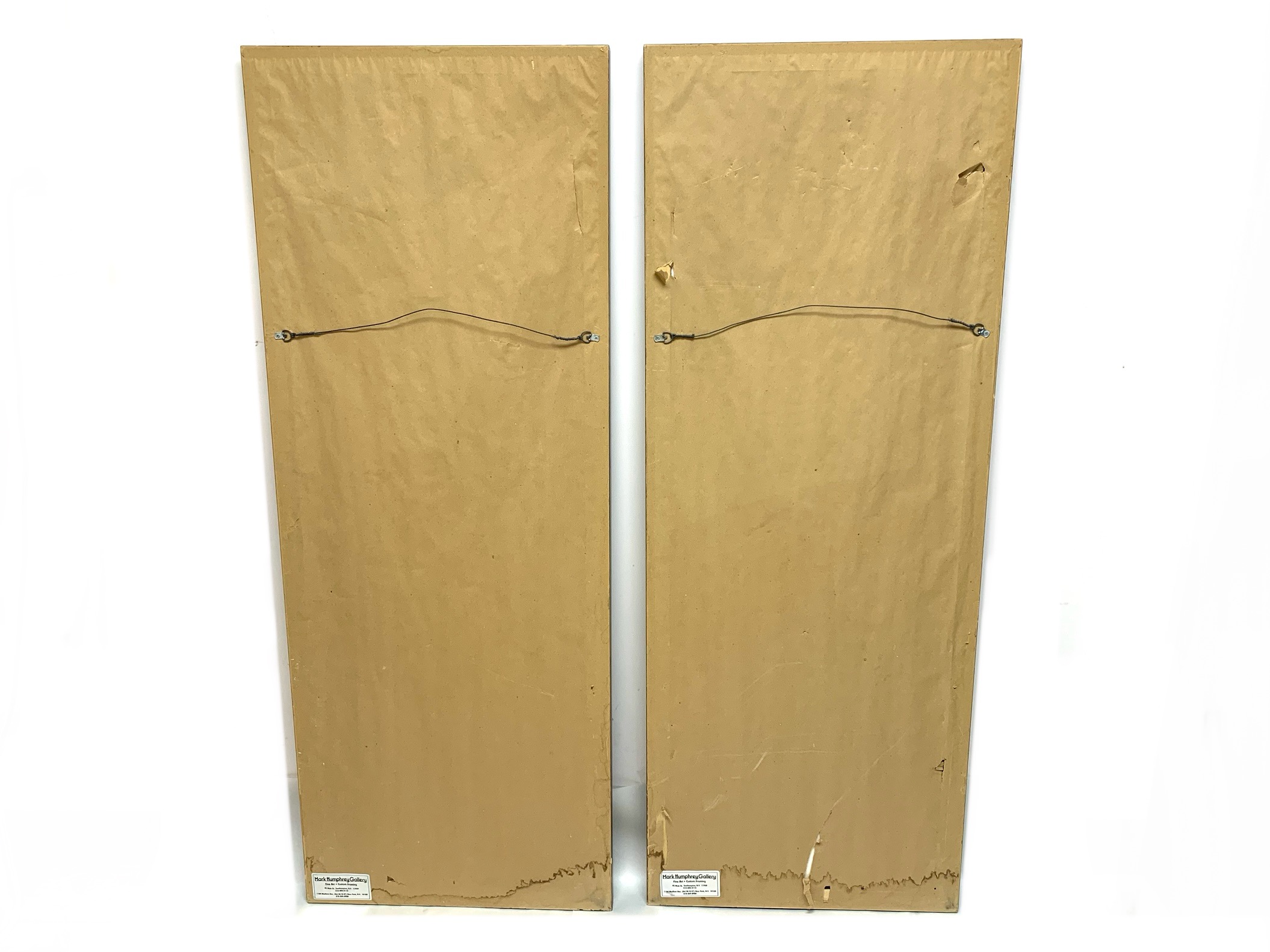 Condition: Please see detail photos. Both of the panels have various signs of age and use including old water stains to the bottoms showing on the mats and backing paper, torn backing paper, chips and nicks to the frames with some old touch ups. Despite the wear the Pair present in a particularly fine and commanding presentation.