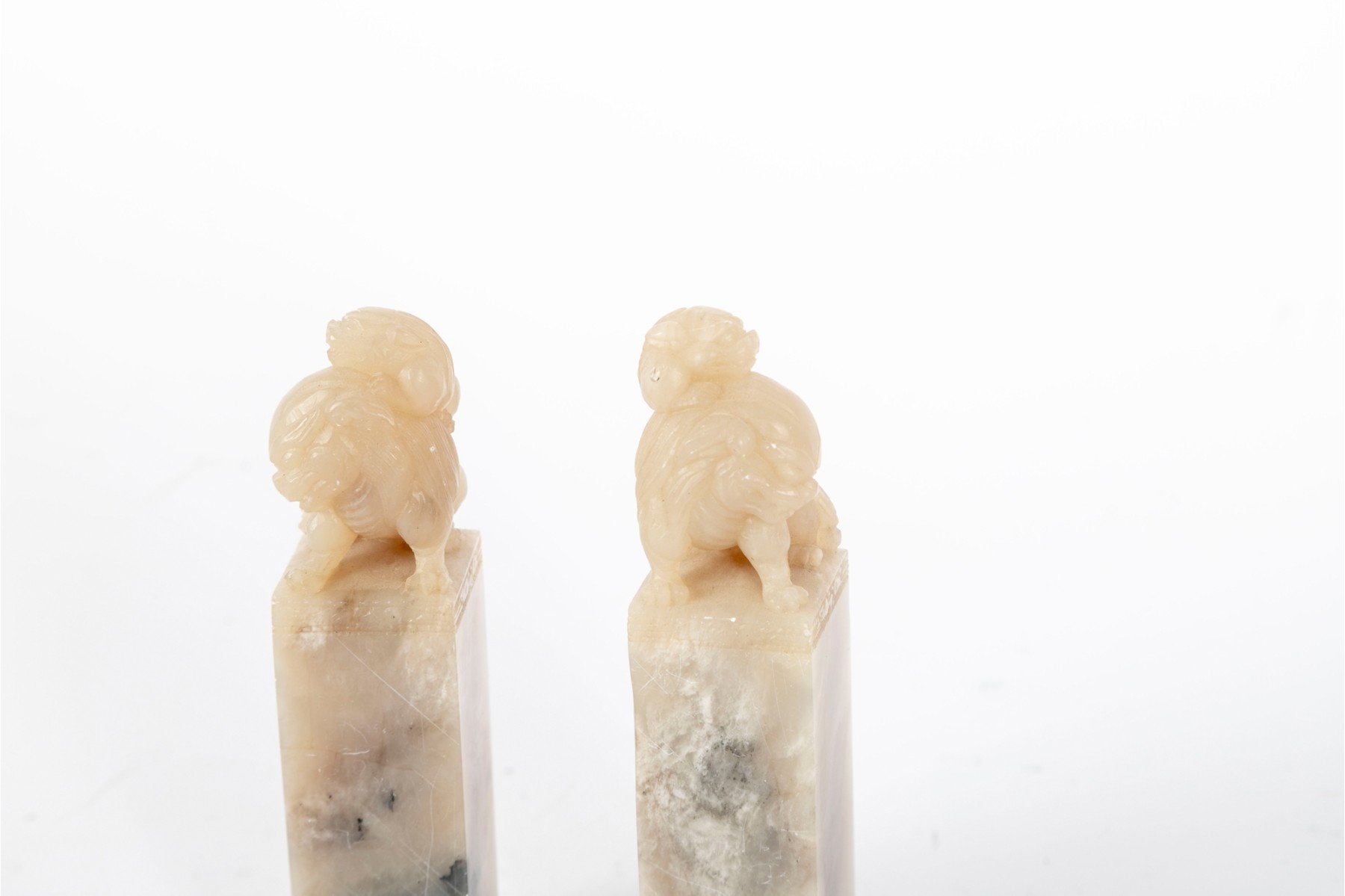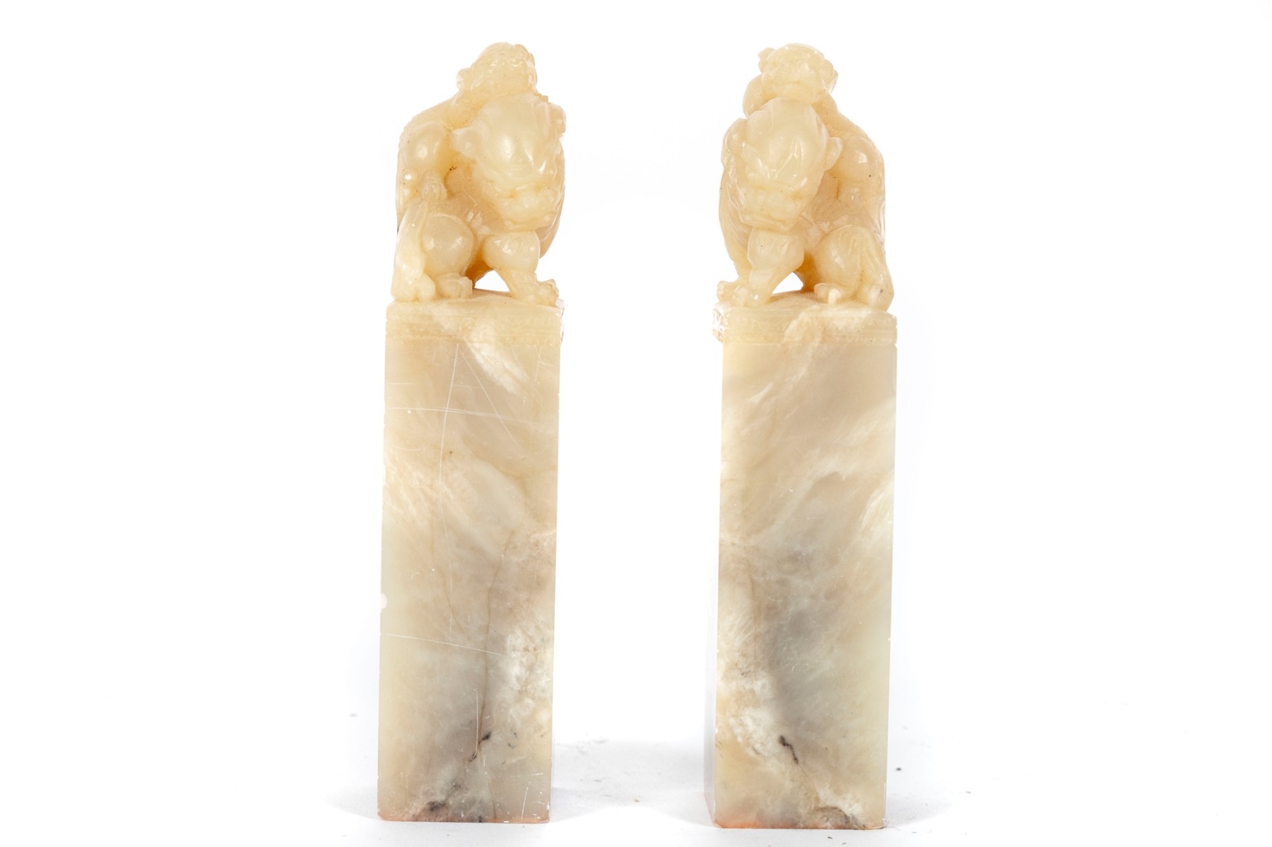 A pair of 4" rectangular Chinese soapstone seals with carved guardian foo-dogs on top.