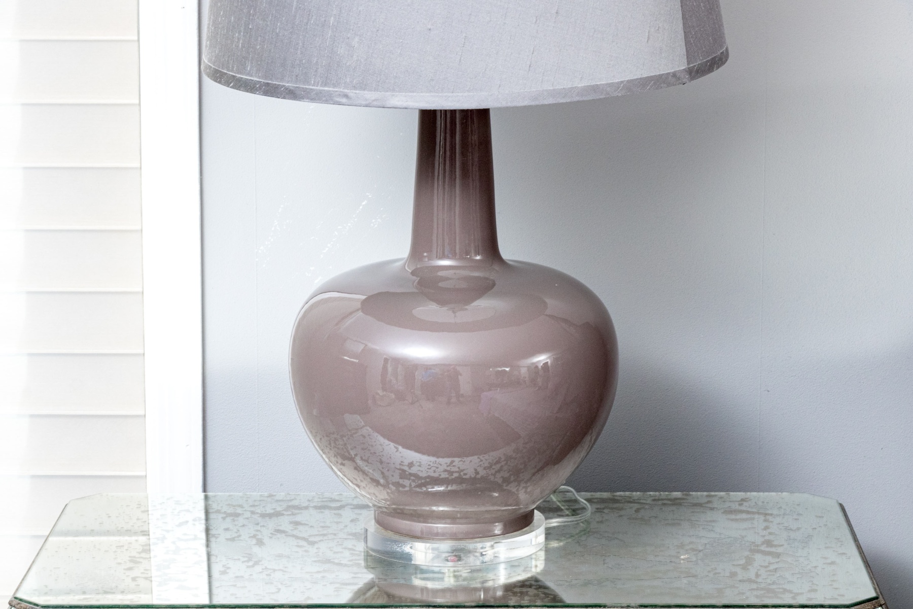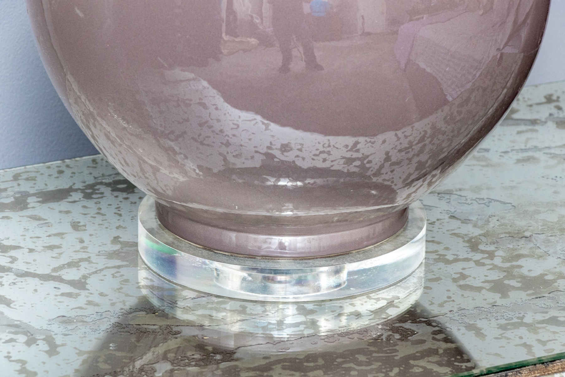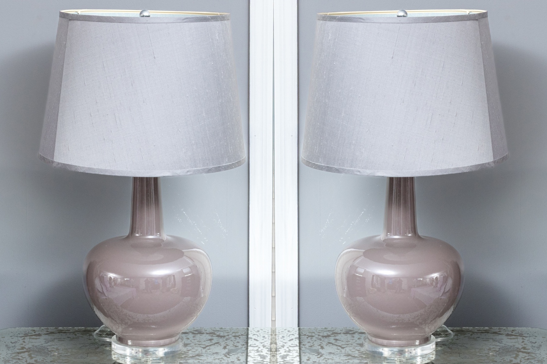 A chic pair of Chinese ceramic vase form table lamps showcasing chic purple-taupe glazed bottle forms with tall, tapered necks and apple form bodies leading to circular feet, mounted to circular clear acrylic bases and surmounted by gray empire shades with gray ball finials.