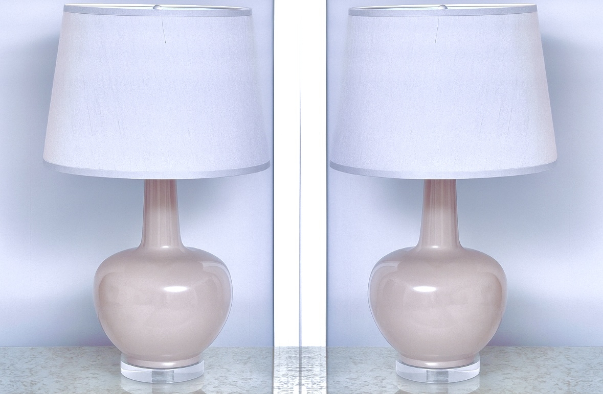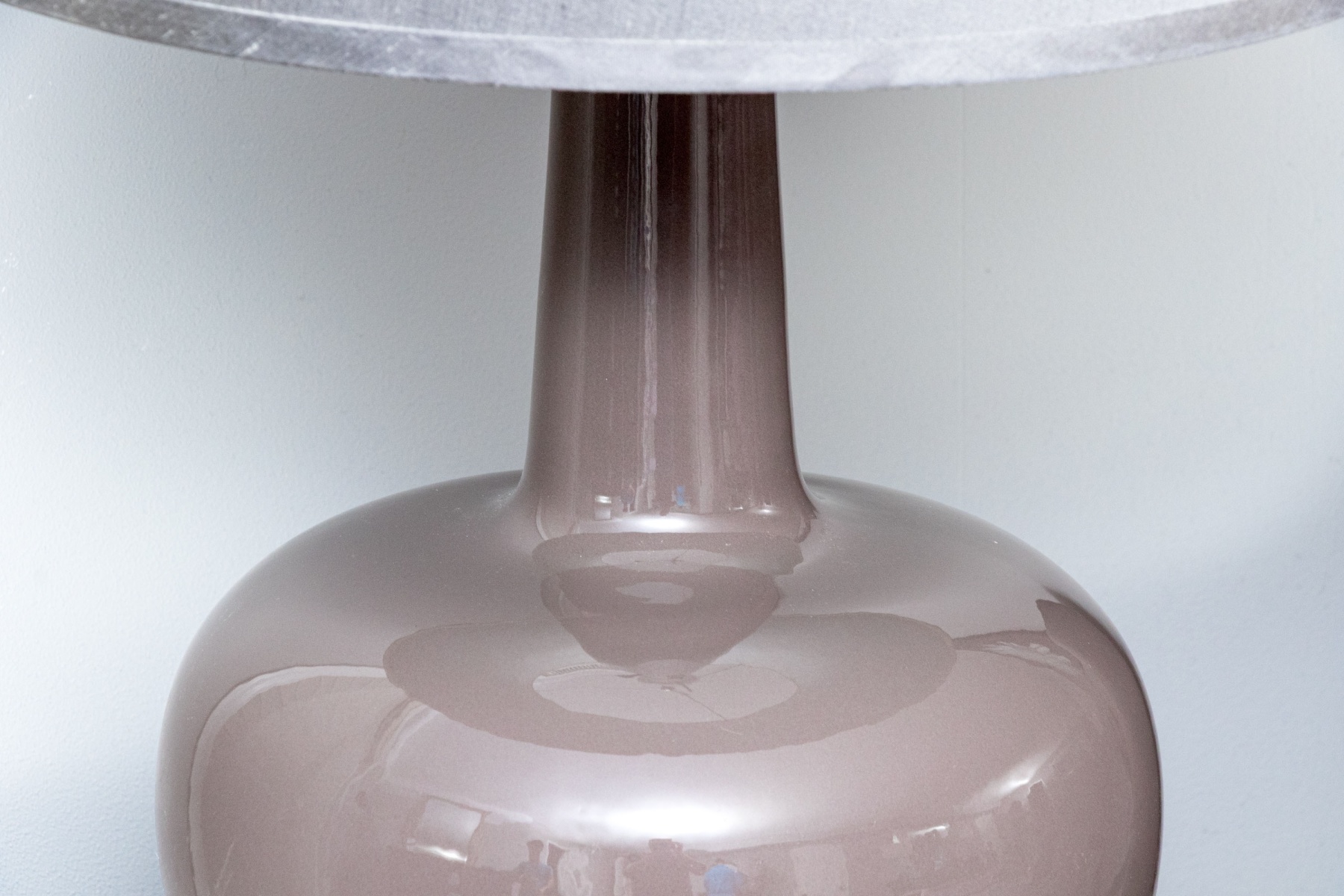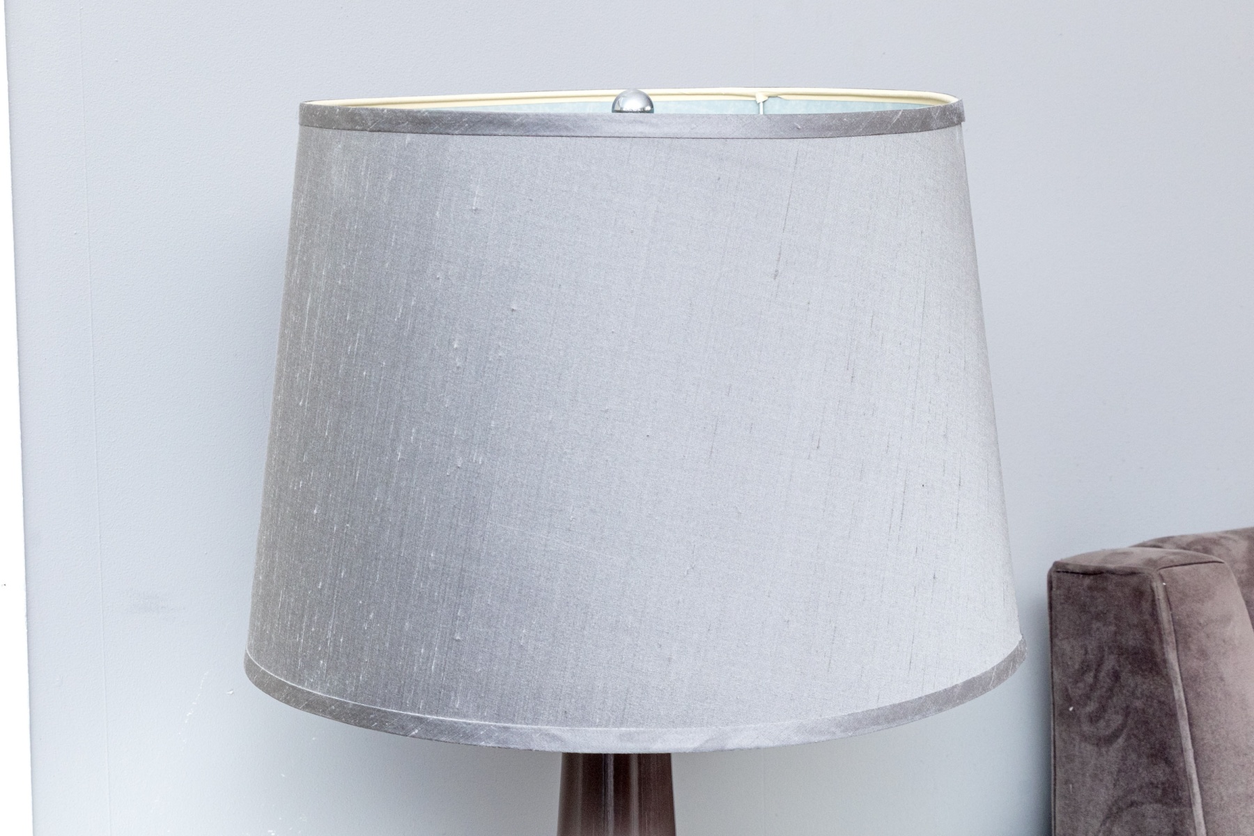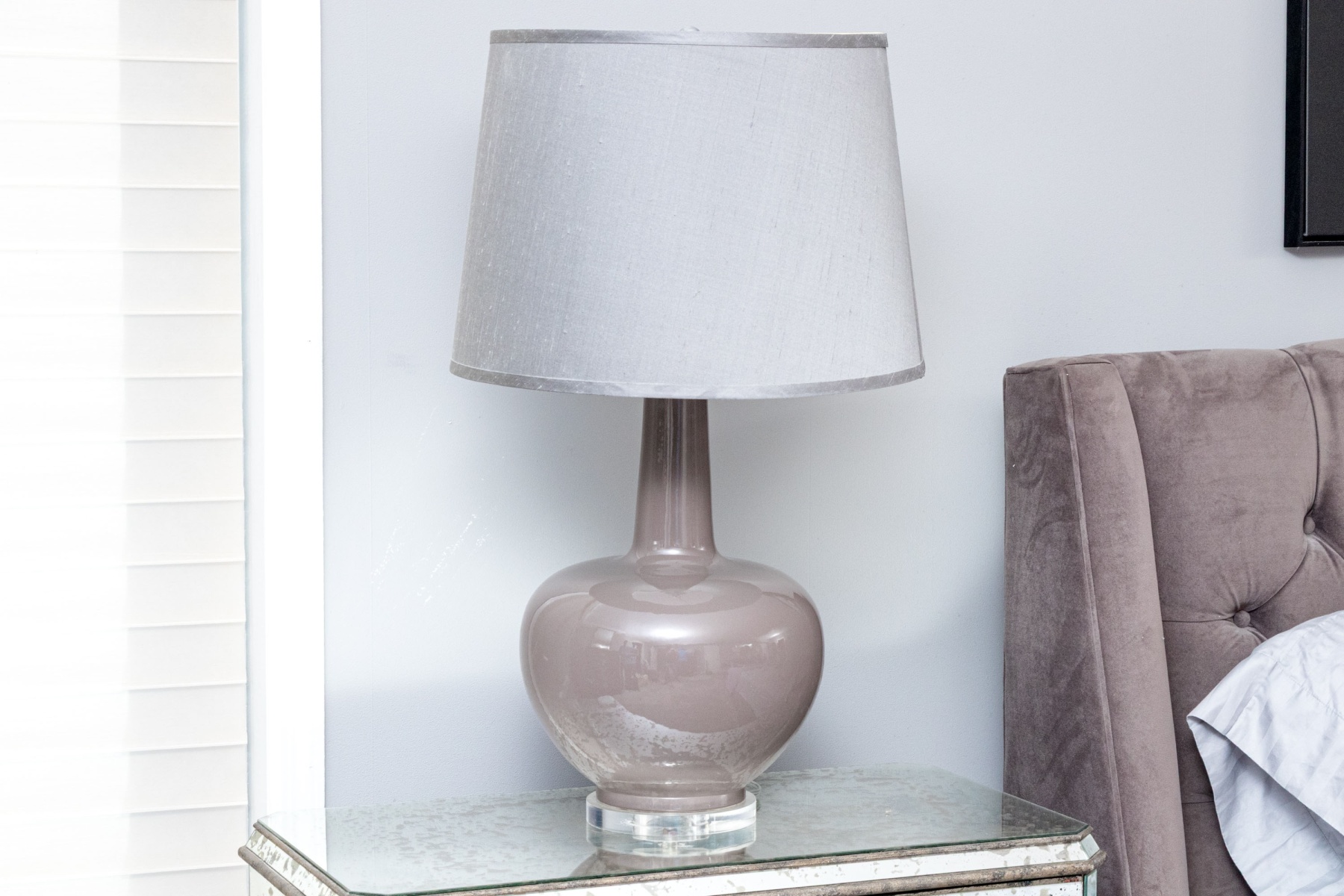 A chic pair of Chinese ceramic vase form table lamps showcasing chic purple-taupe glazed bottle forms with tall, tapered necks and apple form bodies leading to circular feet, mounted to circular clear acrylic bases and surmounted by gray empire shades with gray ball finials.