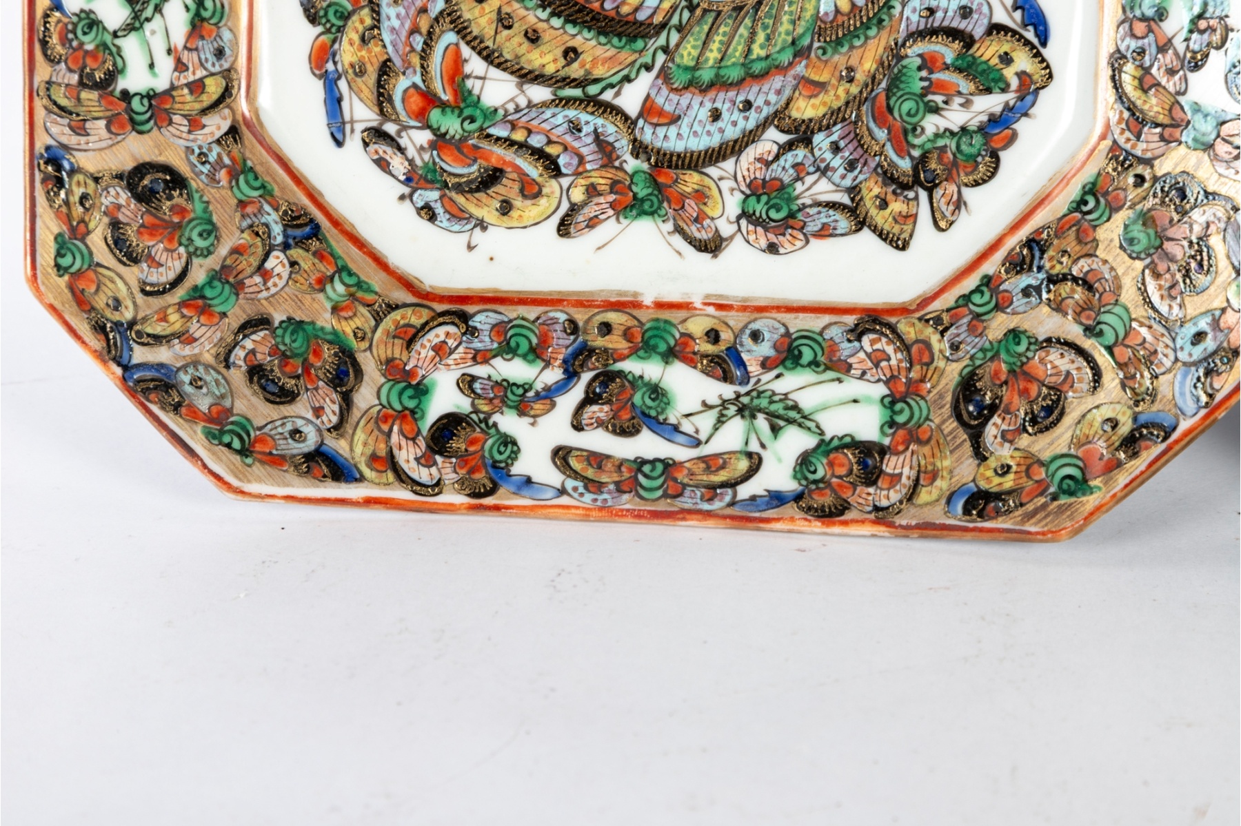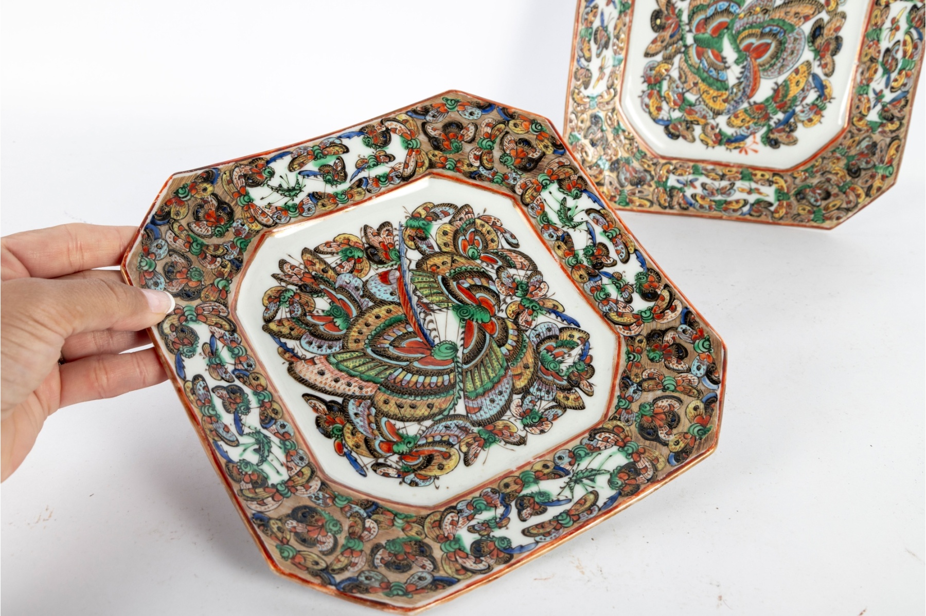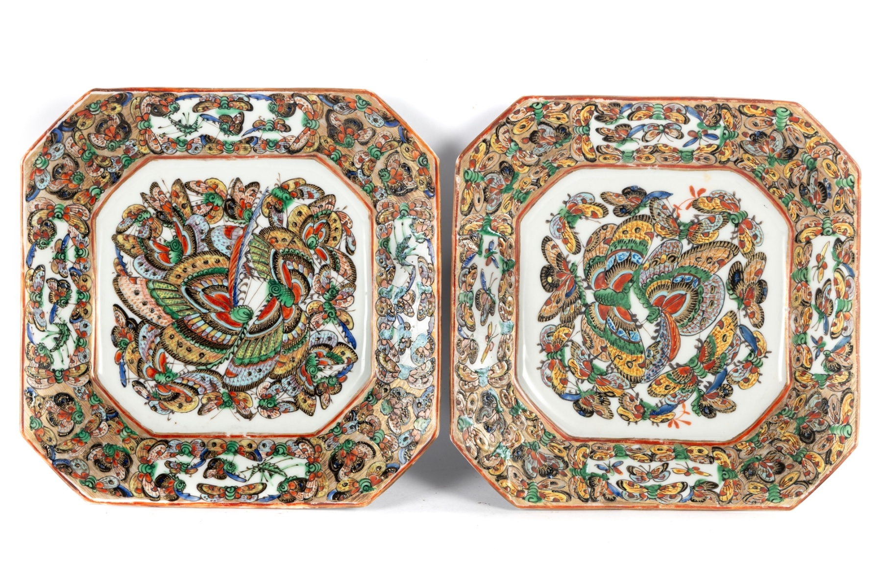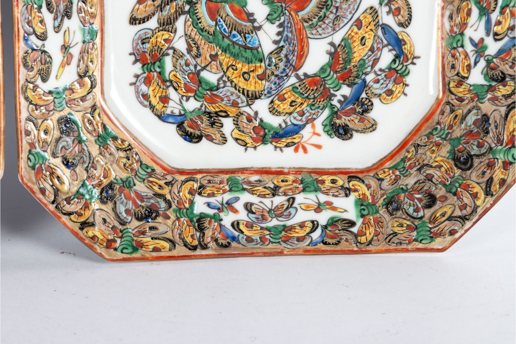 A finely decorated pair of Chinese porcelain octagonal plates, each vividly hand-painted in the traditional Hundred Butterflies motif. The composition features a dense and colorful array of butterflies in flight, surrounded by a richly detailed border of floral scrolls and gilt accents. Marked “CHINA” on the underside, indicating early 20th-century export production.
