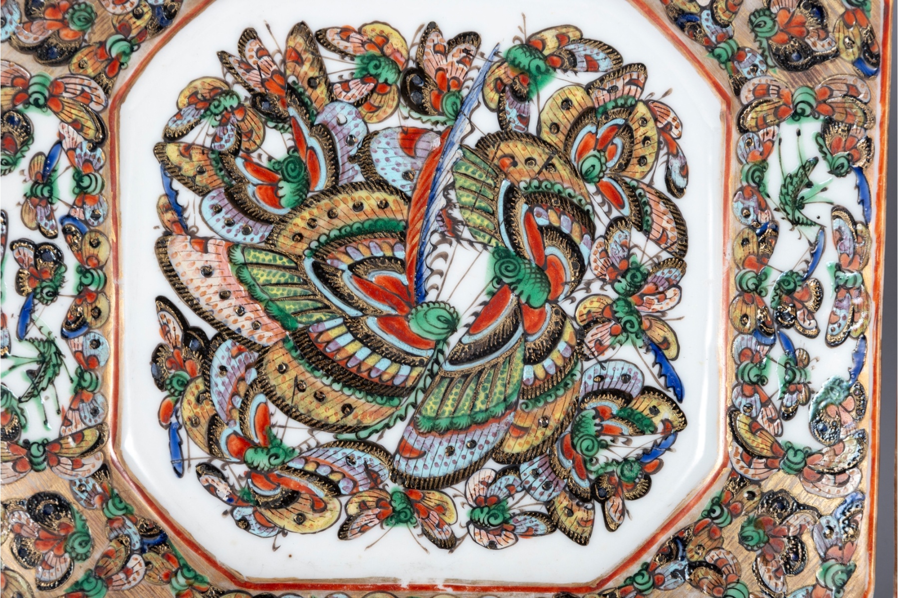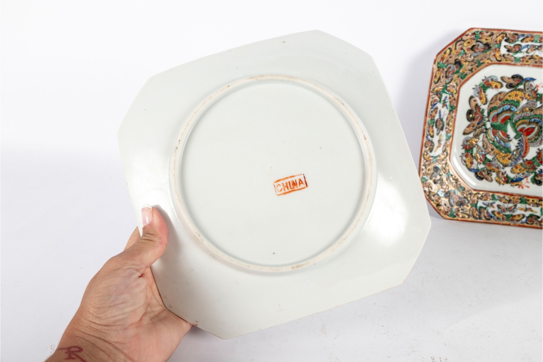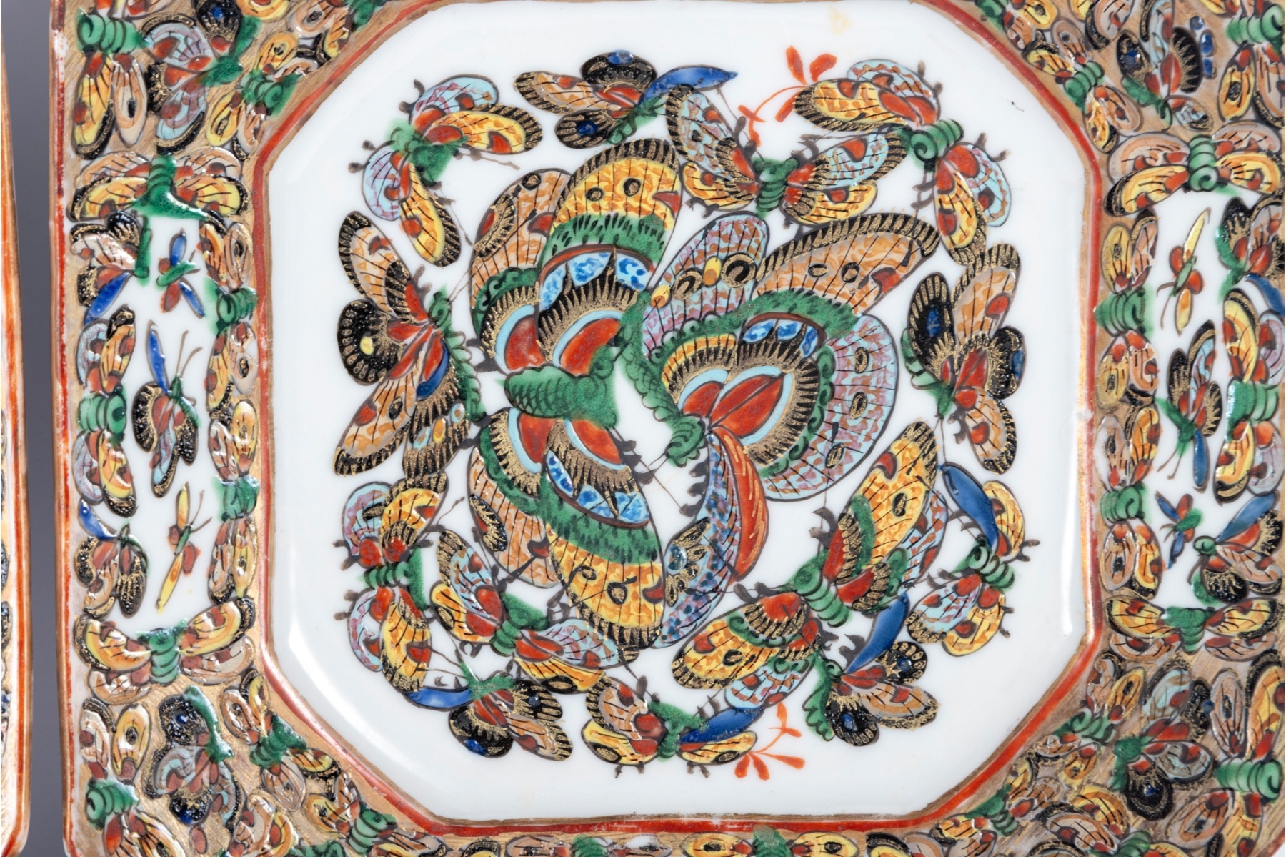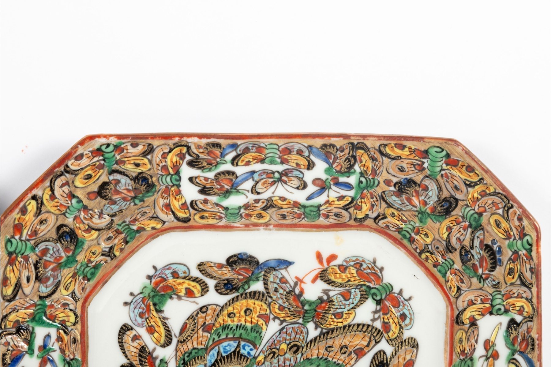 A finely decorated pair of Chinese porcelain octagonal plates, each vividly hand-painted in the traditional Hundred Butterflies motif. The composition features a dense and colorful array of butterflies in flight, surrounded by a richly detailed border of floral scrolls and gilt accents. Marked “CHINA” on the underside, indicating early 20th-century export production.