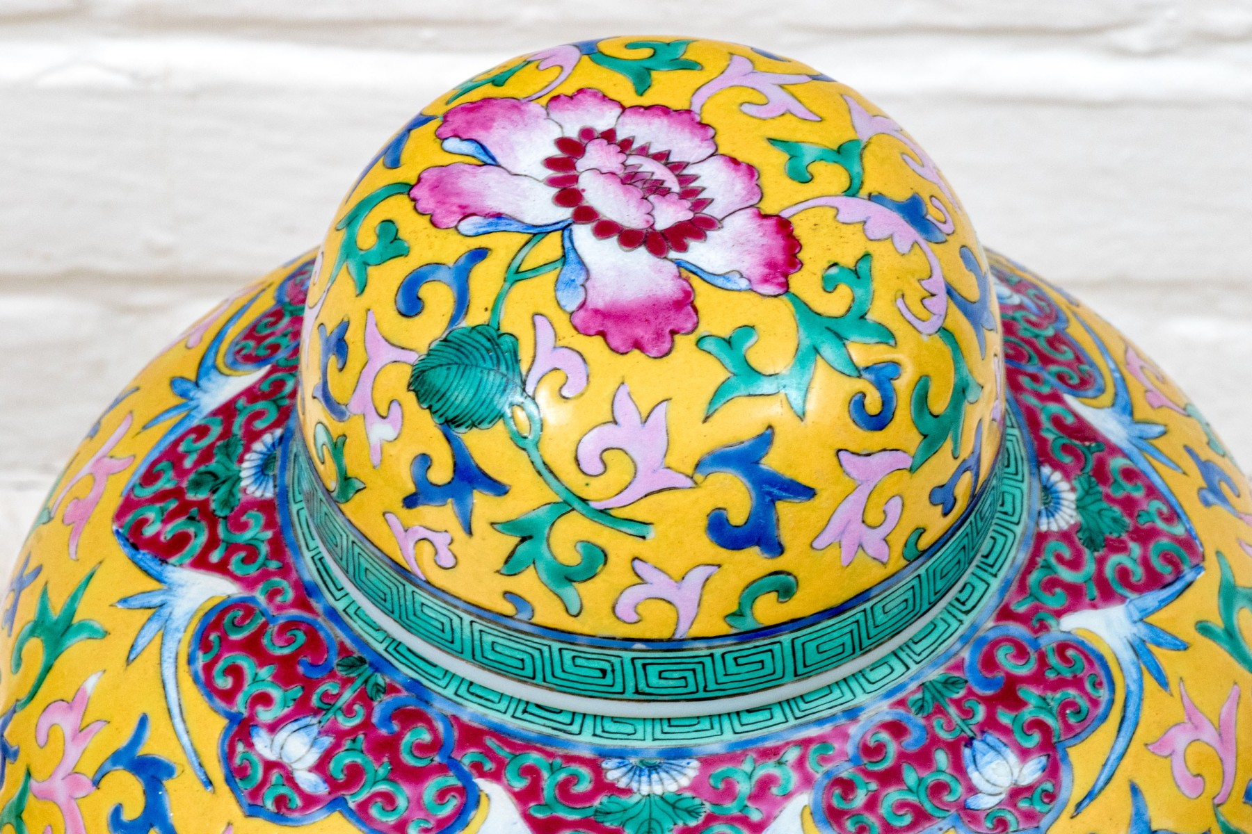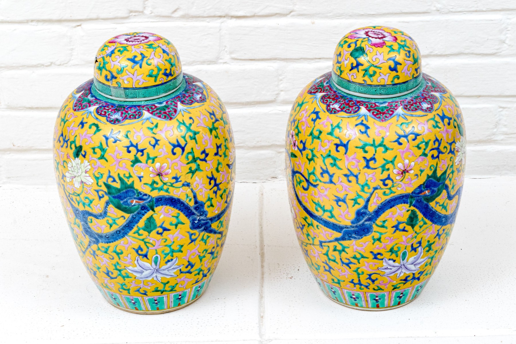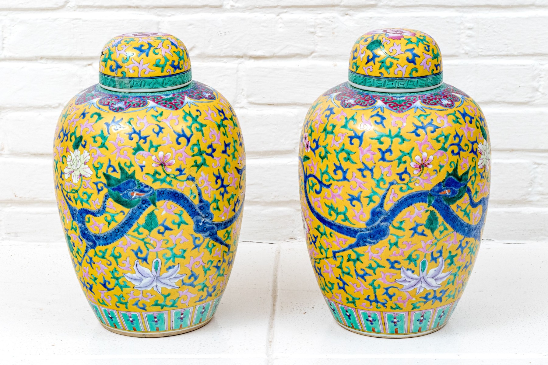 A gorgeous pair of tall Chinese porcelain ginger jars with domed lids over tall, ovoid bodies tapering down the feet. The jars are beautifully decorated with famille rose pink, green, blue, and purple scrolling foliage and flowers around blue long dragons against rich yellow grounds. Finished with lavish teal fret borders and a trim of vibrant scalloped petals at the top, and rectangular medallions at the bottom.